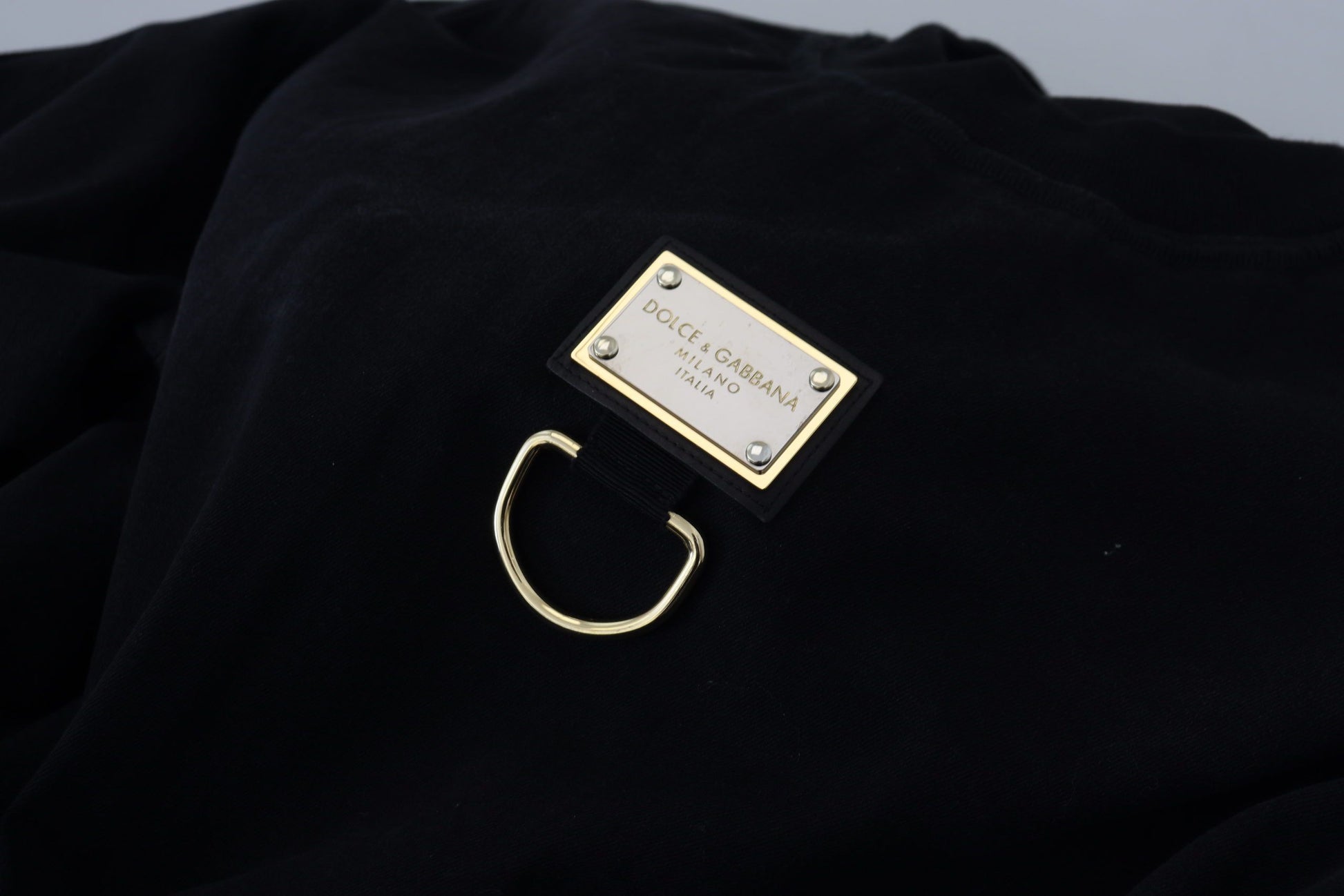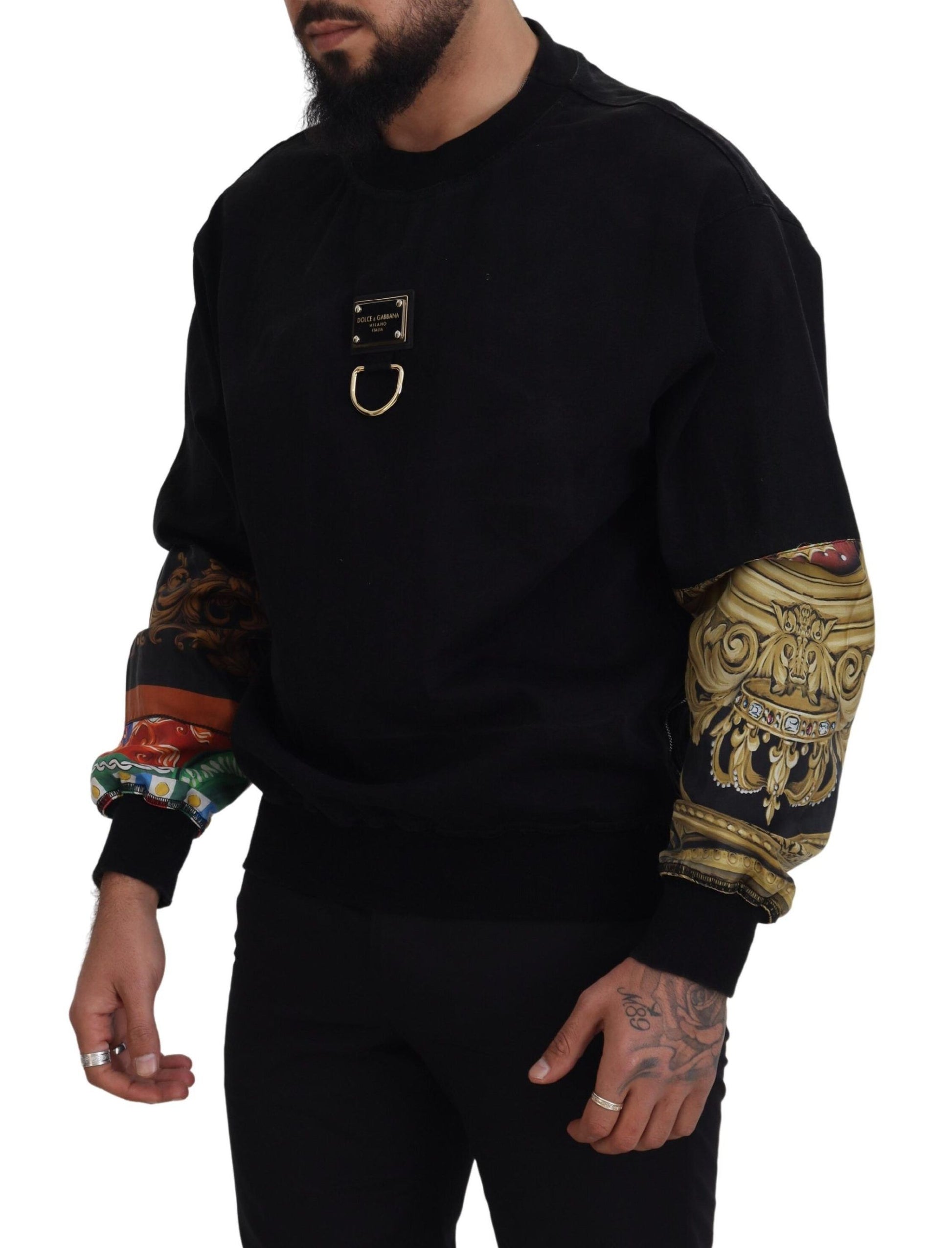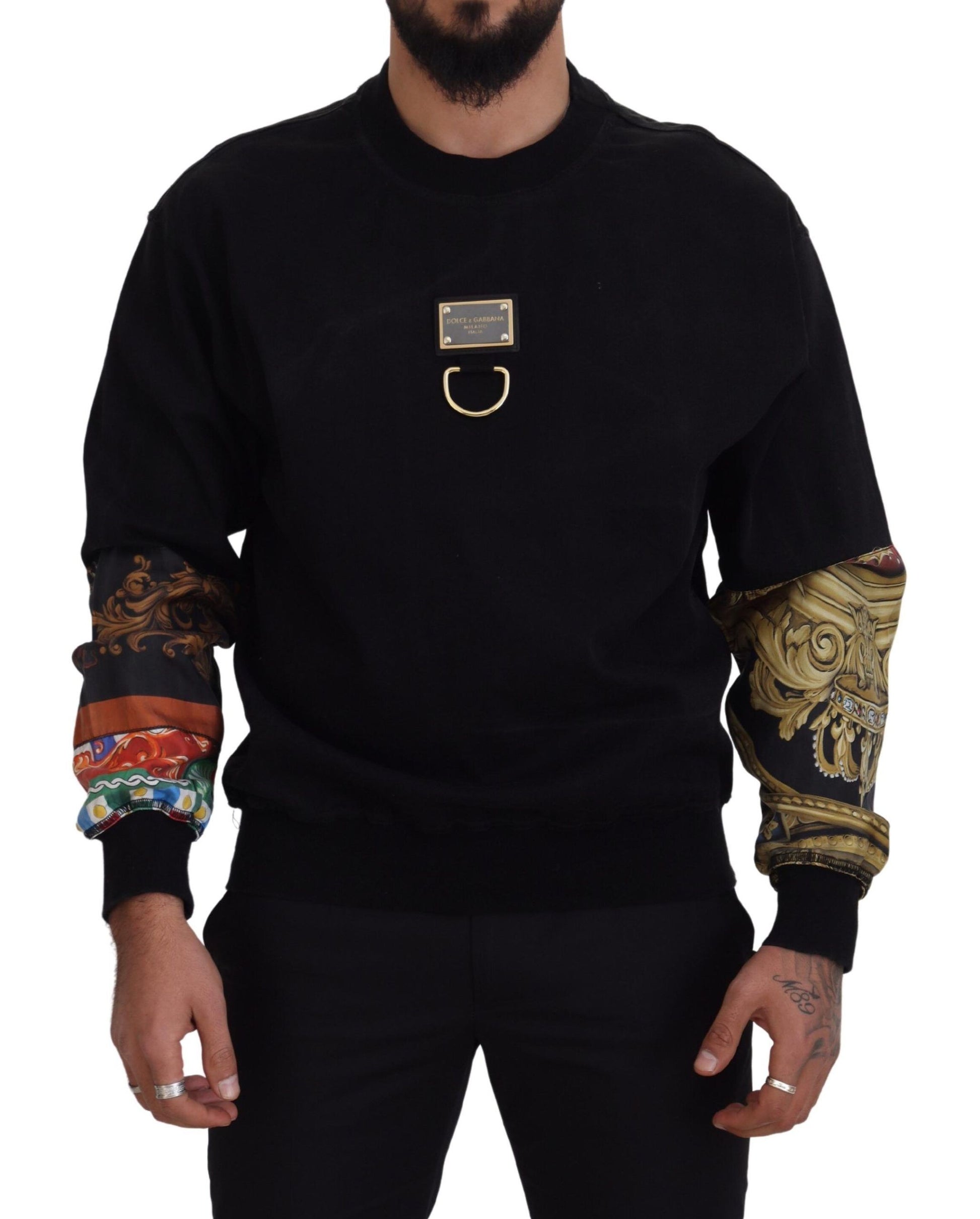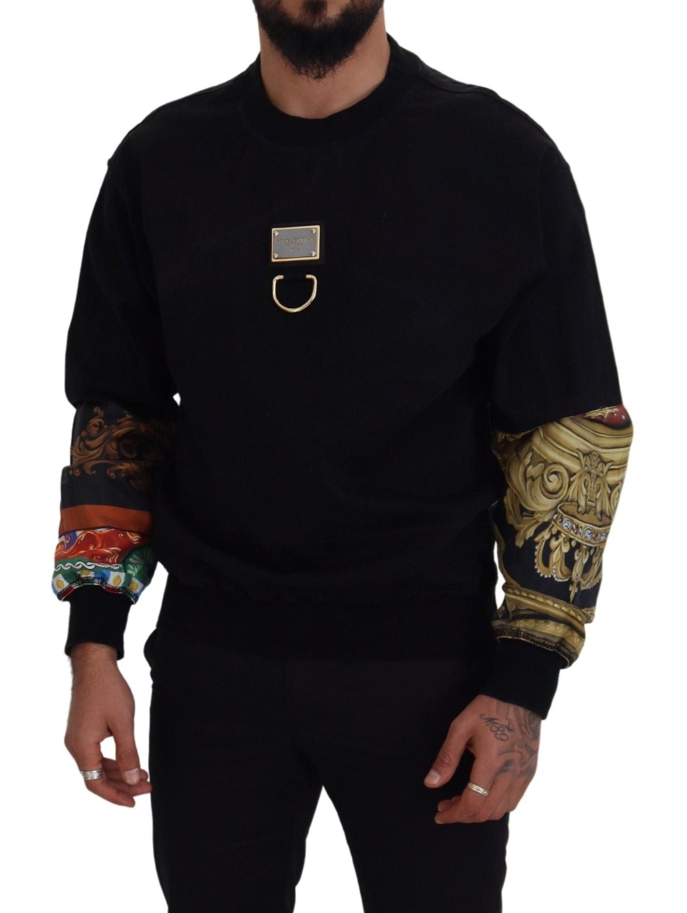 Indulge in the epitome of Italian luxury with this exquisite Dolce & Gabbana pullover sweater. A true representation of classic style with a modern twist, featuring an eye-catching logo plaque centered on a pristine black canvas, complemented by uniquely printed sleeves. Perfect for timeless fashion connoisseurs.