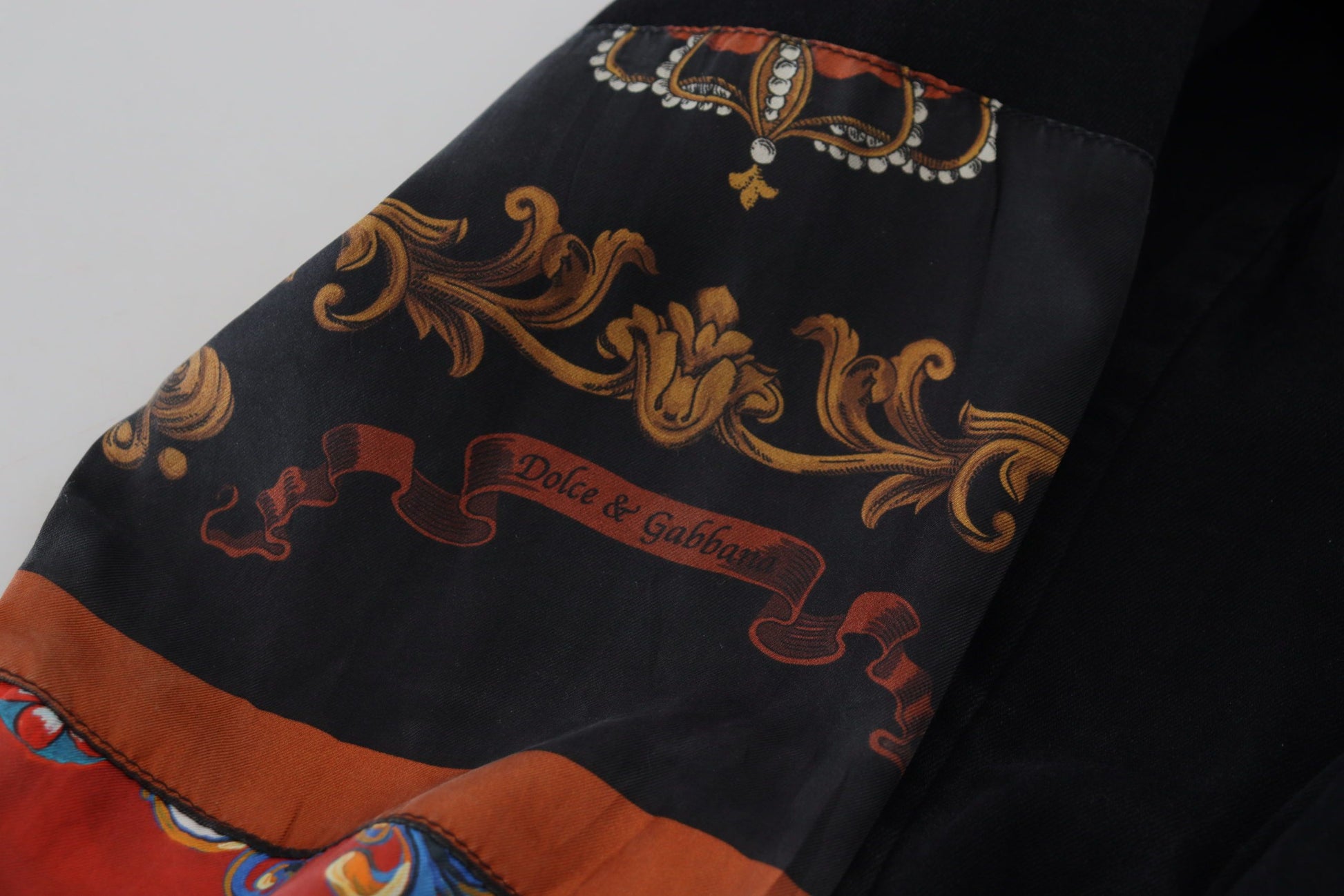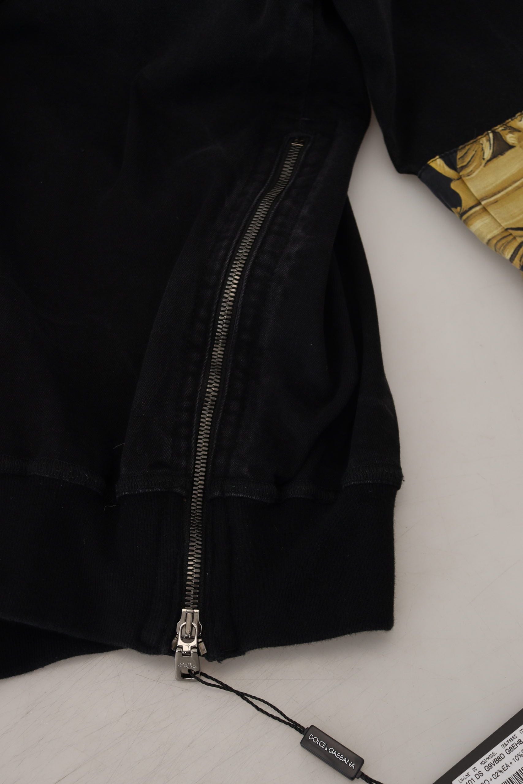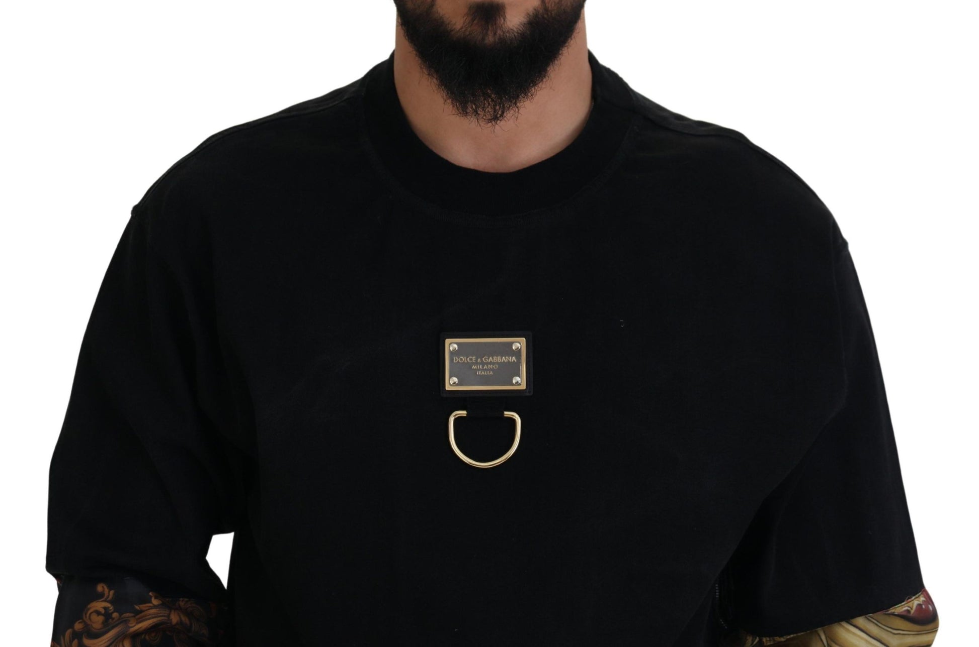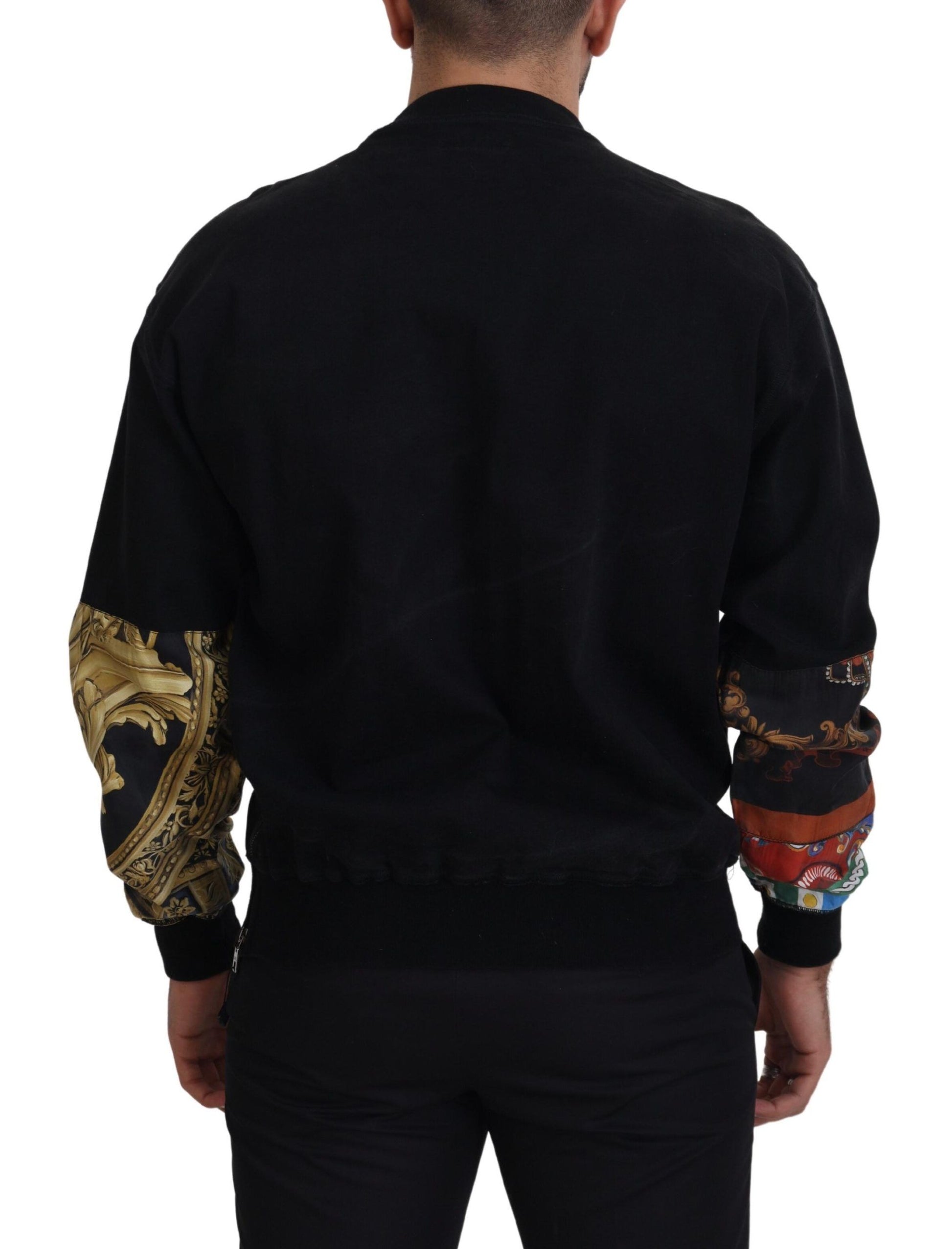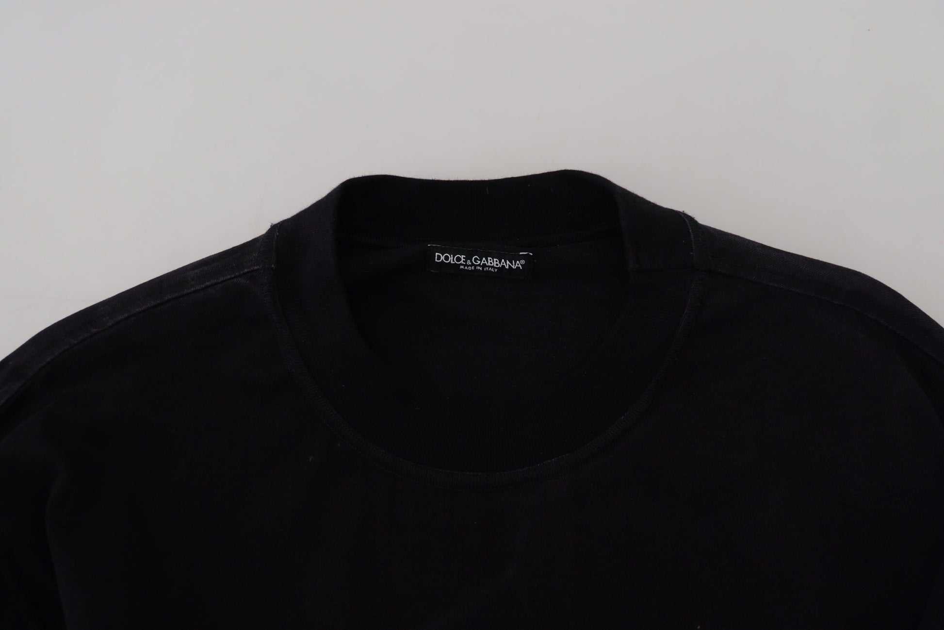 Indulge in the epitome of Italian luxury with this exquisite Dolce & Gabbana pullover sweater. A true representation of classic style with a modern twist, featuring an eye-catching logo plaque centered on a pristine black canvas, complemented by uniquely printed sleeves. Perfect for timeless fashion connoisseurs.