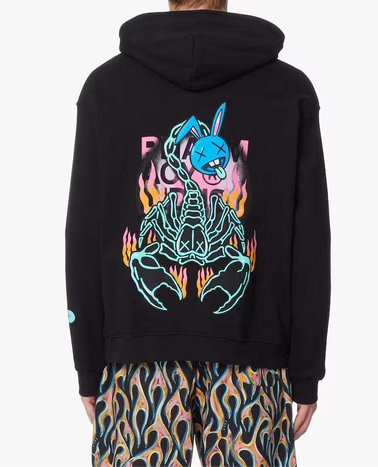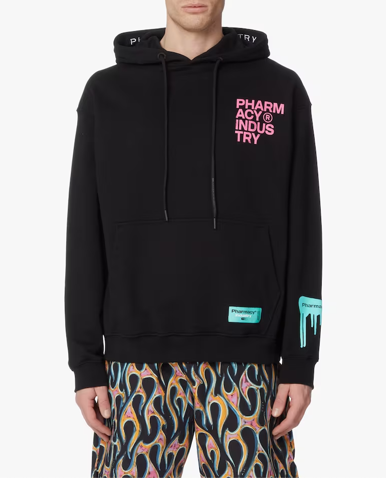 Embrace style and comfort with this sleek black hooded sweatshirt, perfect for the modern man. The design features a snug hood with a drawstring for adjustable fit, and the sweatshirt boasts both a distinct logo print on the chest and a striking graphic print on the back, adding an edge to your casual wardrobe. Crafted in Italy, it assures quality and fashion-forward appeal.