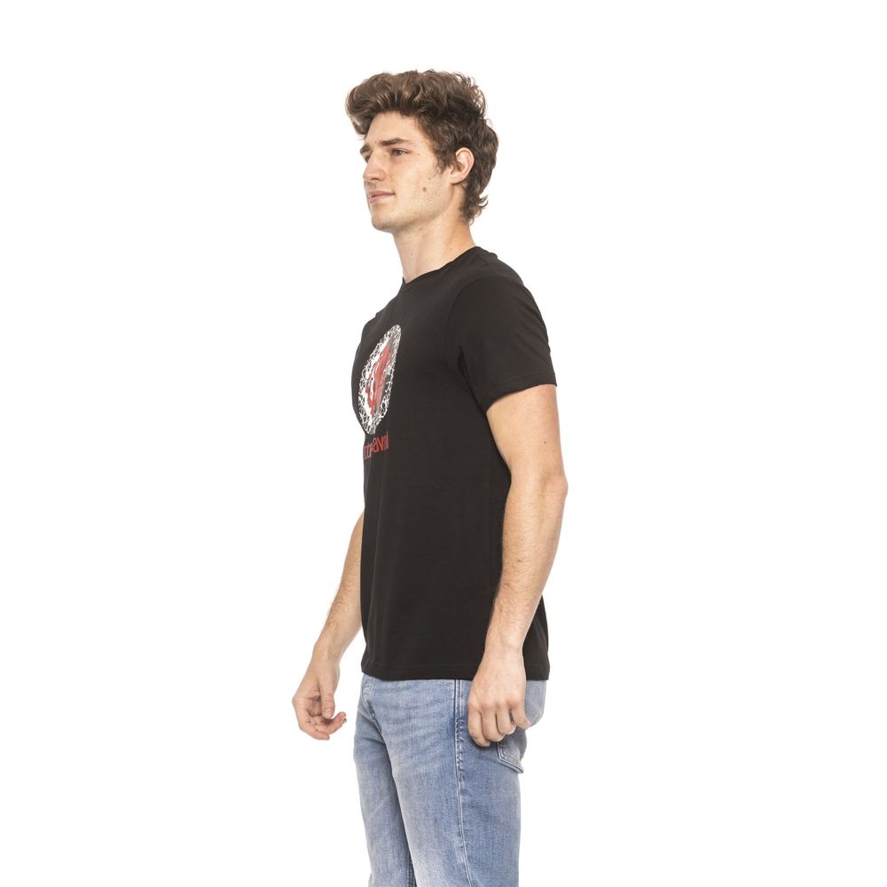 Indulge in the effortless style of a sleek, black t-shirt from Roberto Cavalli Beachwear, featuring a striking front logo print that adds a touch of luxury to any casual ensemble. Crafted from 100% soft cotton, this tee marries comfort with high-end fashion.