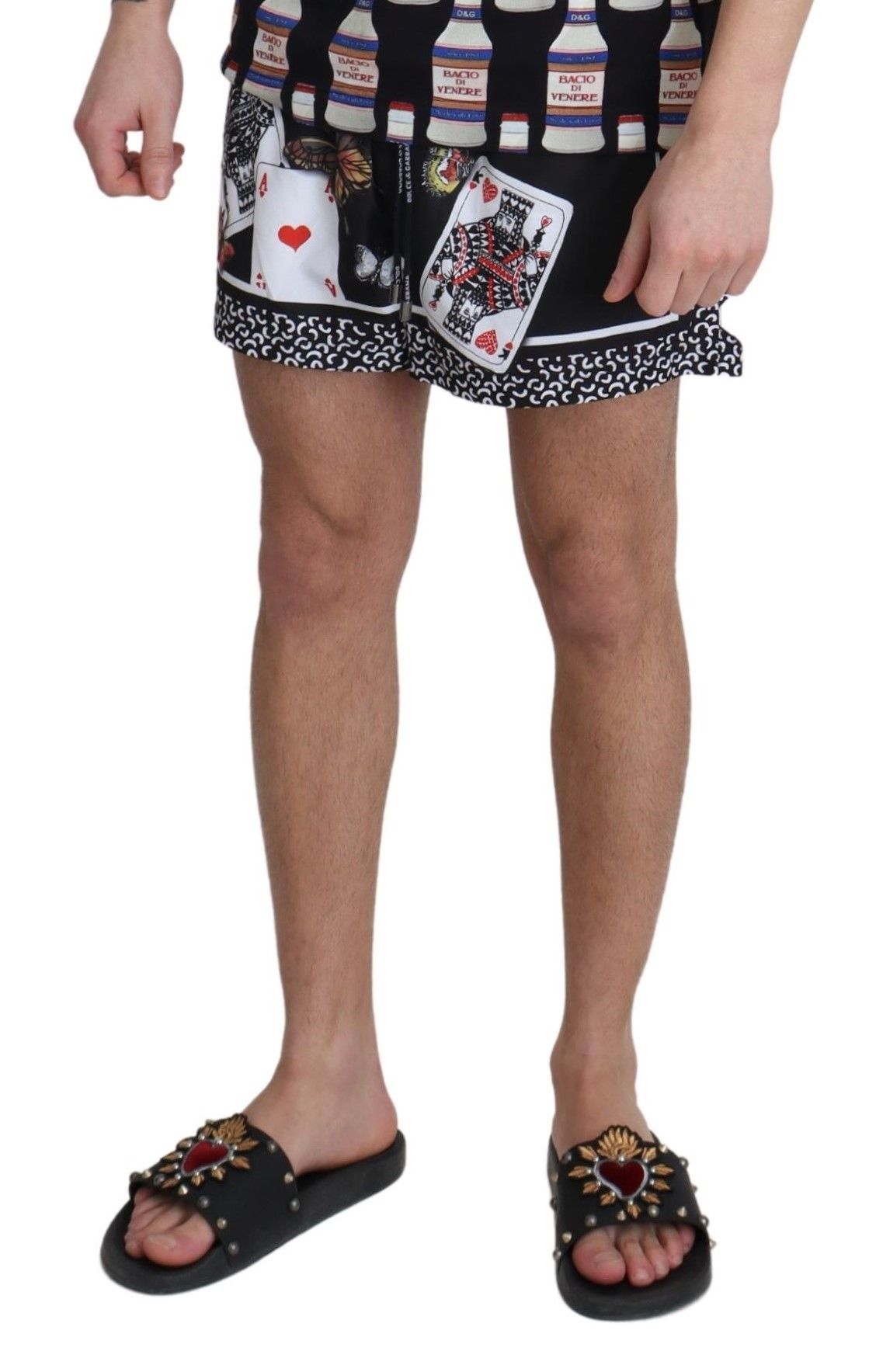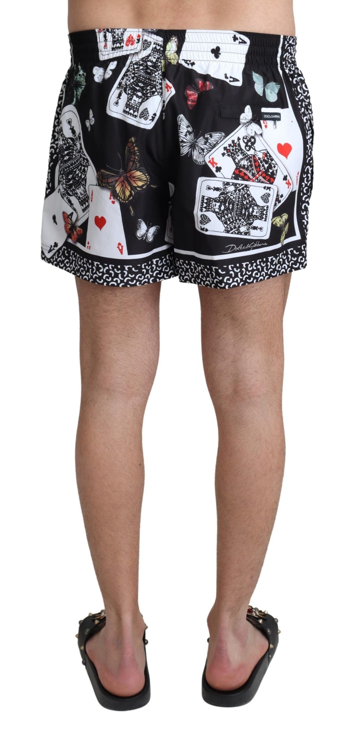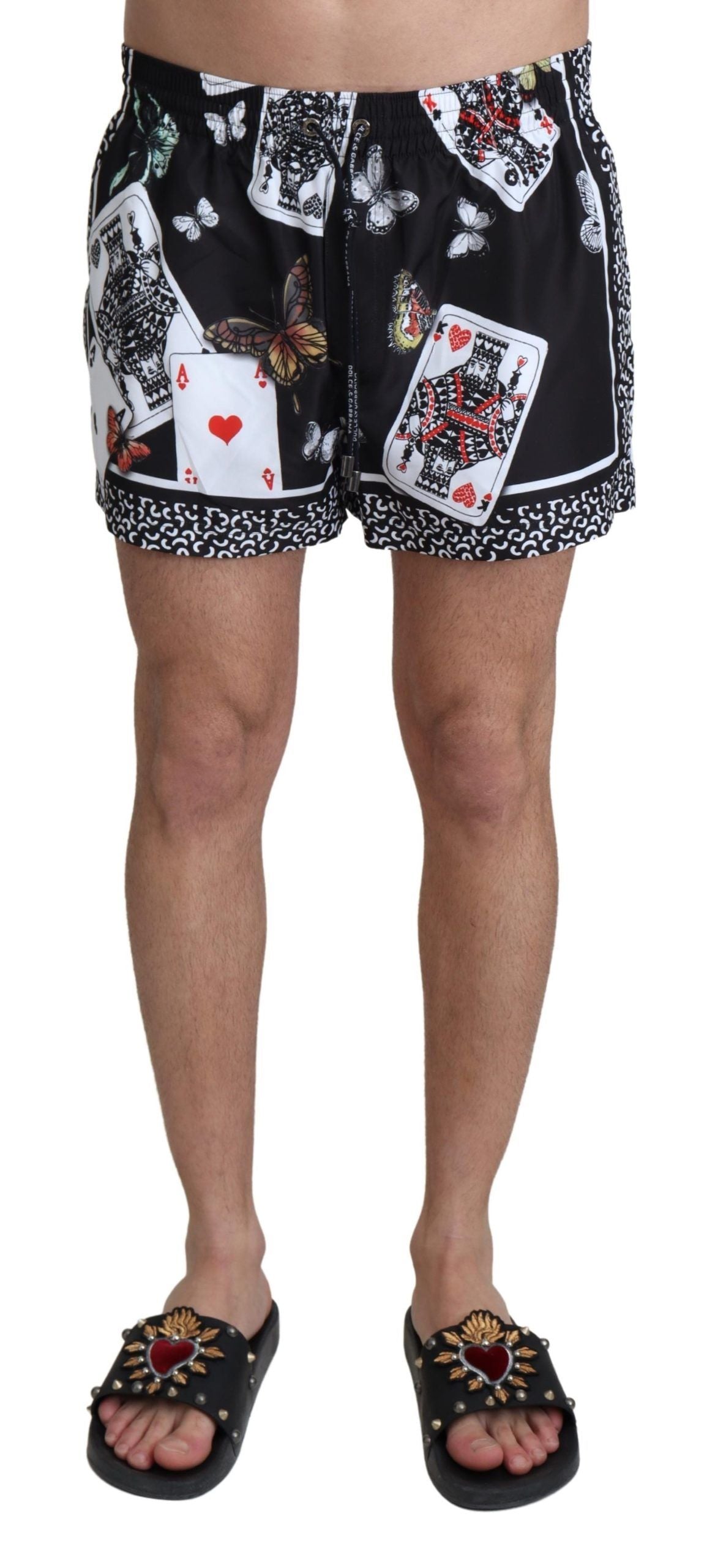 Elegant Black Swim Trunks with Unique Deck Cards Print