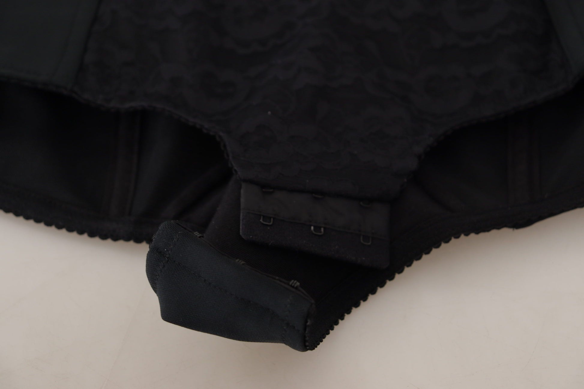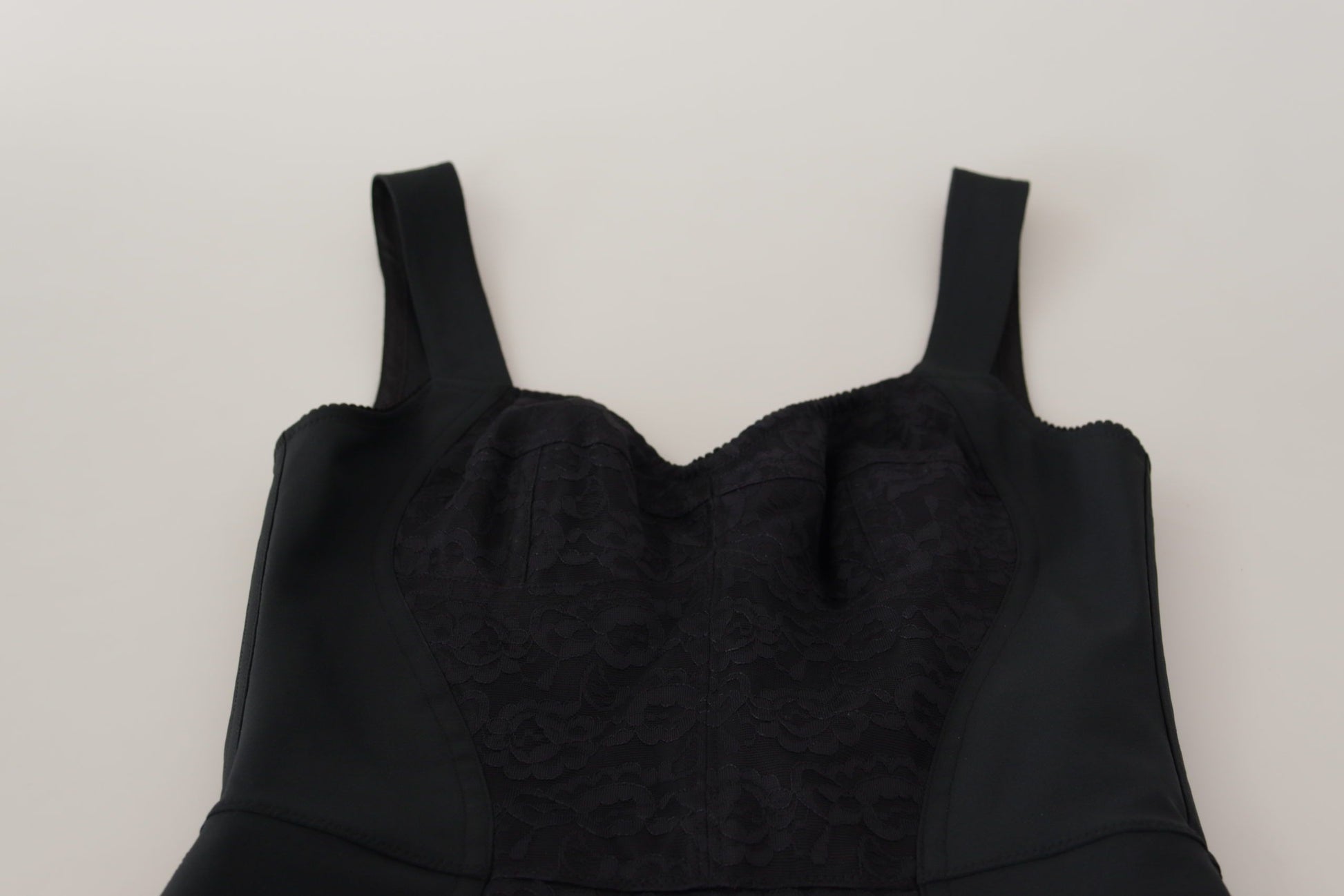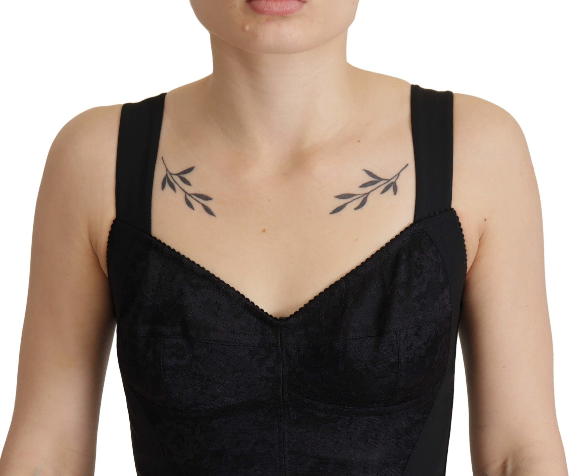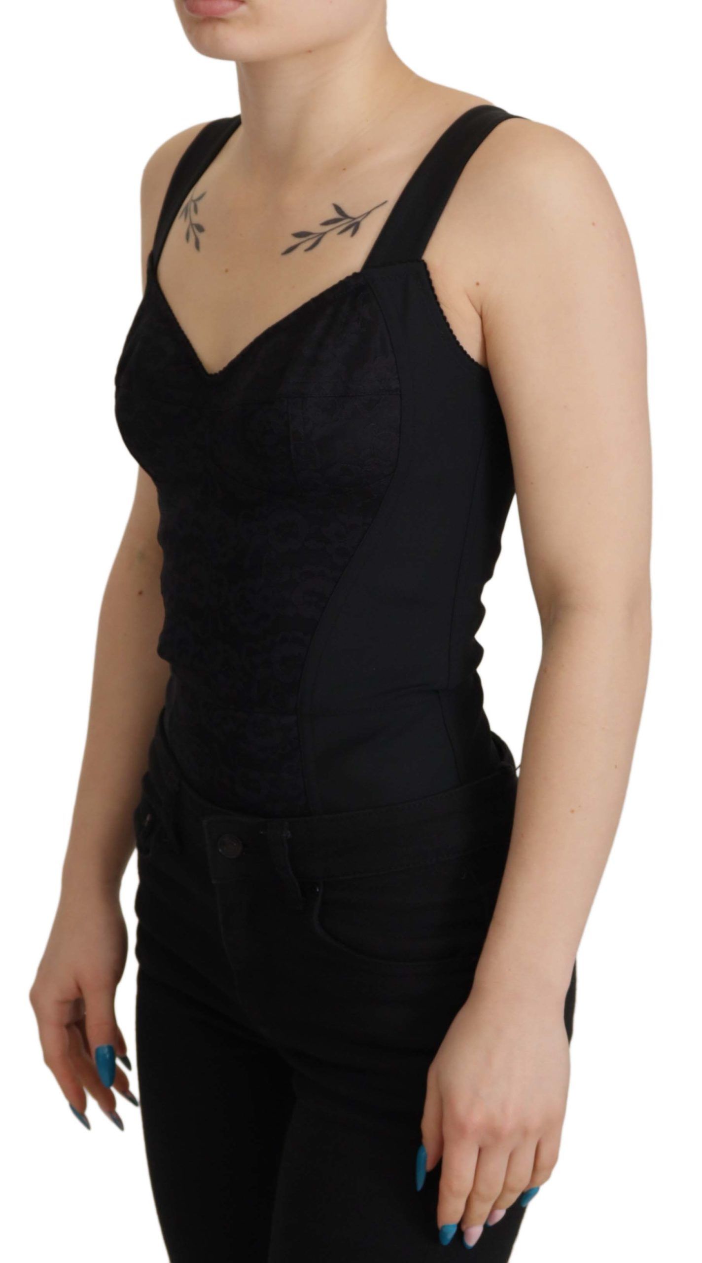 Embrace elegance with this stunning sleeveless black bodysuit from Dolce & Gabbana. Crafted with precision in Italy, it flaunts a sophisticated corset-style silhouette, adorned with openwork floral lace for a touch of romance. The high-quality nylon blend fabric provides a comfortable stretch and a flattering, slightly corrective fit. Detailed with a convenient zipper at the back and the iconic logo, this bodysuit exemplifies luxury and exquisite craftsmanship.