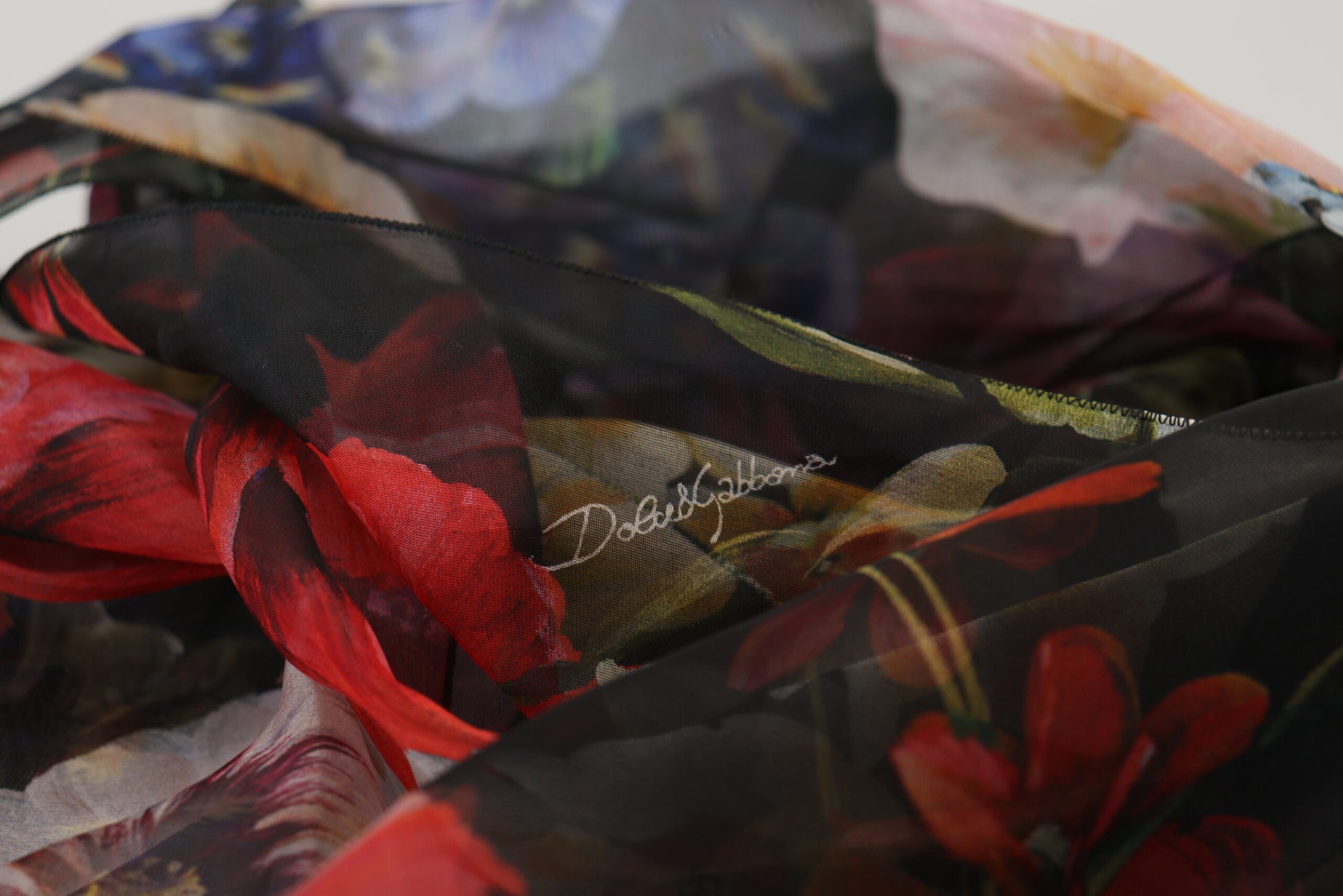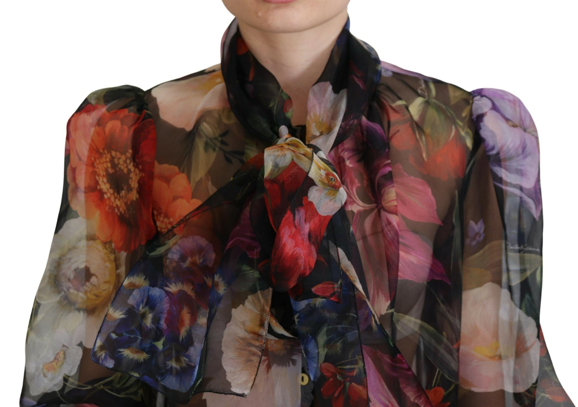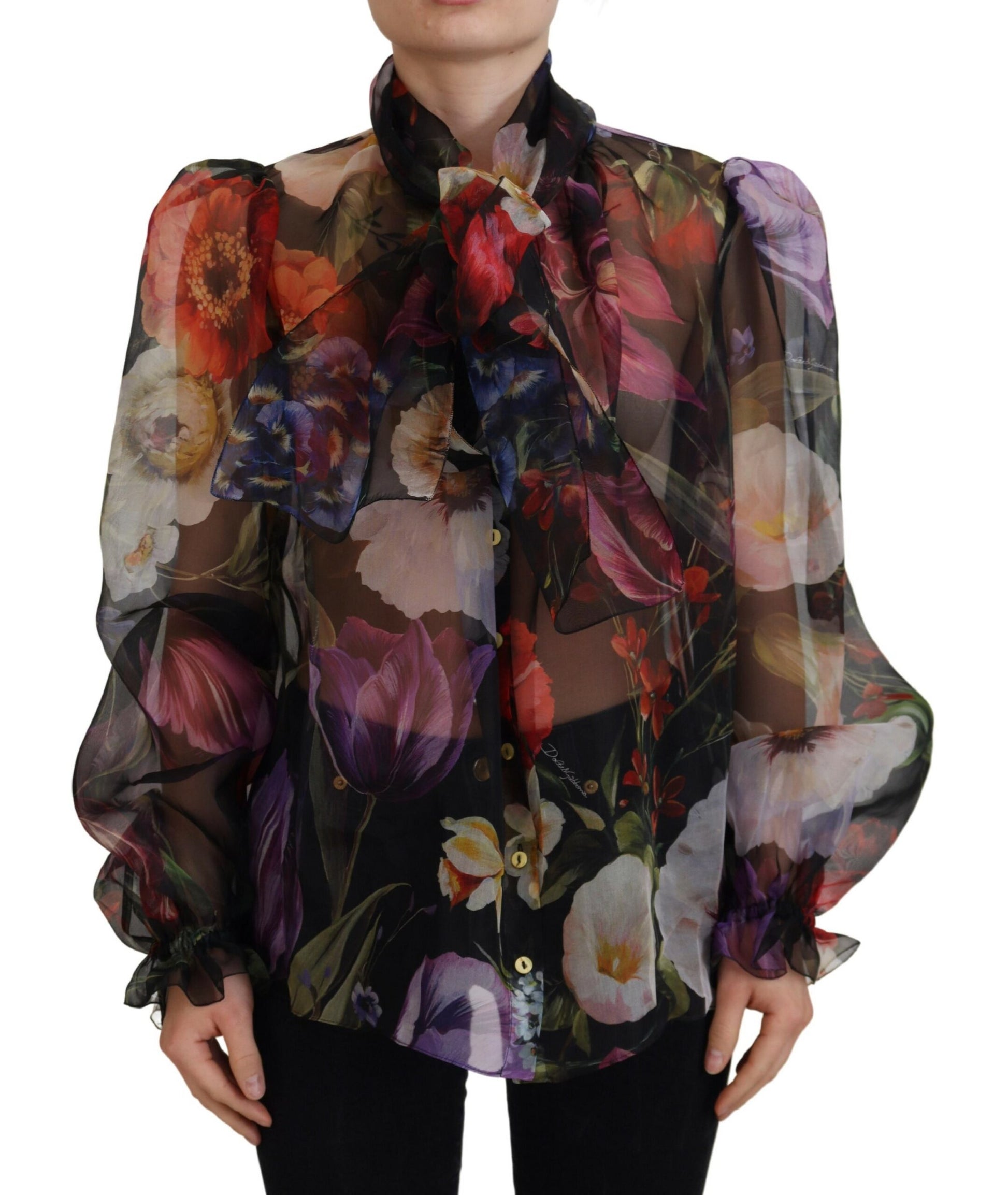 Indulge in the essence of sophistication with this stunning Dolce & Gabbana women’s floral long sleeves top. Crafted from sumptuous 100% silk, this top exudes luxury with its intricate multicolored floral print on a classic black backdrop. Designed to make a statement, it features a graceful scarf neck tie and a chic front button closure. This gorgeous blouse embodies the Italian craftsmanship and logo detail that signify exclusivity and style. Perfect for any occasion that calls for an air of elegance.