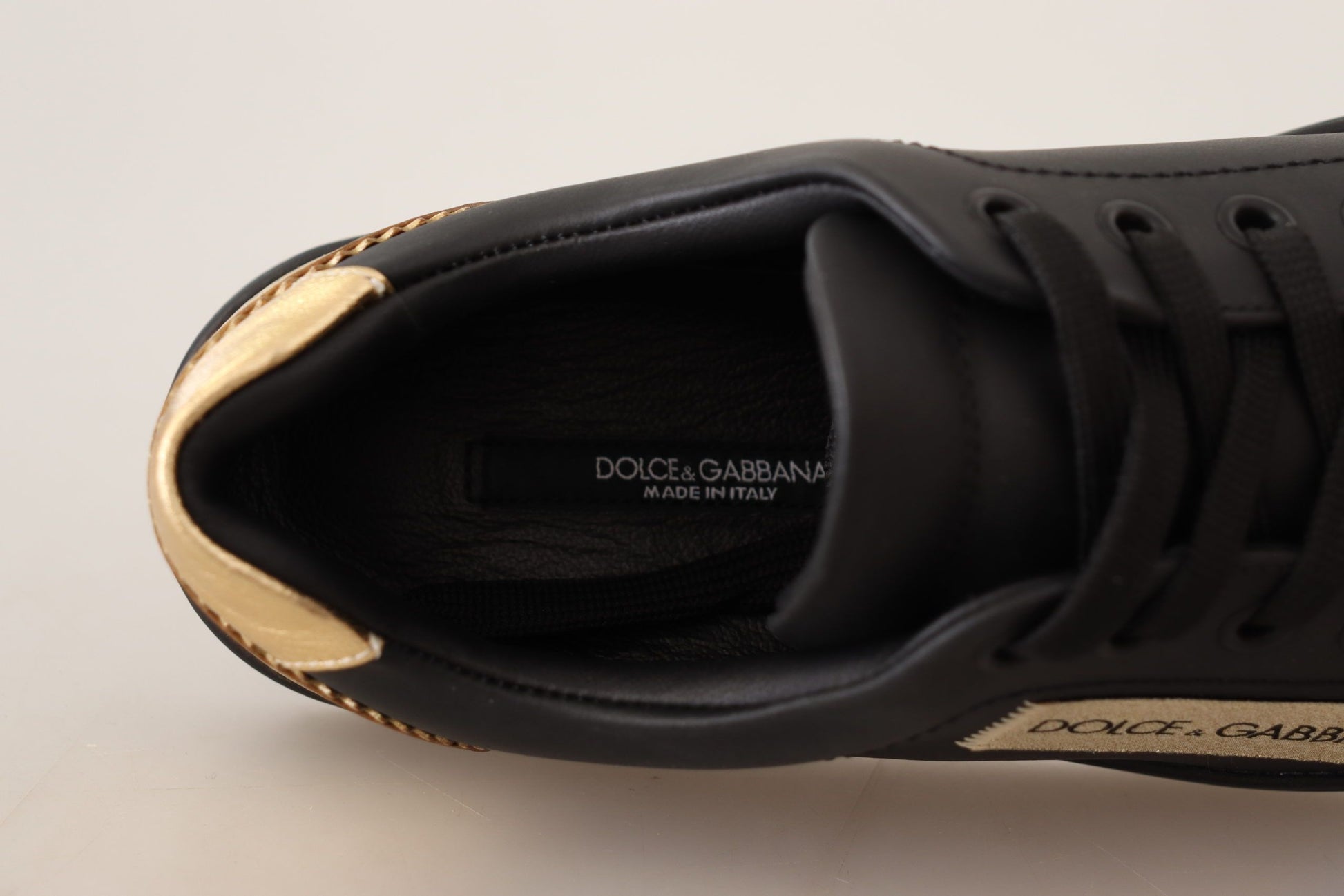 Step into luxury with these statement-making low-top sneakers by Dolce & Gabbana. Crafted with high craftsmanship in Italy, these sneakers are a perfect blend of style and comfort, featuring a sleek black and gold color scheme that adds a touch of elegance to any outfit. The durable rubber sole ensures lasting wear for all your urban adventures. With the iconic logo detail, these shoes are guaranteed to turn heads wherever you go. Very exclusive, these sneakers epitomize the brand’s commitment to luxury.