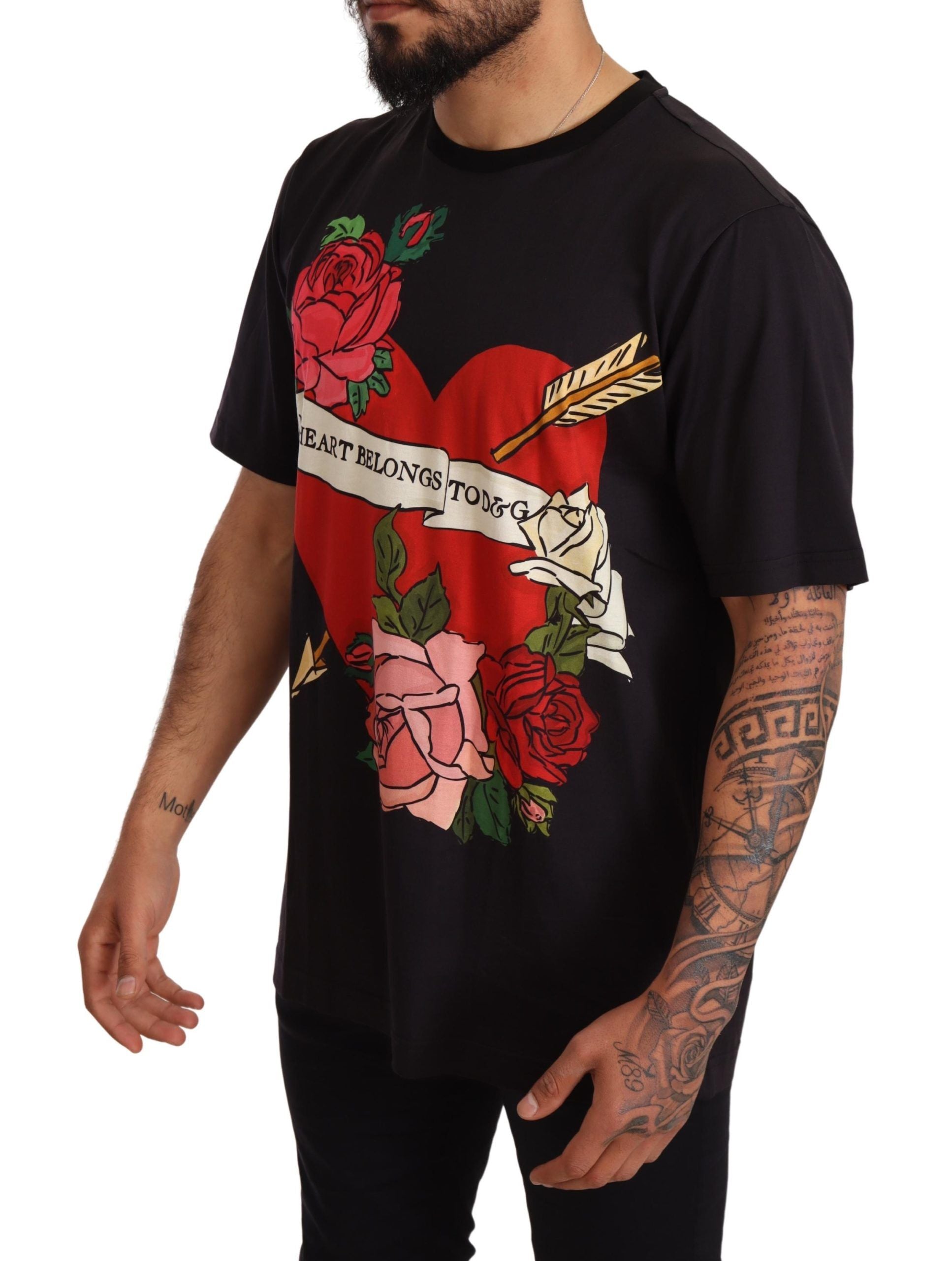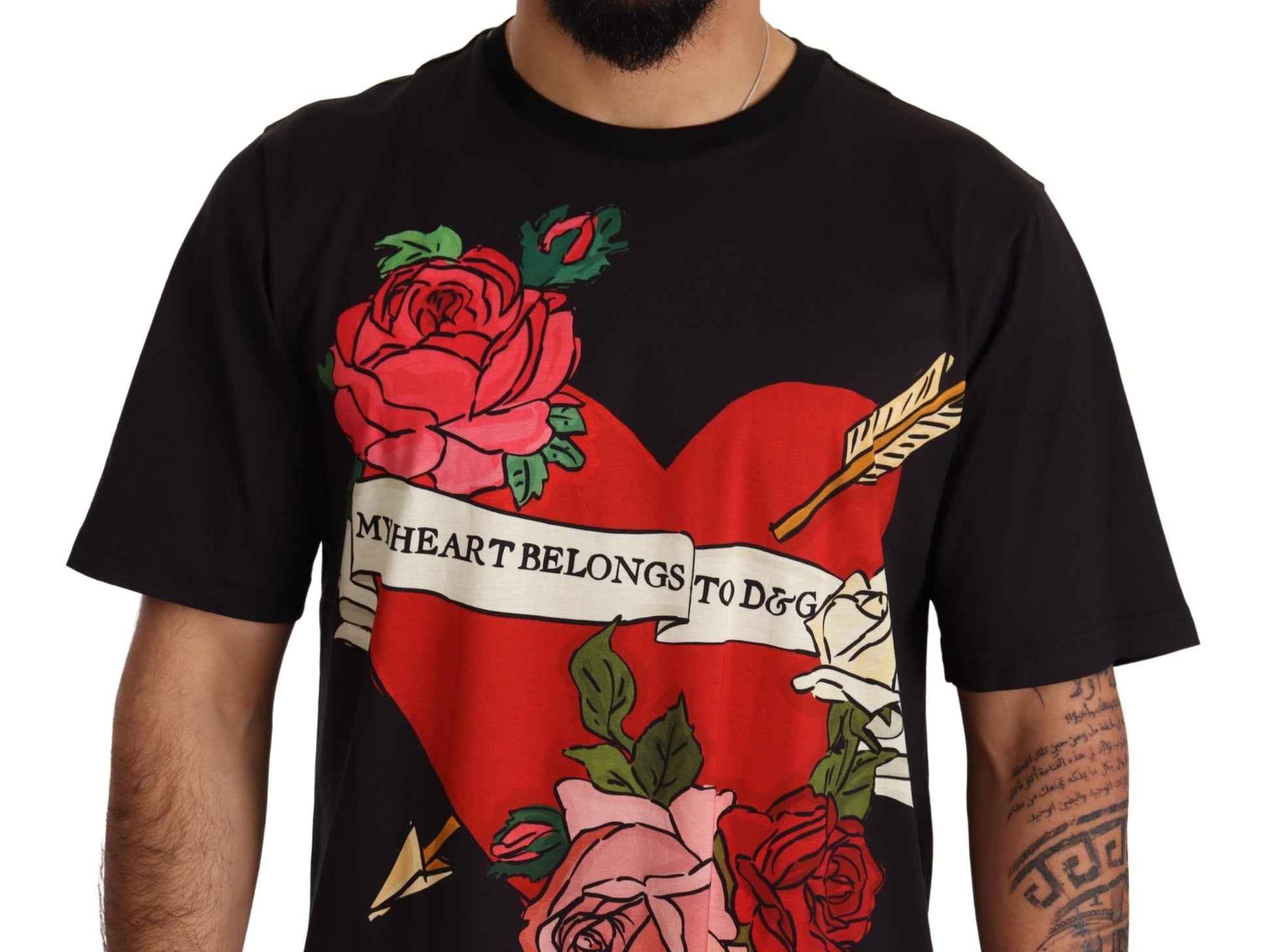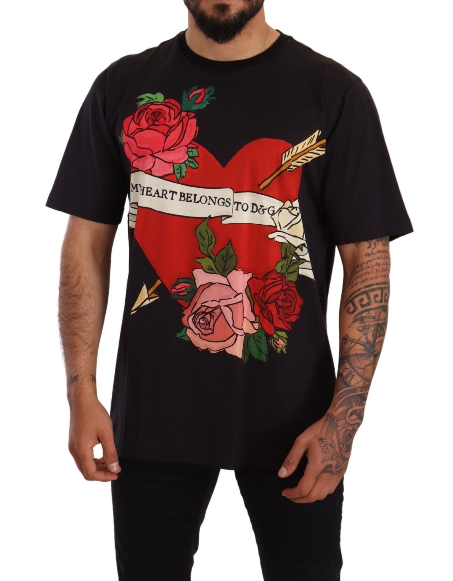 Step out with a touch of Italian elegance and bold style with this stunning T-shirt from Dolce & Gabbana. Crafted with premium cotton and featuring an elaborate heart roses print, this T-shirt is a true embodiment of contemporary luxury. The black backdrop allows the vibrant print to stand out, making for an eye-catching addition to your casual wardrobe. Its regular fit and ribbed crew neckline ensure comfort without compromising on style. Perfect for fashion-forward individuals seeking to make a statement.