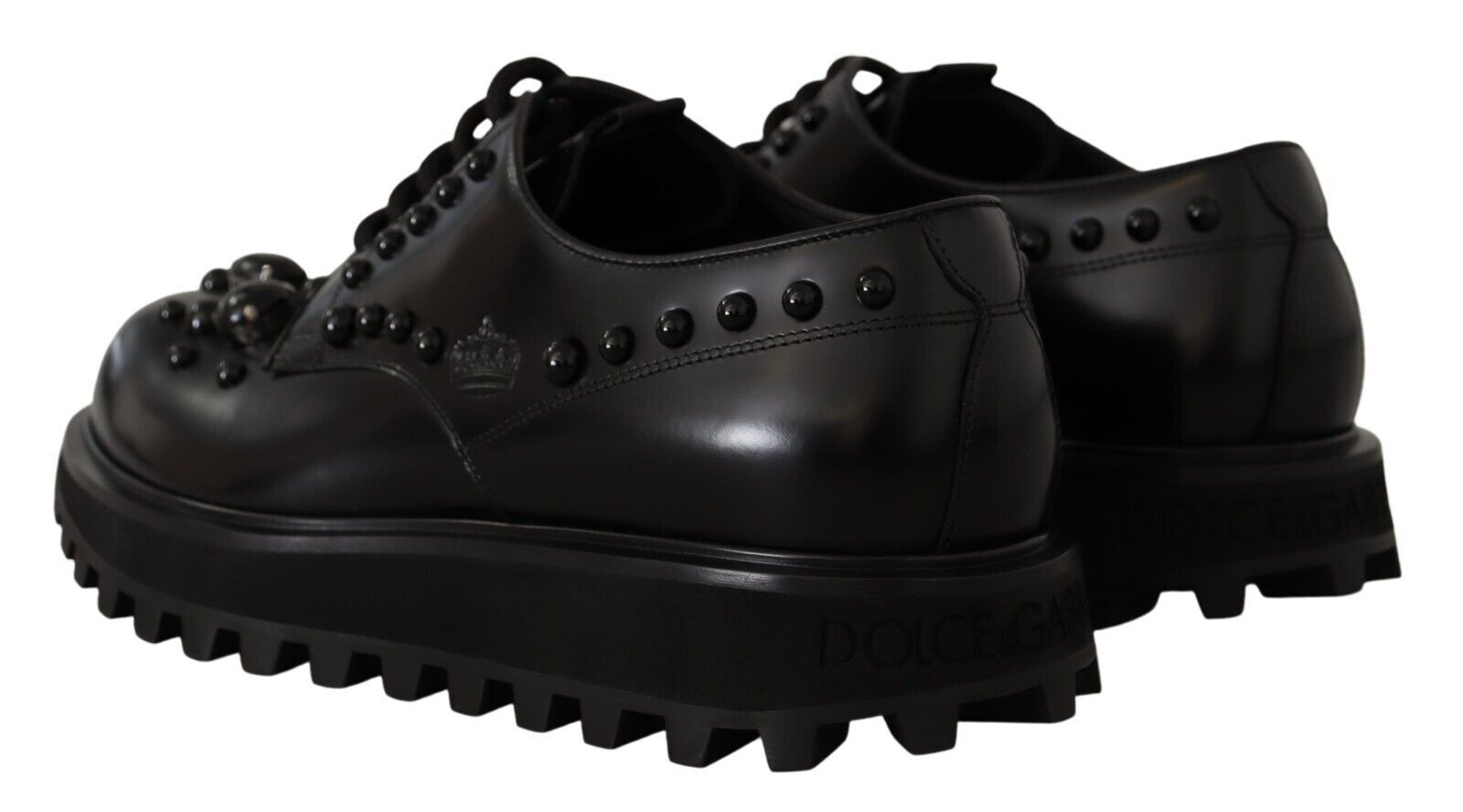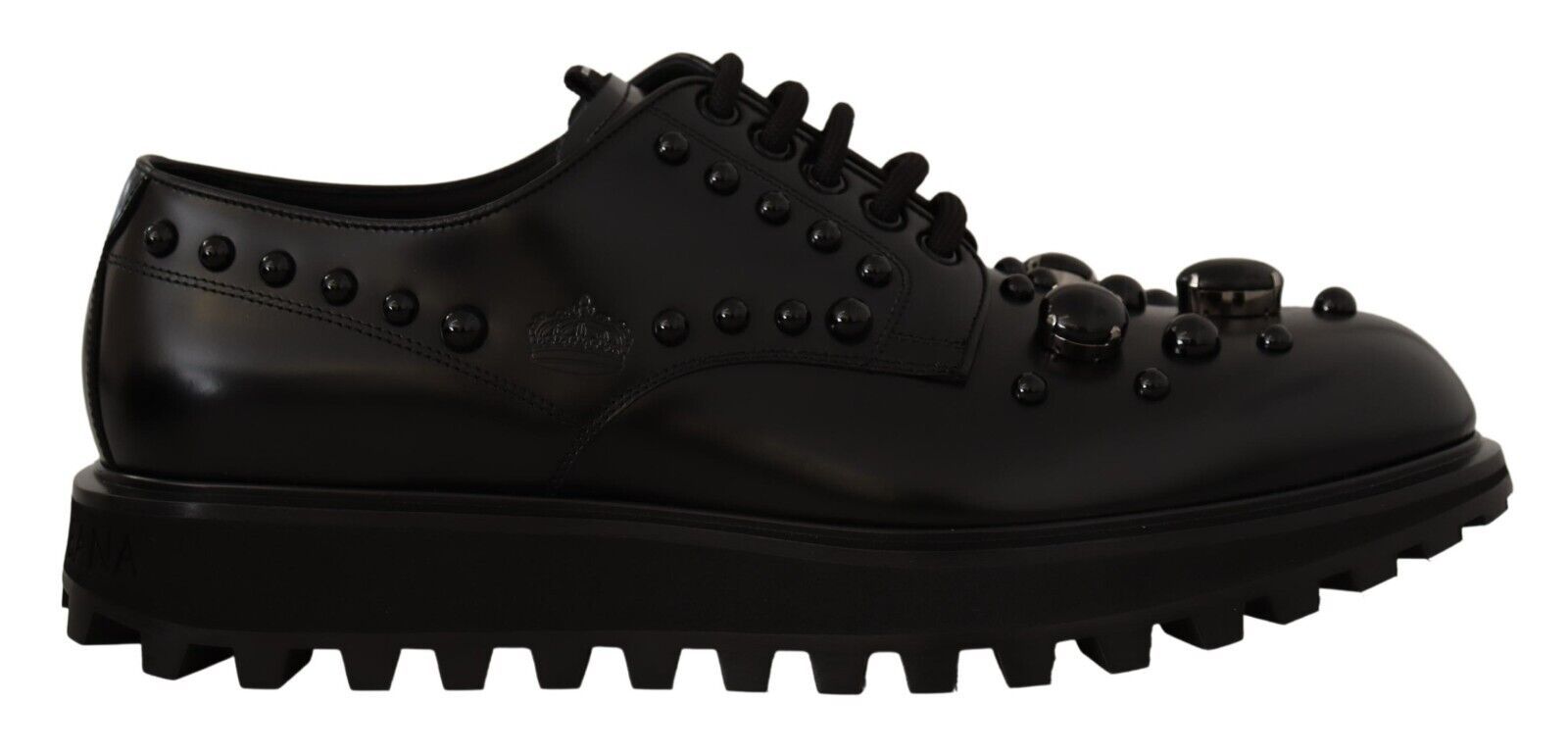 Step into style with these Gorgeous new, with tags, formal Derby shoes, enriched with sparkling black crystals for a touch of glamour. Crafted from premium leather, these shoes feature a comfortable rubber sole and exhibit the exquisite craftsmanship you expect from the esteemed house of Dolce & Gabbana. Made in Italy, they are the epitome of luxury footwear.