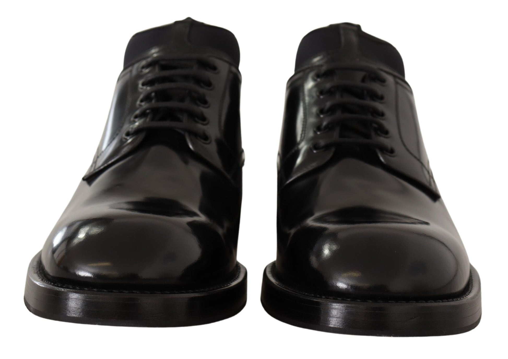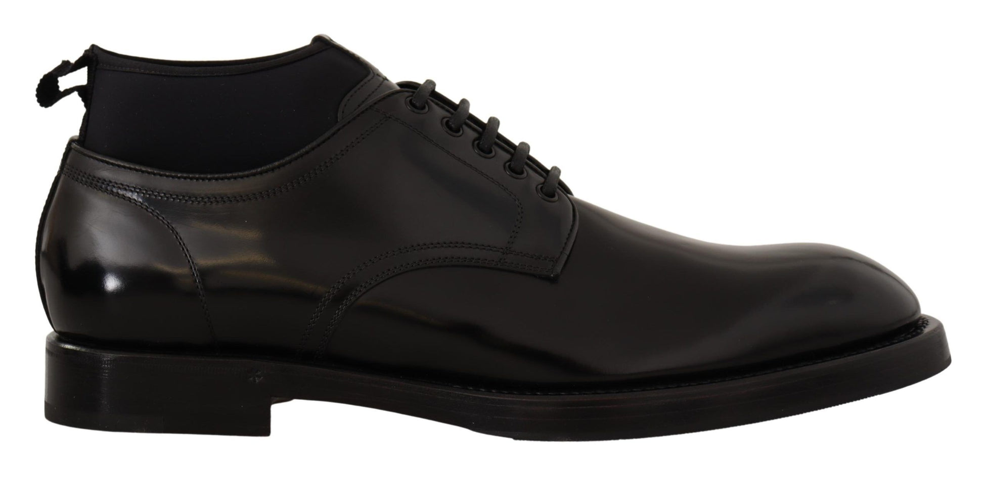 Step into elegance with these striking black lace-up dress shoes, crafted from the finest leather and neoprene materials. With a sleek design and the unmistakable touch of high craftsmanship, these shoes are sure to add a touch of sophistication to any formal outfit. The sturdy rubber outer sole provides lasting durability, while the subtle logo detail adds an exclusive touch typical of the renowned Dolce & Gabbana brand. Made in Italy, these shoes are a testament to luxury and style.