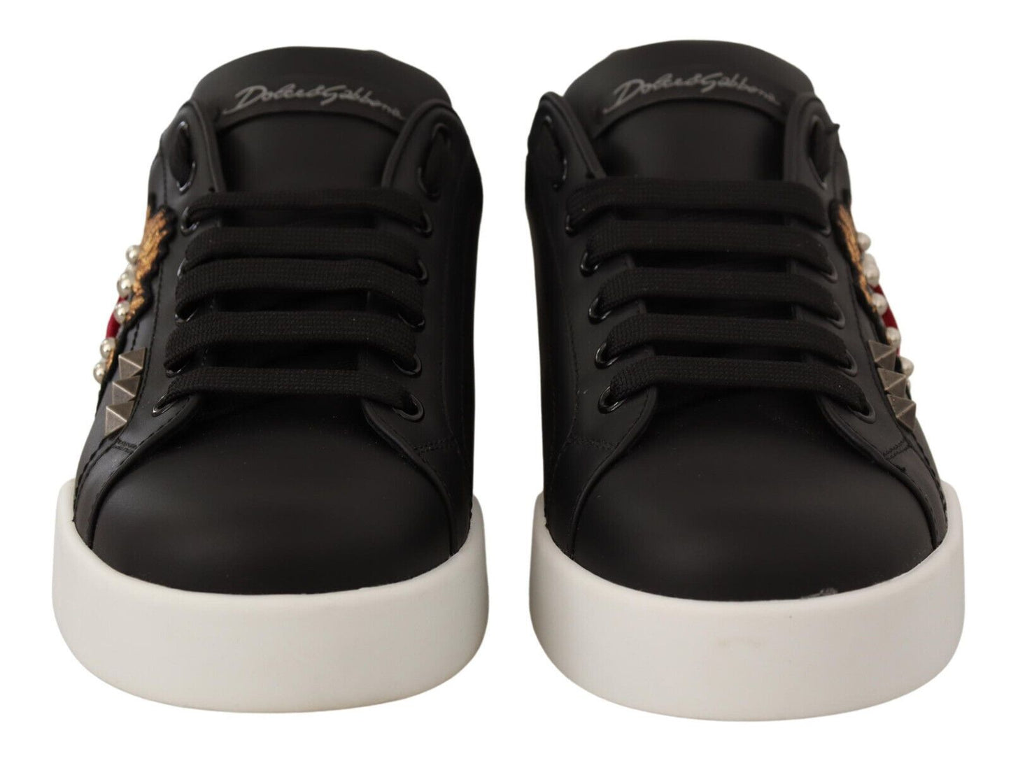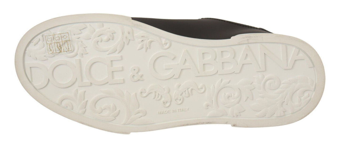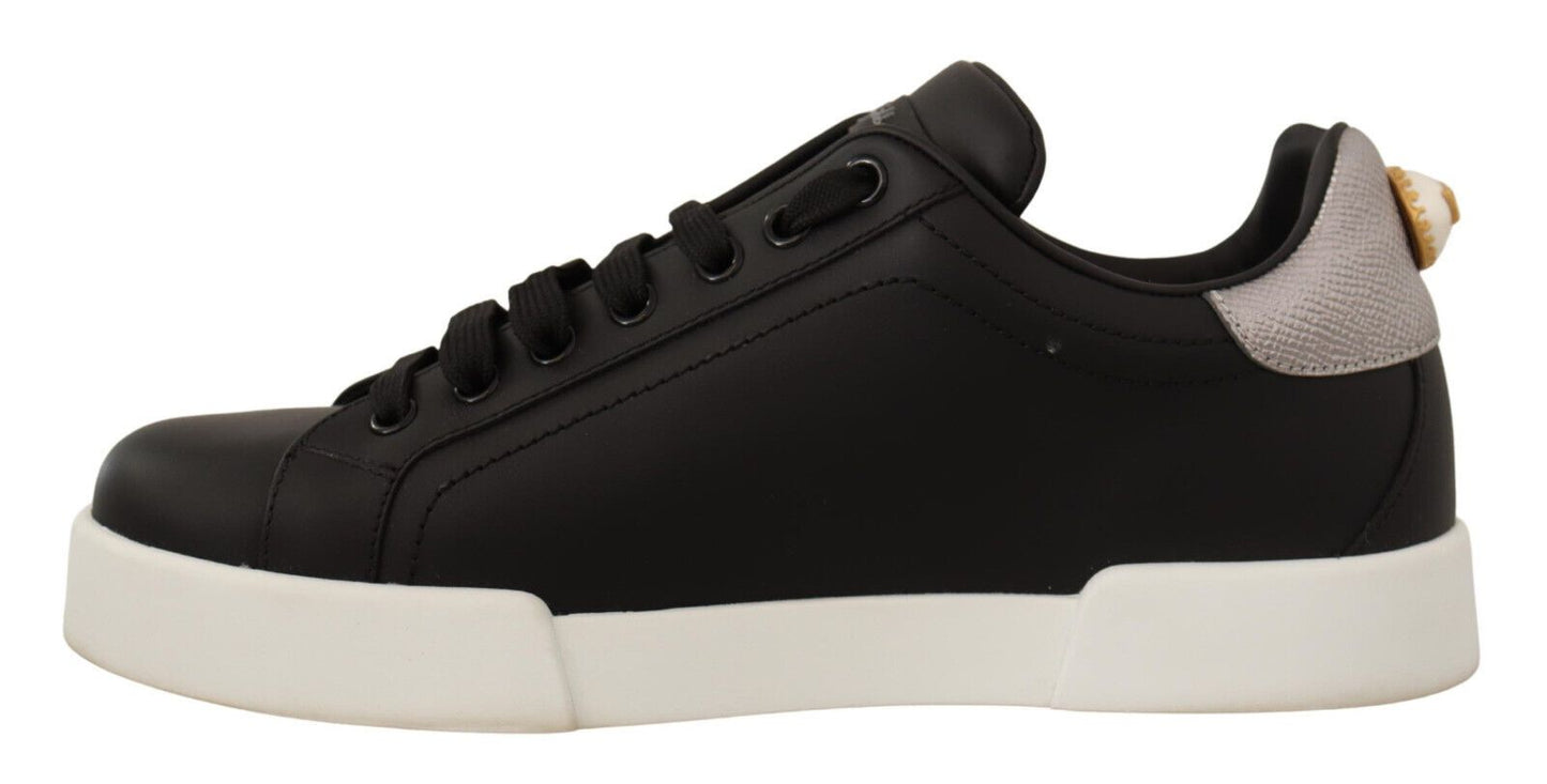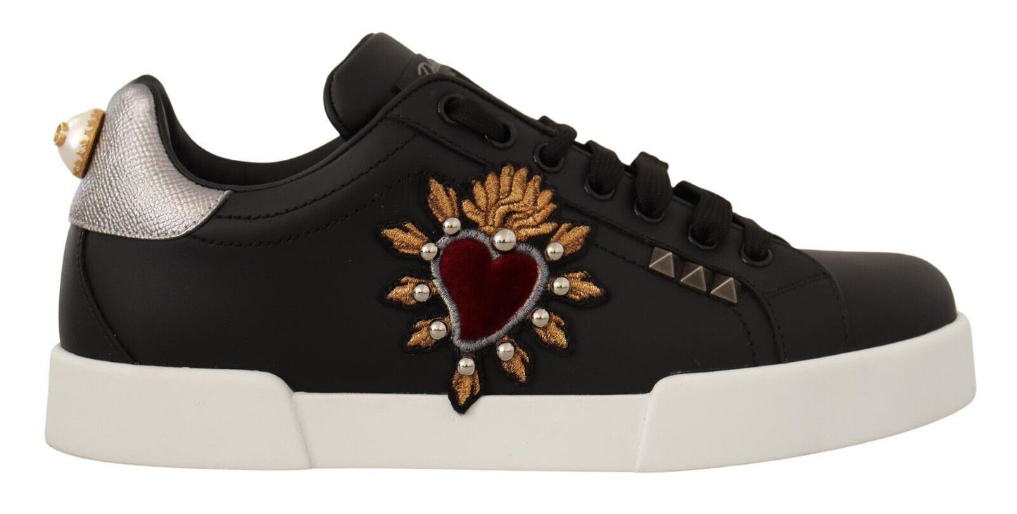 Step into luxury with these striking new sneakers by Dolce & Gabbana. Crafted from premium leather, these casual sneakers capture attention with their bold black color and vibrant multicolor heart motive. The perfect blend of style and comfort, these shoes feature a robust rubber sole and the iconic logo, delivering not just on looks but on durability as well. Made with exceptional Italian craftsmanship, these sneakers are a statement piece for any fashion-savvy man.