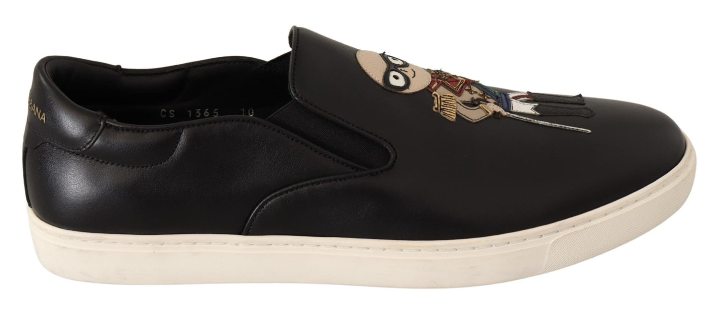 Discover the epitome of Italian craftsmanship with these stunning Dolce & Gabbana loafers. Designed for the modern gentleman, these luxurious slip-on sneakers feature an iconic Sicilian man patch, adding a distinctive touch to your sophisticated wardrobe. The sleek black leather and comfortable rubber sole blend style with practicality, perfect for a variety of occasions.