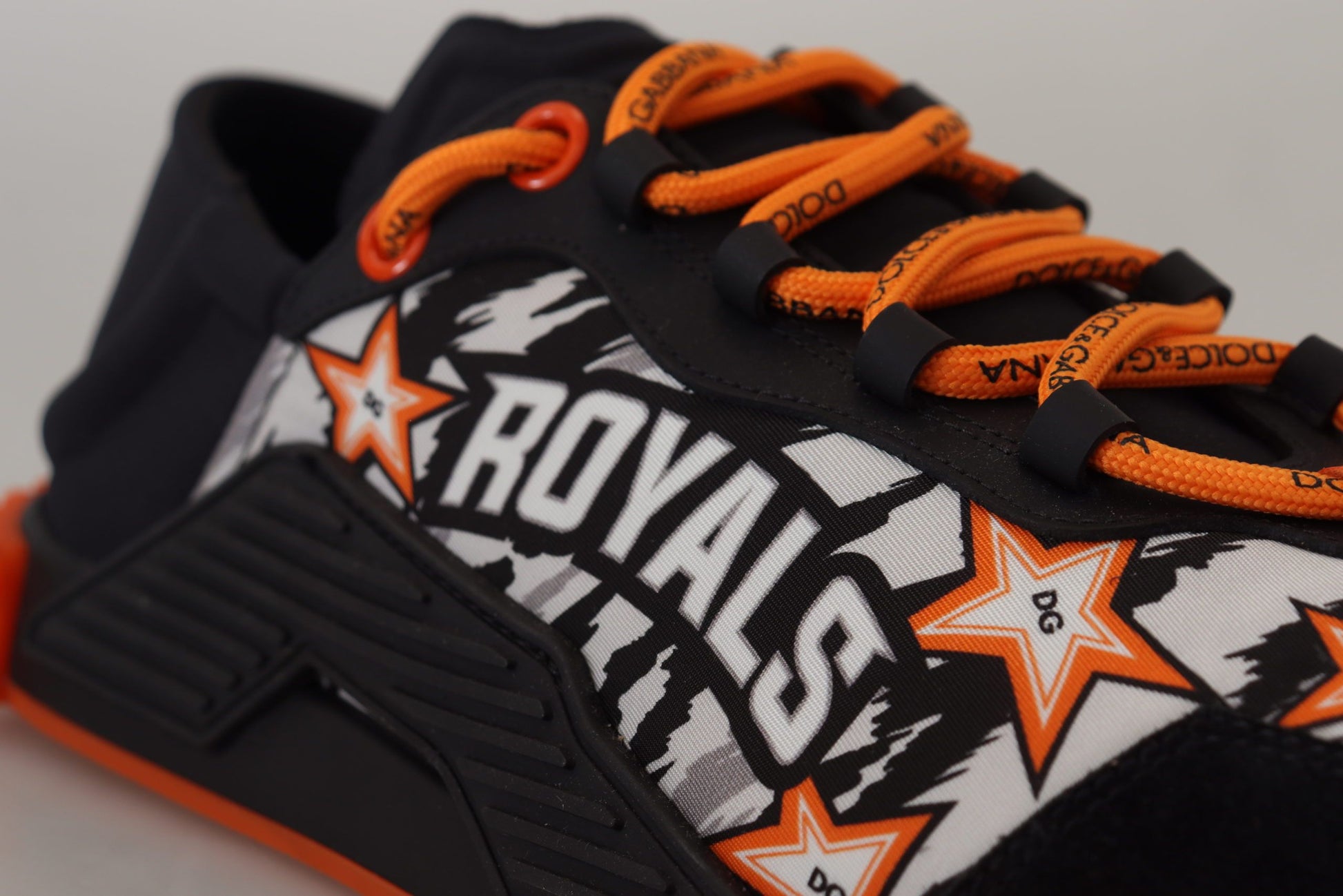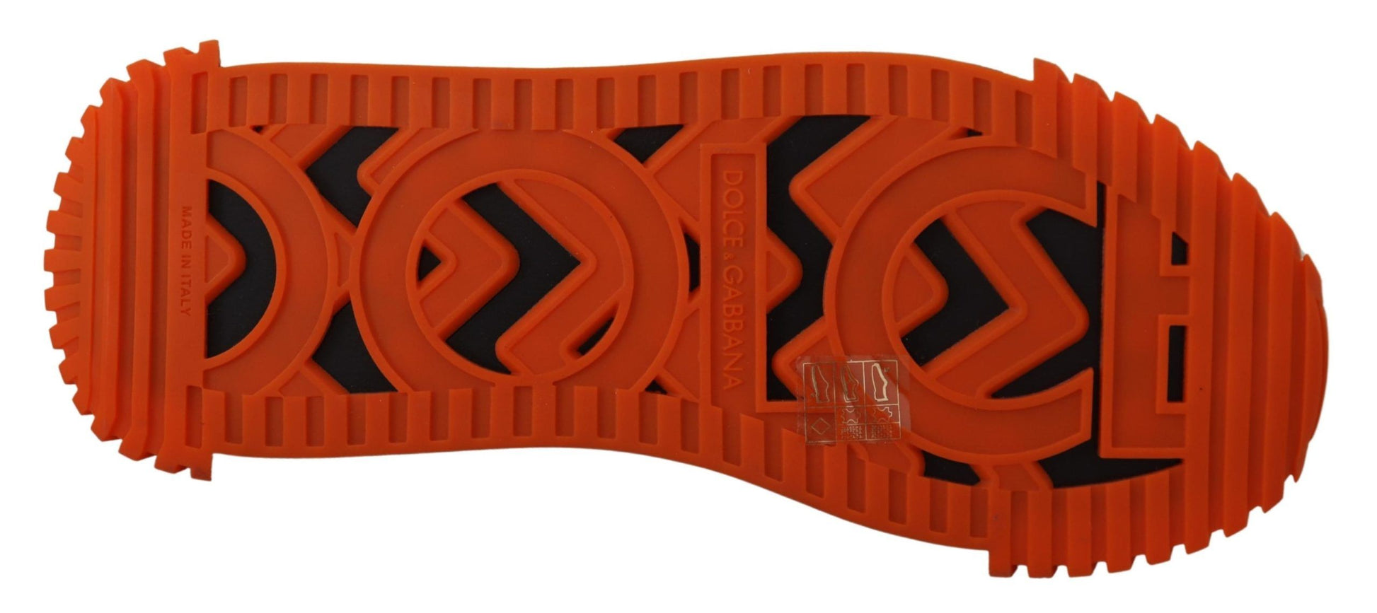 Step into an upscale world of fashion with the latest from Dolce & Gabbana. Discover the unparalleled style and comfort of the NS1 sneakers, crafted for the modern man who appreciates luxury in every step. Boasting a black color palette with a bold orange accent, these shoes are adorned with the ‘Just Be Royals DG’ motive, reflecting an aristocratic vibe. Made in Italy, these sneakers fuse high fashion with practicality, featuring a durable rubber sole that promises longevity and a steady stride. Brimming with the iconic logo details, they’re an emblem of designer wear that stands out.