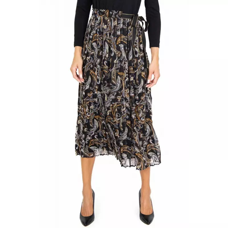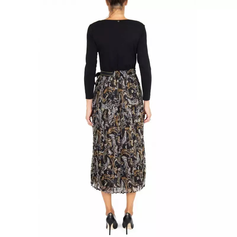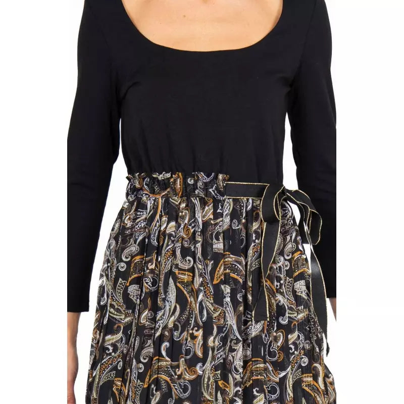 Step into the spotlight with this chic midi dress, featuring a captivating abstract print skirt. Designed for elegance and charm, it pairs an elasticated waist with a tasteful ribbon closure ensuring a flattering fit. Long sleeves coupled with a wide neckline add a touch of grace, making it perfect for any occasion that calls for a sophisticated look.