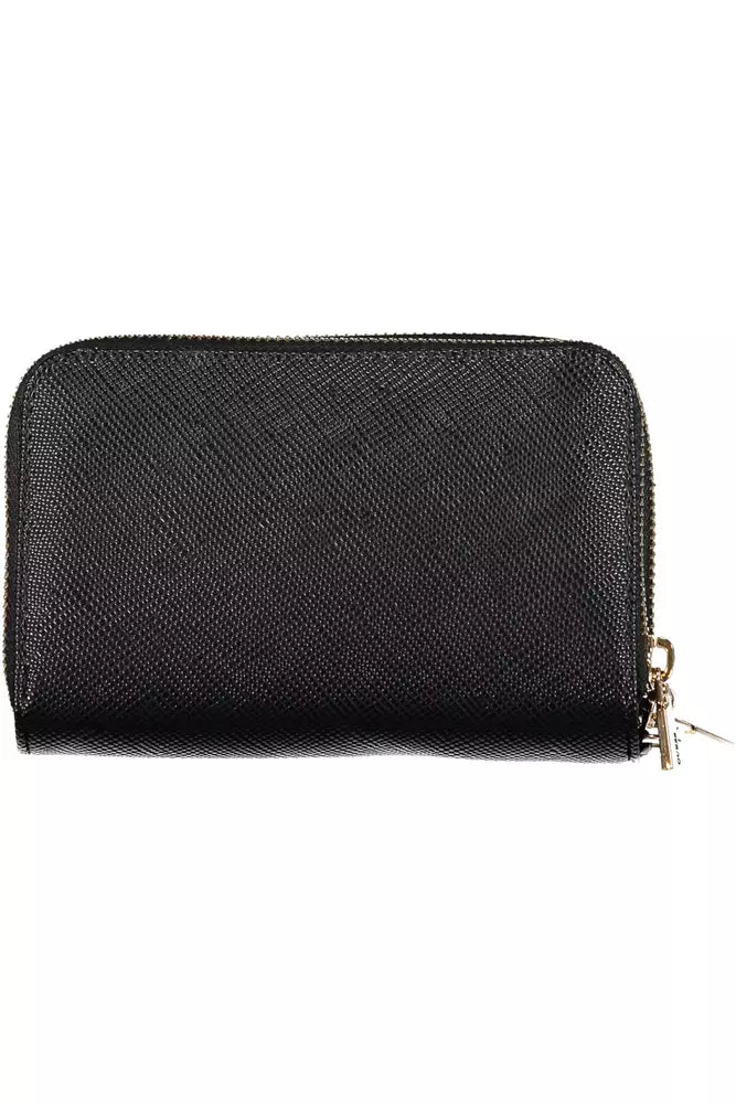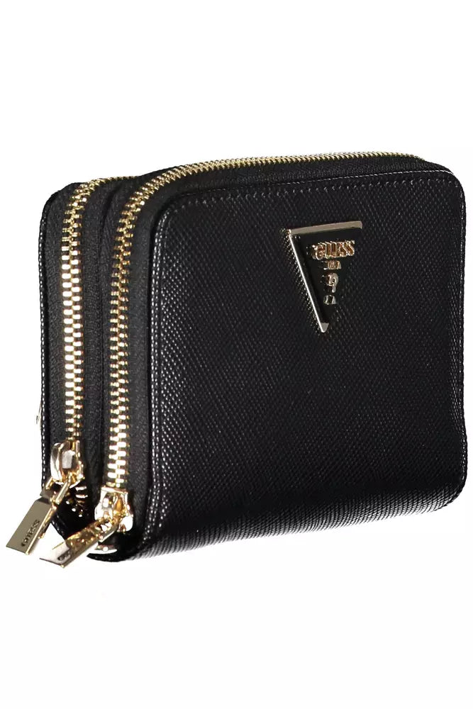 Indulge in the essence of sophistication with this elegant black wallet, perfect for the fashion-savvy individual. Featuring a sleek design with two spacious compartments, a central coin pocket, and ample double card slots for all your essentials. The contrasting details add a touch of modernity, while the secure zip closure provides peace of mind. A removable puller and the subtle Guess Jeans logo serve as refined embellishments to this functional accessory.