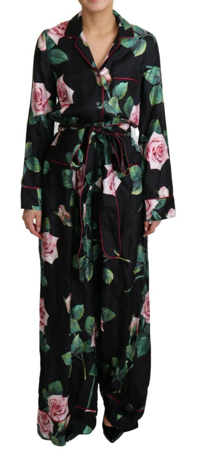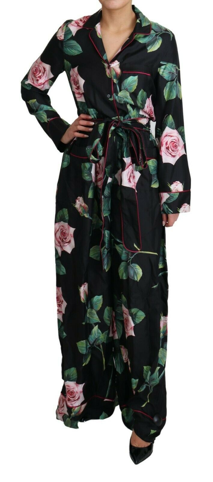 Inject a touch of Italian luxury into your wardrobe with this exquisite Dolce & Gabbana silk jumpsuit. A perfect blend of comfort and high-end fashion, this piece features a pajama-style silhouette enhanced by wide legs and a ribbon waistband for a flattering fit. Adorned with a pink roses print on a black background, striking the right balance between elegance and playful charm. A button-front closure and logo details complete the design, making it a standout choice for any fashion-conscious individual looking for an upscale, versatile outfit.