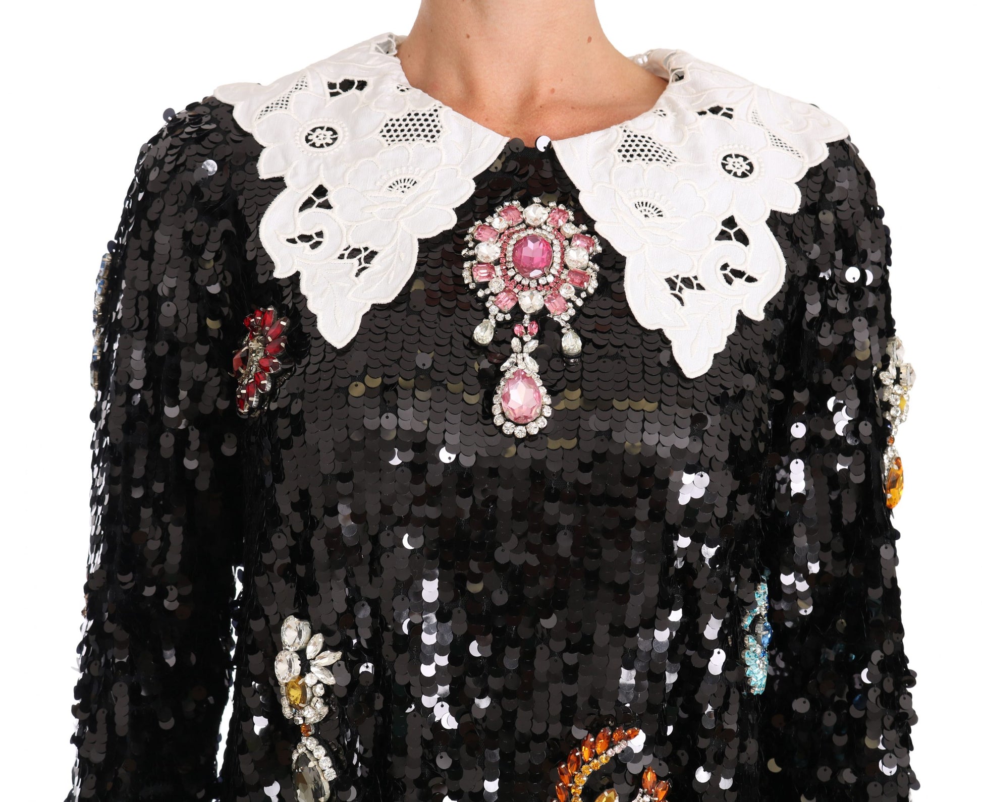 Dazzle in this luxurious Dolce & Gabbana mini dress, perfect for evening affairs or party events. Crafted with impeccable attention to detail, it features a captivating array of multicolor crystal brooches that enhance the classic black backdrop. A shift silhouette tailored with long sleeves offers an elegant profile, while the stretch silk lining ensures a comfortable fit. This made-in-Italy creation epitomizes the high craftsmanship and exclusive appeal of the brand.