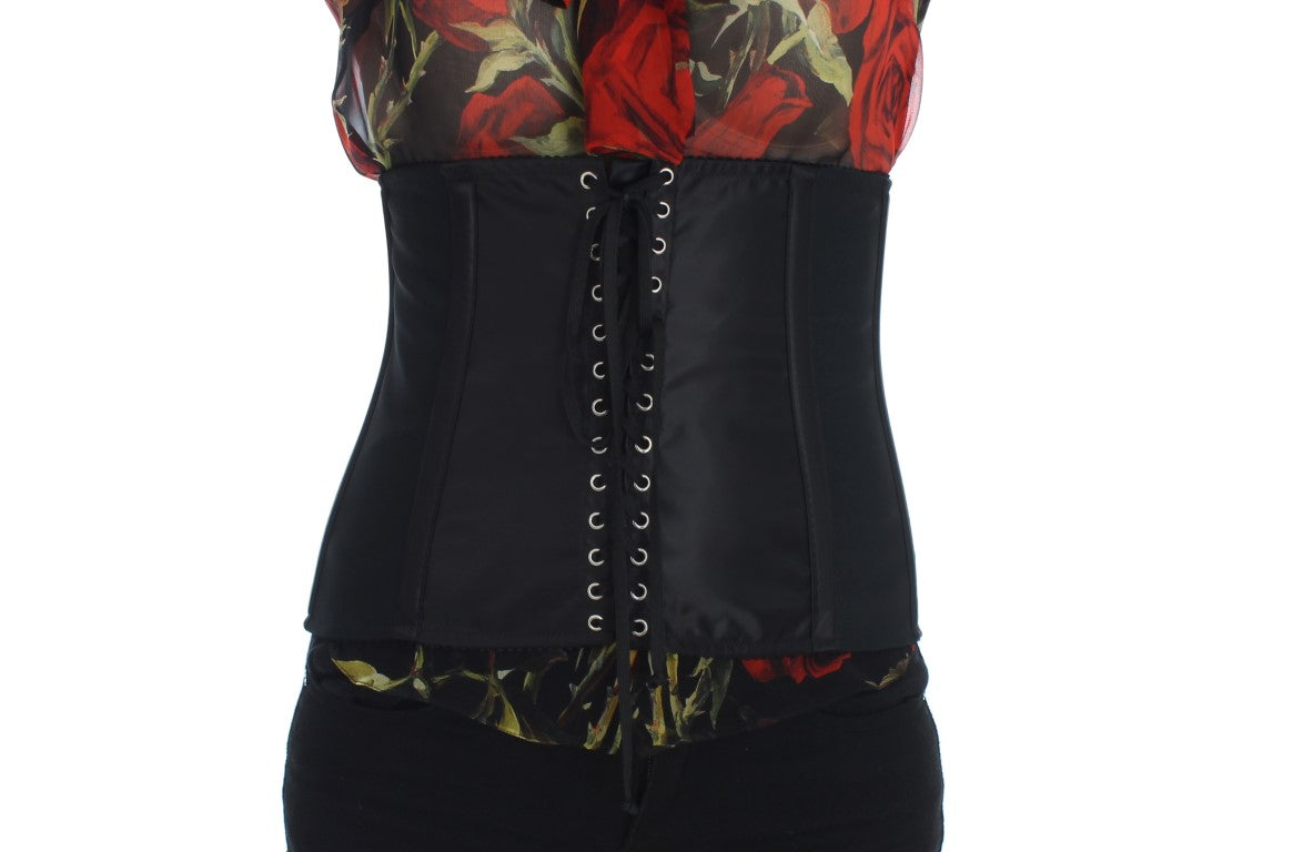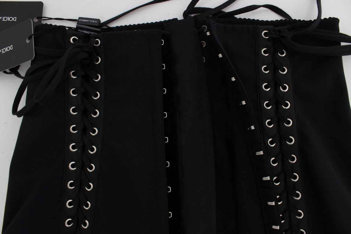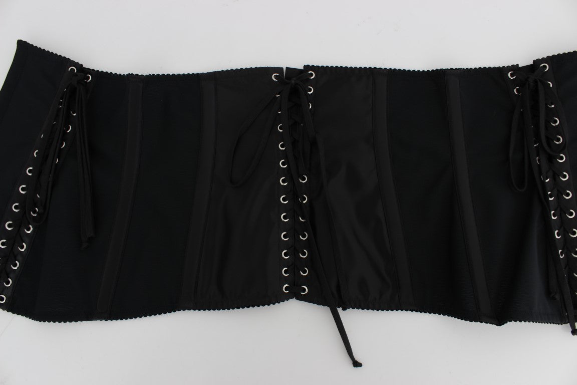 Indulge in the epitome of luxury with this Dolce & Gabbana corset waist belt. This sumptuous accessory is crafted with a blend of elastane and nylon, providing a comfortable stretch fit while ensuring you make a bold fashion statement. Its black hue is beautifully accented with classy silver metal detailing, perfect to elevate any ensemble. Flaunting a sophisticated back hooks closure and the prestigious Dolce & Gabbana logo, this belt is a manifestation of high Italian craftsmanship.