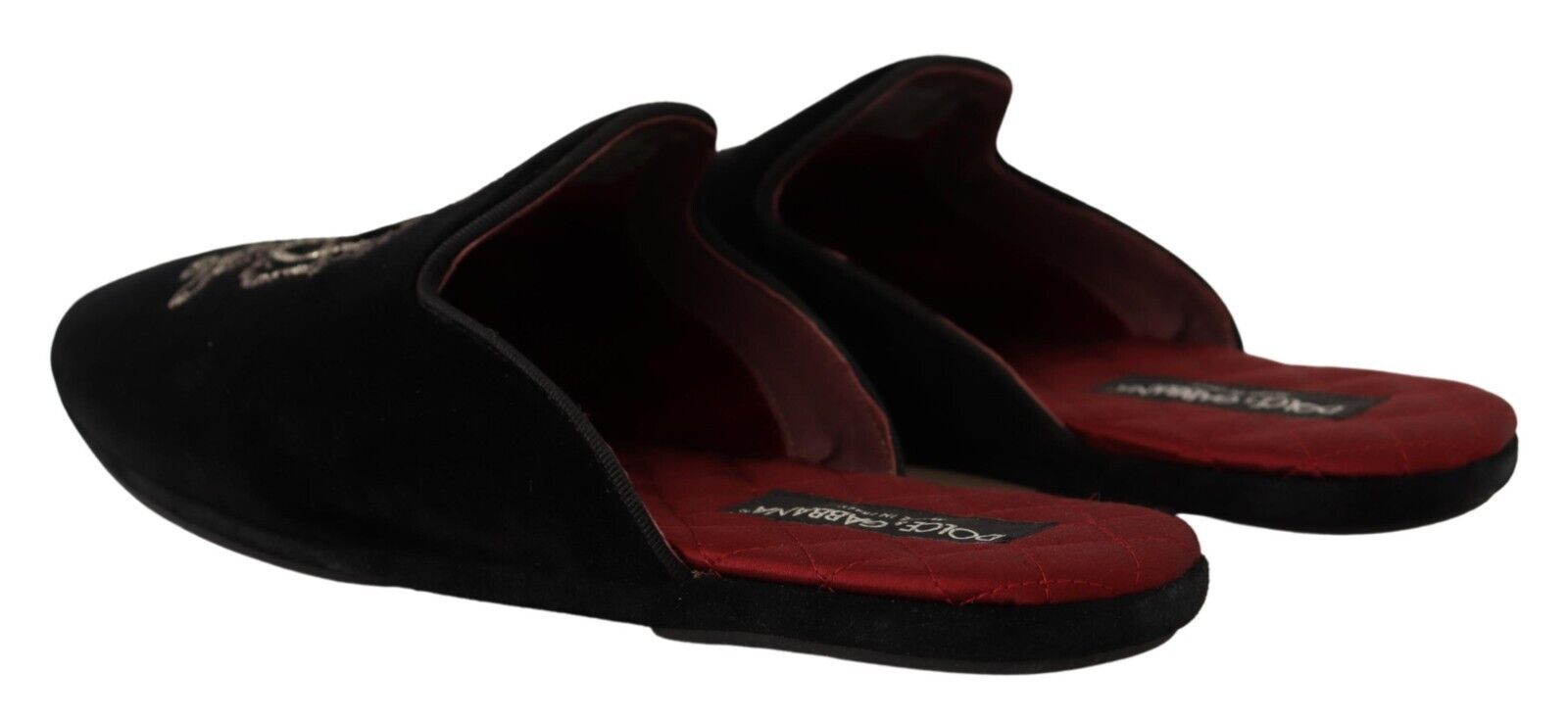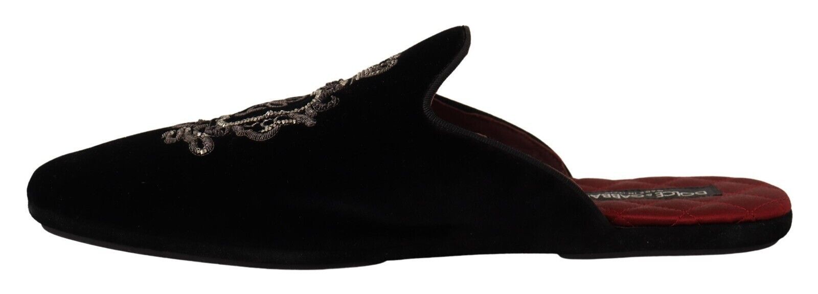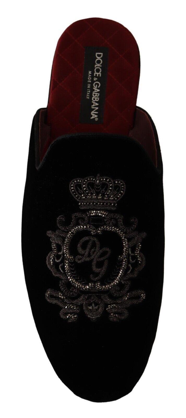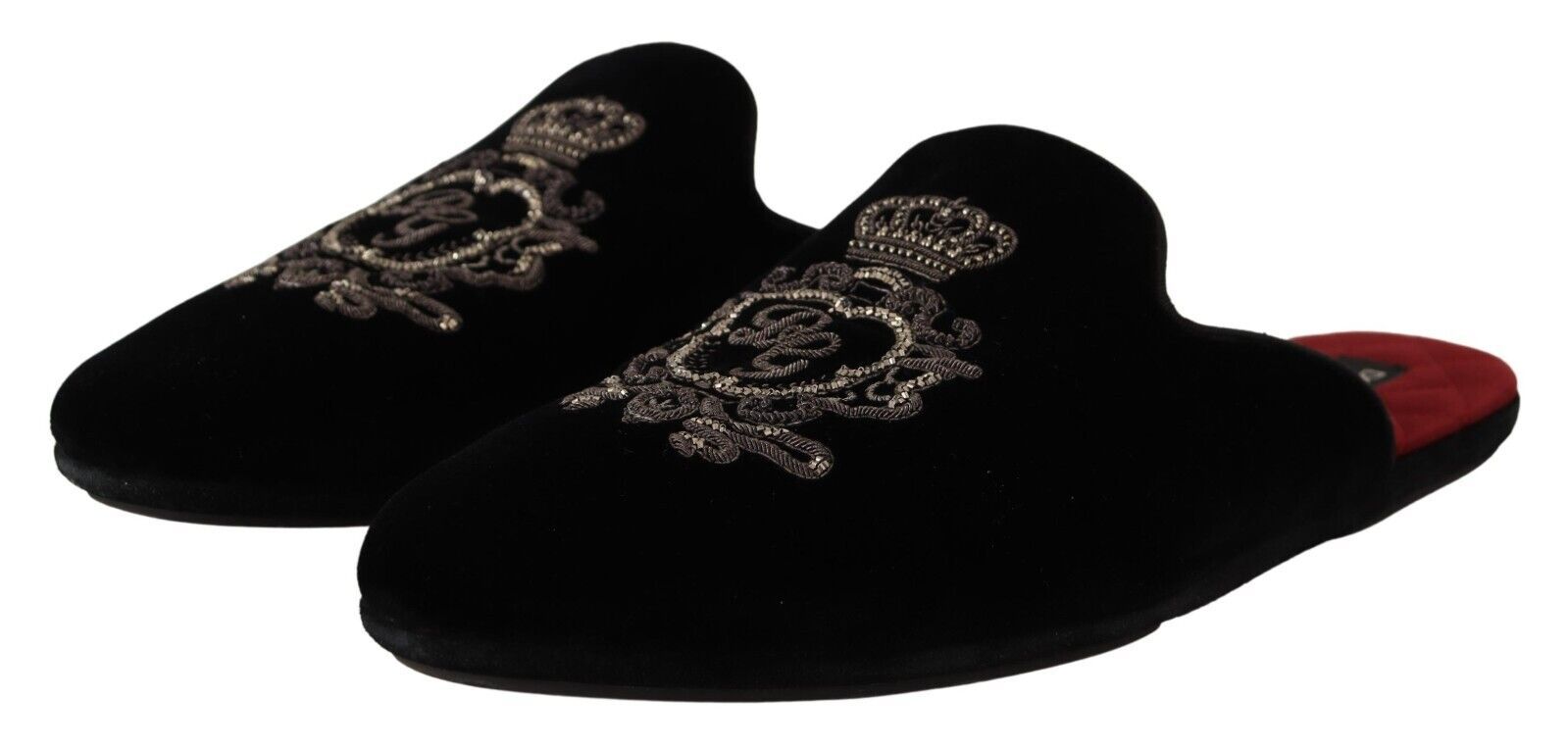 Indulge in the epitome of luxury with these Dolce & Gabbana velvet slides, perfect for elevating your casual ensembles. These gorgeous slides come brand new with tags, boasting a plush velvet exterior with a stunning matte sheen. Adorned with an intricately embroidered logo crown in silver threads and beads, these slides are a testament to exquisite craftsmanship. The insole is lavishly lined with smooth red satin, ensuring a touch of opulence with every step. Crafted in Italy, they feature a durable leather sole for long-lasting wear.