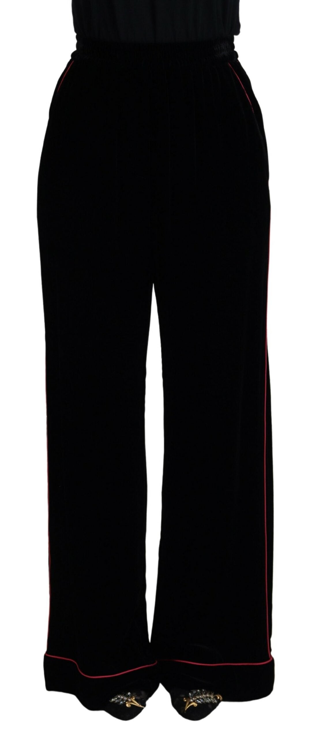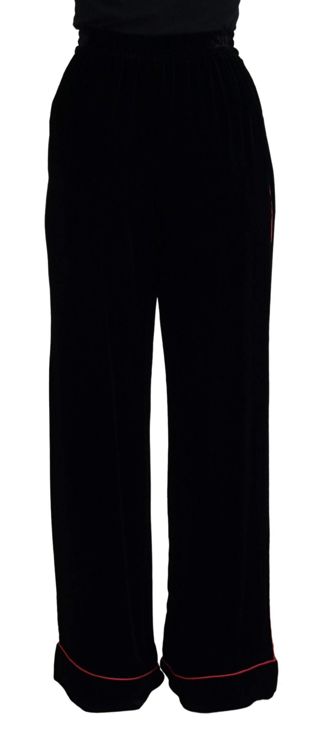 Step into luxury with these exquisite high-waist pants, crafted by the eminent Dolce & Gabbana. These stunning trousers are a blend of opulence and comfort, featuring a sleek black velvet material adorned with sophisticated pink stripes, perfect for those who covet elegance in their wardrobe. Cut to perfection and emanating true Italian craftsmanship, these pants are a wardrobe must-have for fashion aficionados.