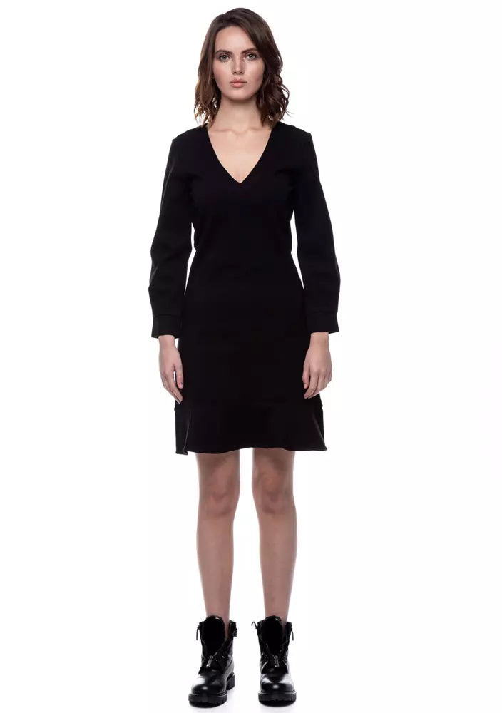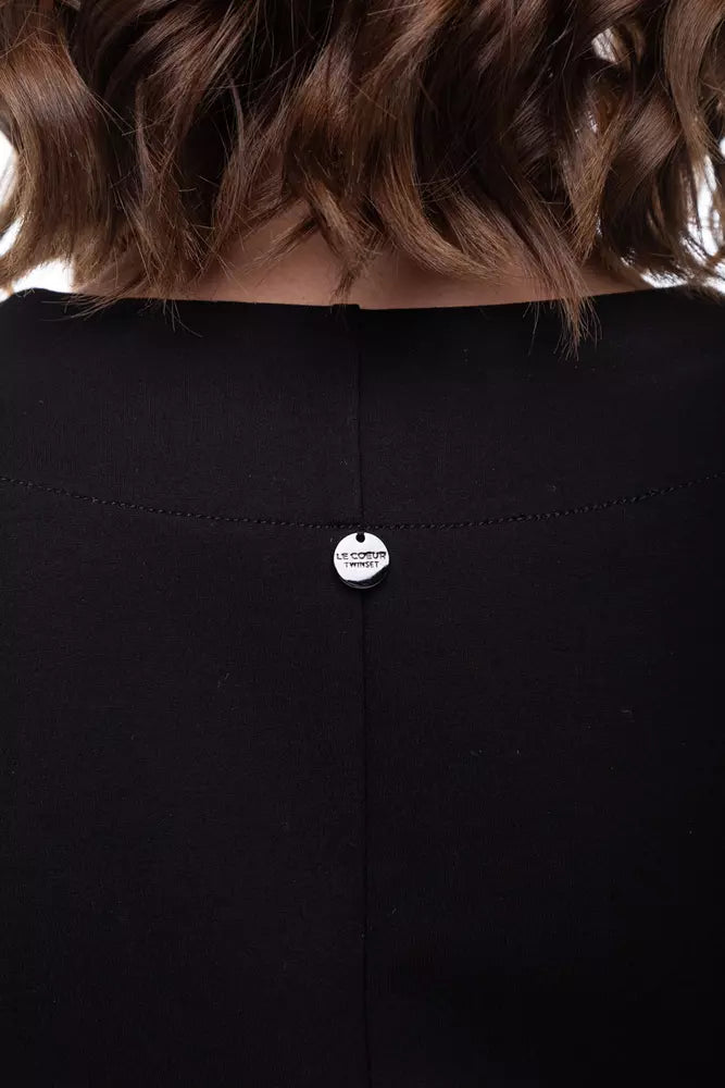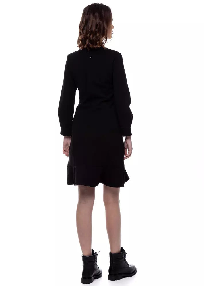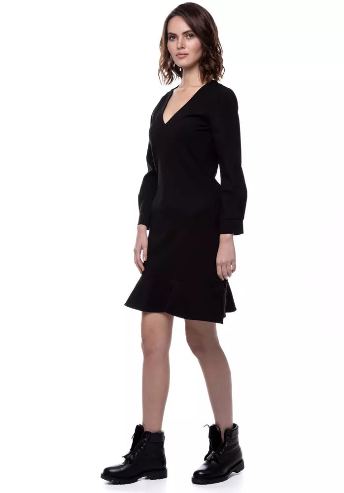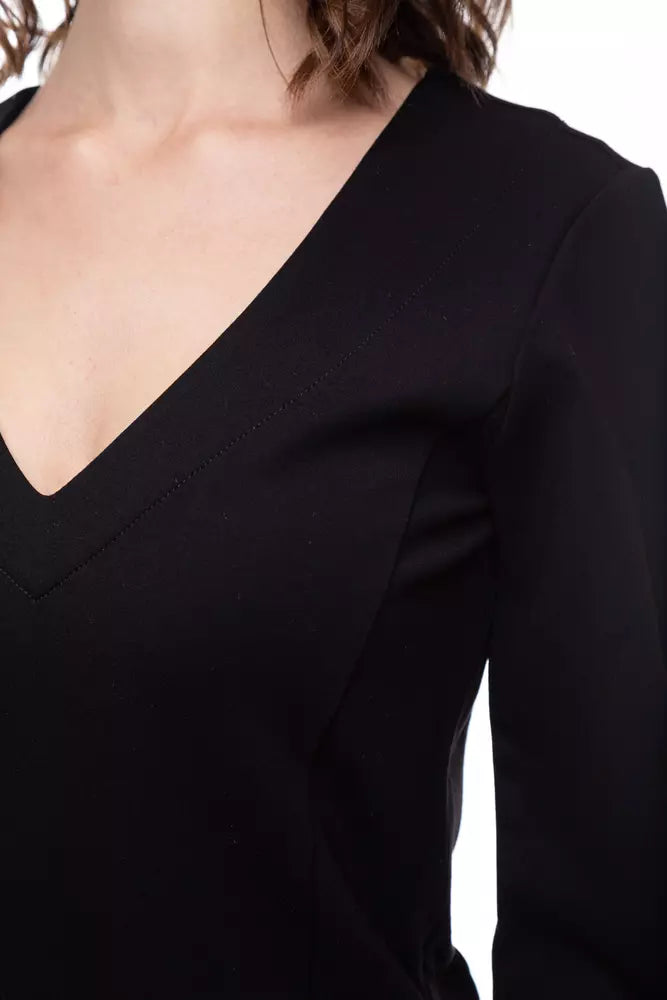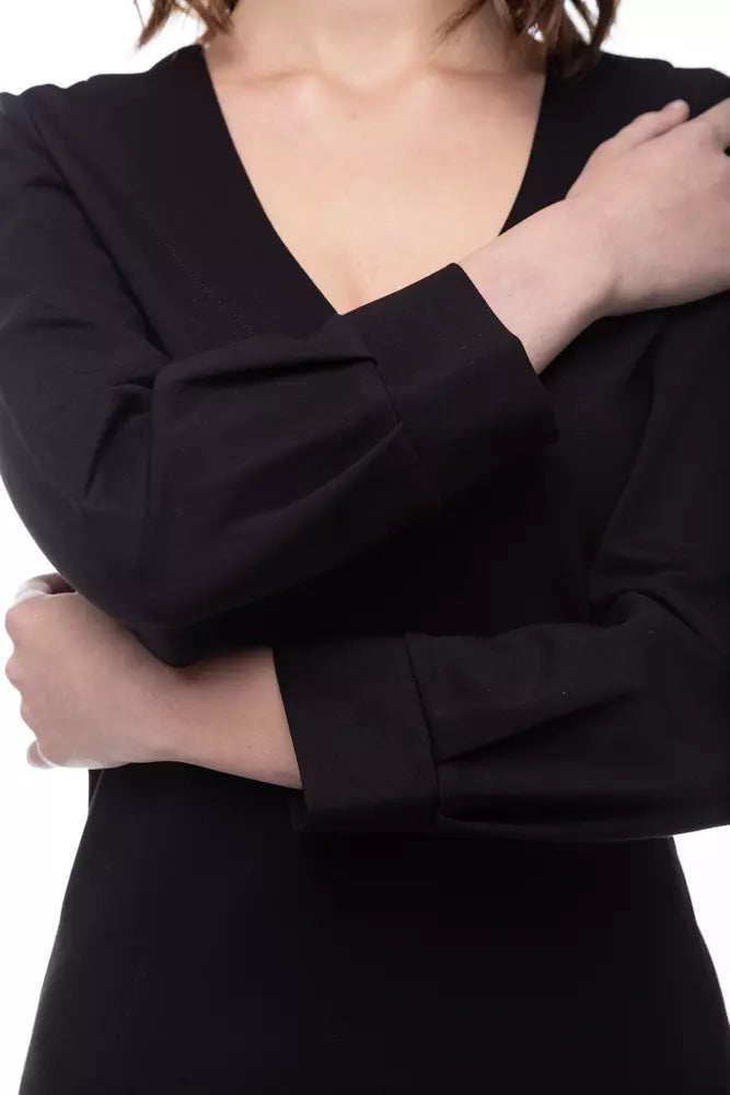 Step into timeless elegance with this chic black sheath dress, perfect for any occasion where sophistication is a must. Designed with a flattering V-neck and long sleeves, it’s finished with a subtle, yet stunning, silver faceted logo plaque on the back. This dress is not just about style; it’s also about comfort and fit, thanks to its ideal blend of viscose, polyamide, and elastane.