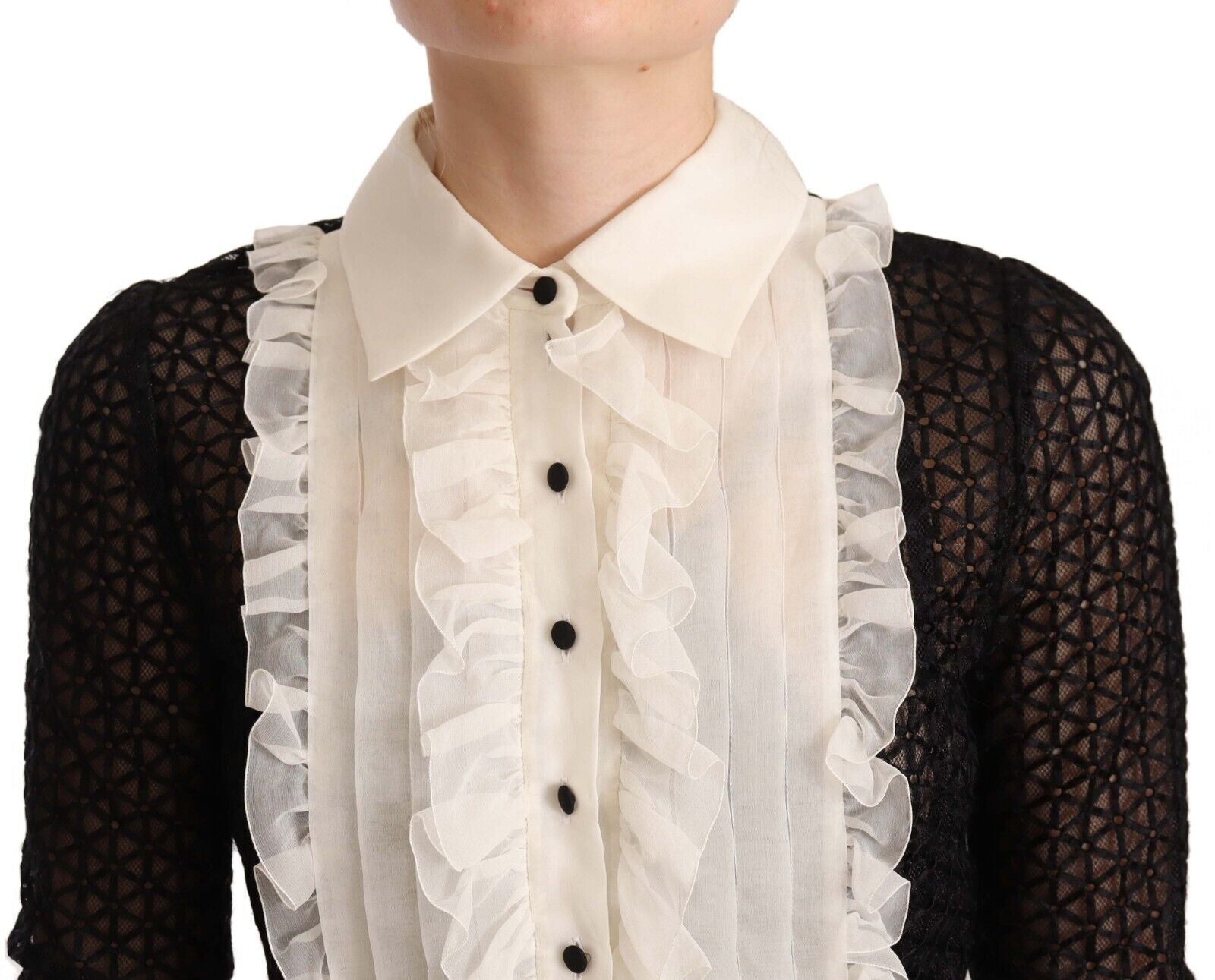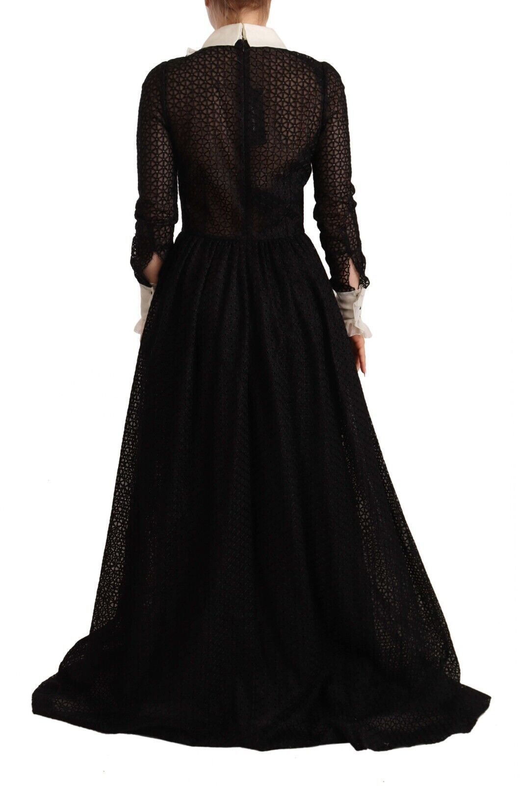 Step into a world of sophistication with this stunning floor-length dress by Dolce & Gabbana. Exuding elegance, this black collared dress features delicate ruffles, enhancing its A-line silhouette. Each detail, from the chic button closure to the subtle logo accents, embodies the luxury craftsmanship of Italy. Perfect for any gala or high-end event, this dress is a true statement piece.
