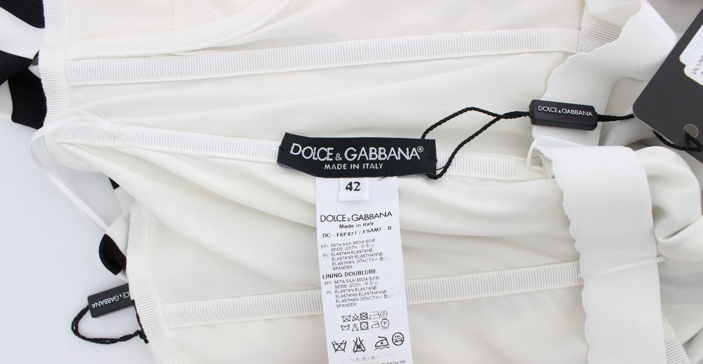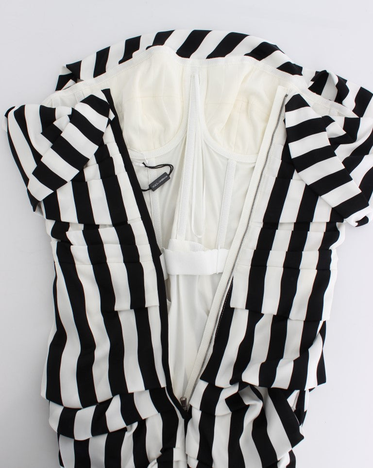 Indulge in the ultimate elegance with this stunning black and white striped silk stretch bodycon dress from Dolce & Gabbana. This gorgeous, brand new dress exudes sophistication and high craftsmanship, ideal for making a lasting impression at any upscale event. It showcases an internal corset and a sleek back zipper closure, with the unmistakable logo detail adding an air of exclusivity. Proudly made in Italy, it’s a testament to luxury fashion.