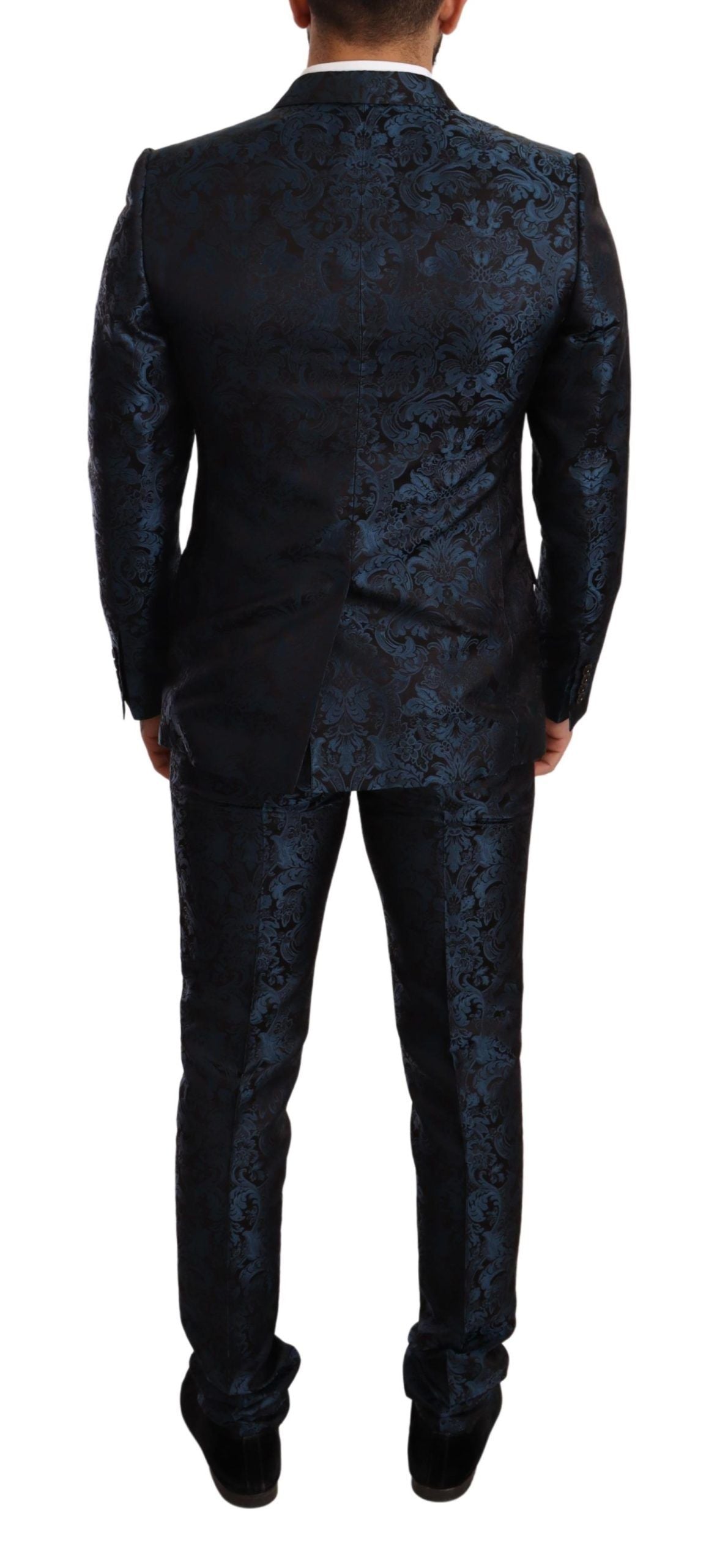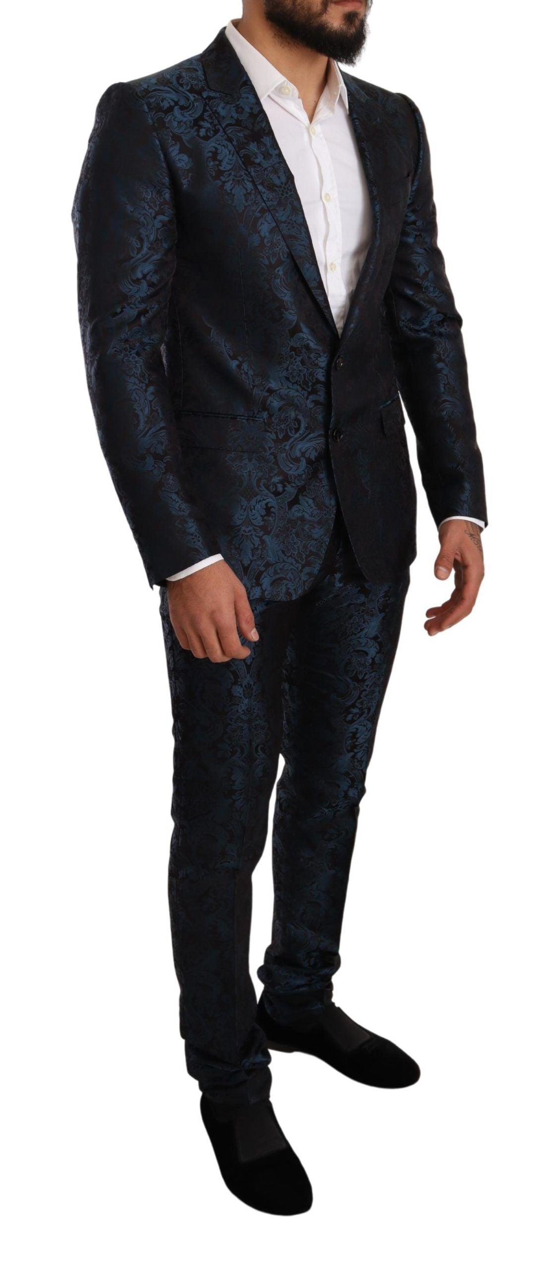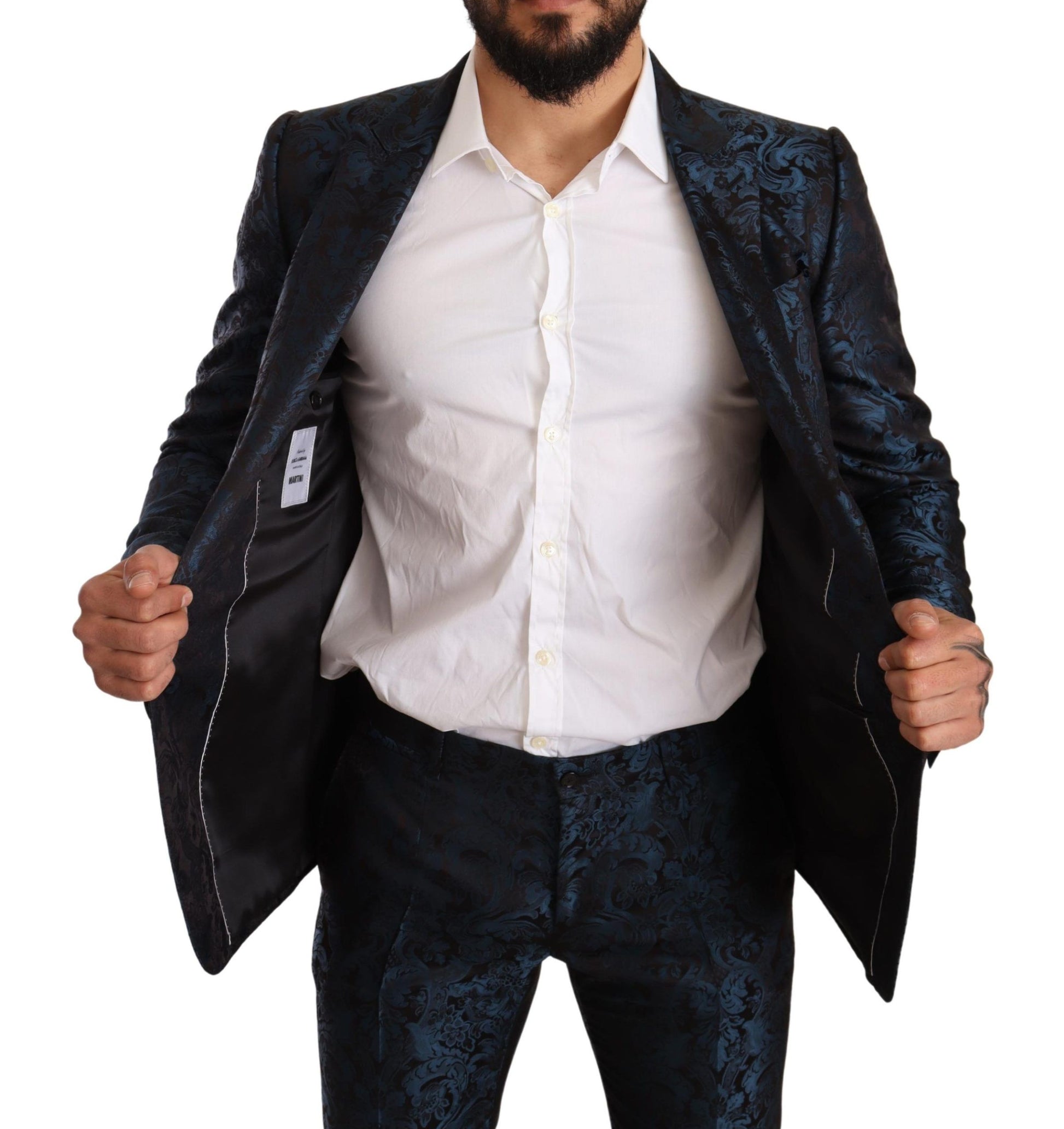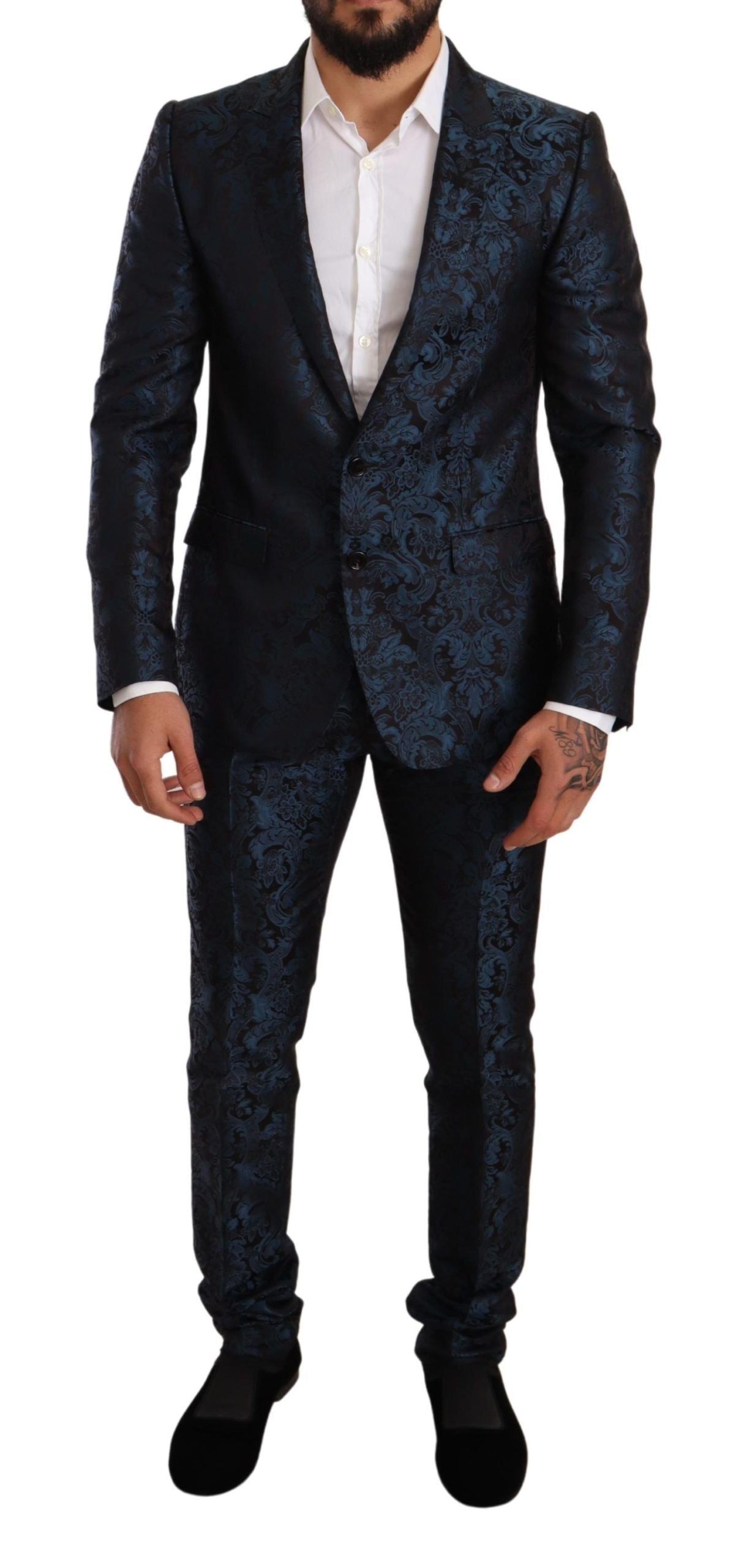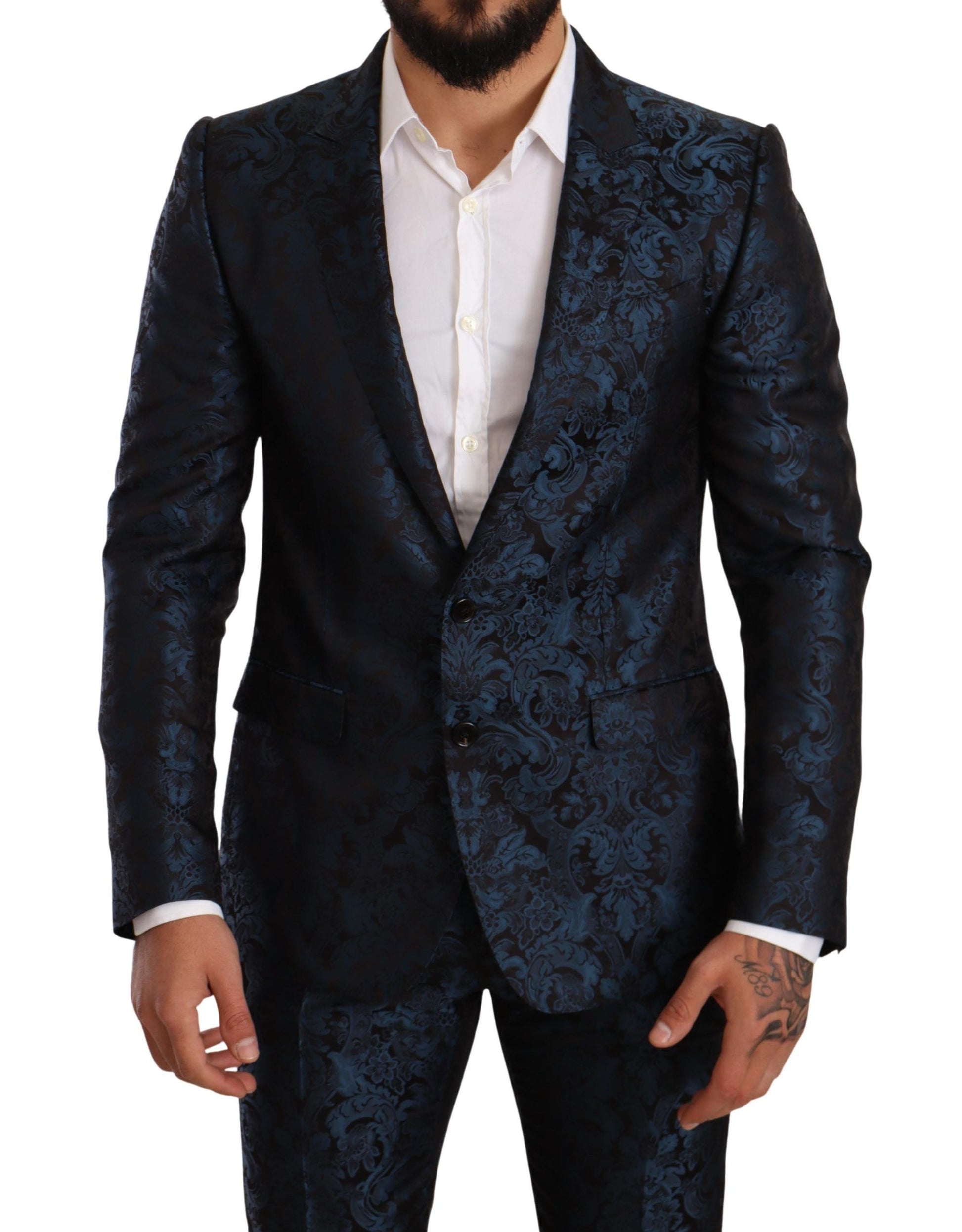 Step into a world of sophistication with this stunning, 100% authentic, new with tags Dolce & Gabbana MARTINI two-piece suit. This expertly crafted silk suit features a sleek blue and black jacquard pattern. The jacket sports a classic notch lapel, long sleeves with button cuffs, a chest pocket, and side flap pockets. Designed in their signature slim-fit style, the suit includes a single-breasted blazer with two-button closure and trousers with a mid-rise, button and zip fly, and sleek waistband with belt loops. Perfect for making a dapper statement, the suit boasts three inside pockets, one open back vent, and exquisite logo details, highlighting the high craftsmanship synonymous with the luxury brand, all brought together in this piece made lovingly in Italy.