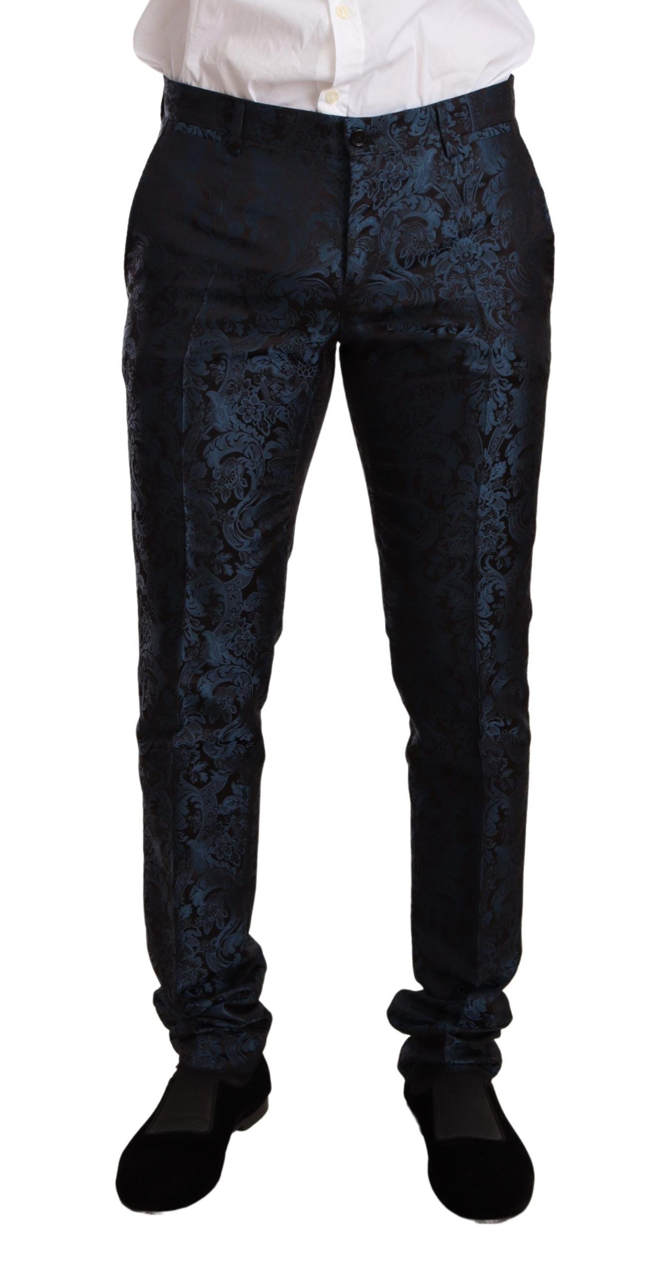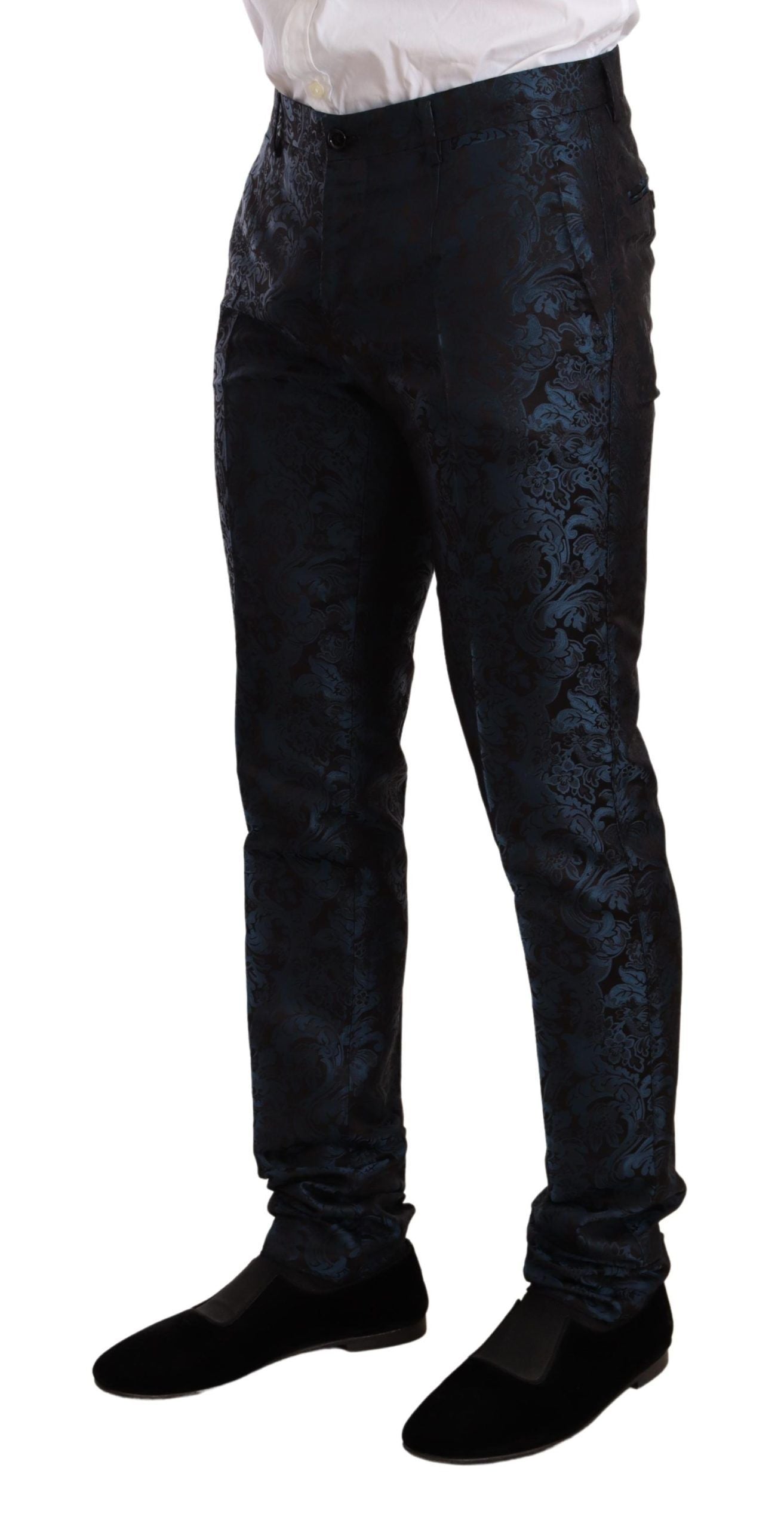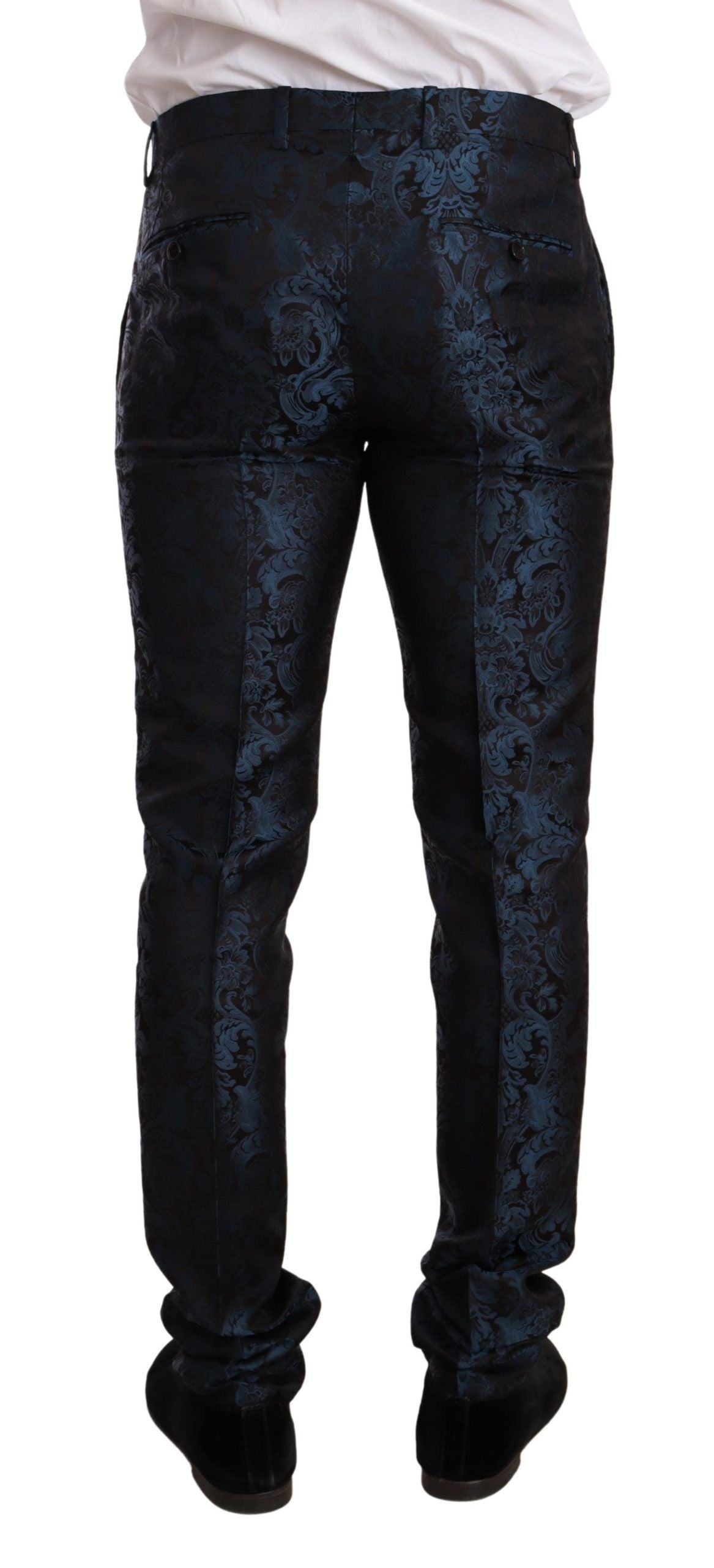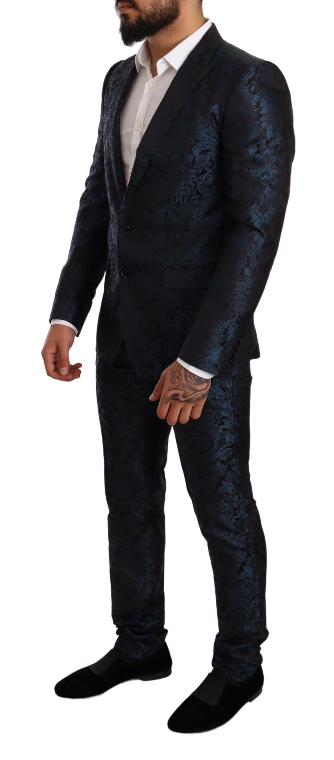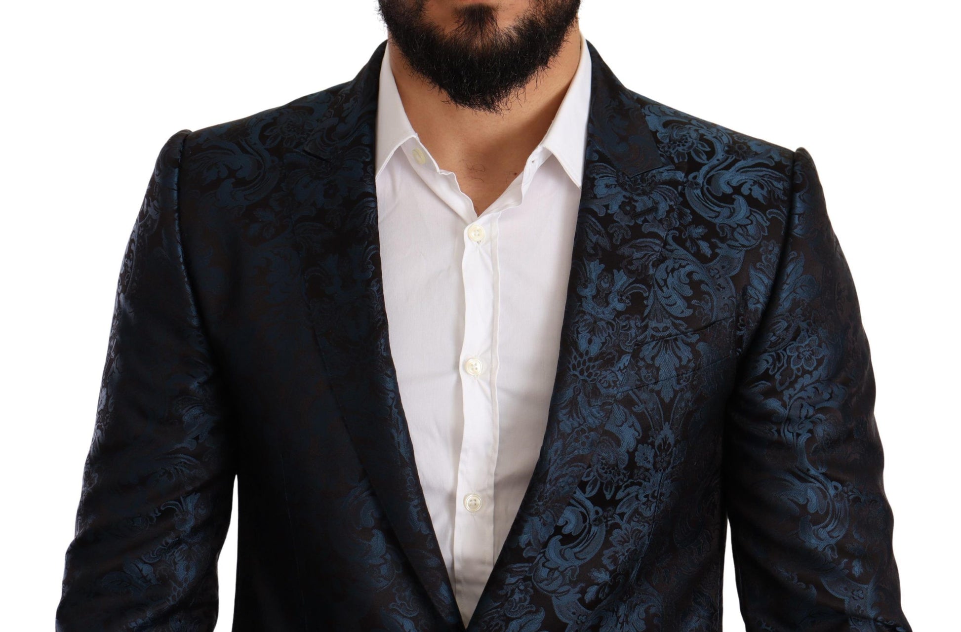 Step into a world of sophistication with this stunning, 100% authentic, new with tags Dolce & Gabbana MARTINI two-piece suit. This expertly crafted silk suit features a sleek blue and black jacquard pattern. The jacket sports a classic notch lapel, long sleeves with button cuffs, a chest pocket, and side flap pockets. Designed in their signature slim-fit style, the suit includes a single-breasted blazer with two-button closure and trousers with a mid-rise, button and zip fly, and sleek waistband with belt loops. Perfect for making a dapper statement, the suit boasts three inside pockets, one open back vent, and exquisite logo details, highlighting the high craftsmanship synonymous with the luxury brand, all brought together in this piece made lovingly in Italy.