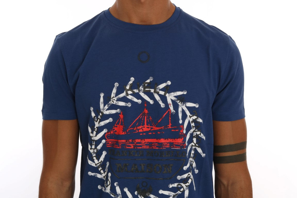 Indulge in the casual luxury of a Frankie Morello exclusive with this pristine blue crewneck t-shirt. A staple that merges classic comfort with chic design, this piece is guaranteed to elevate your everyday style. Featuring the distinctive ‘Maison’ motif and crafted from fine 100% cotton, it’s not just a t-shirt, it’s a statement.