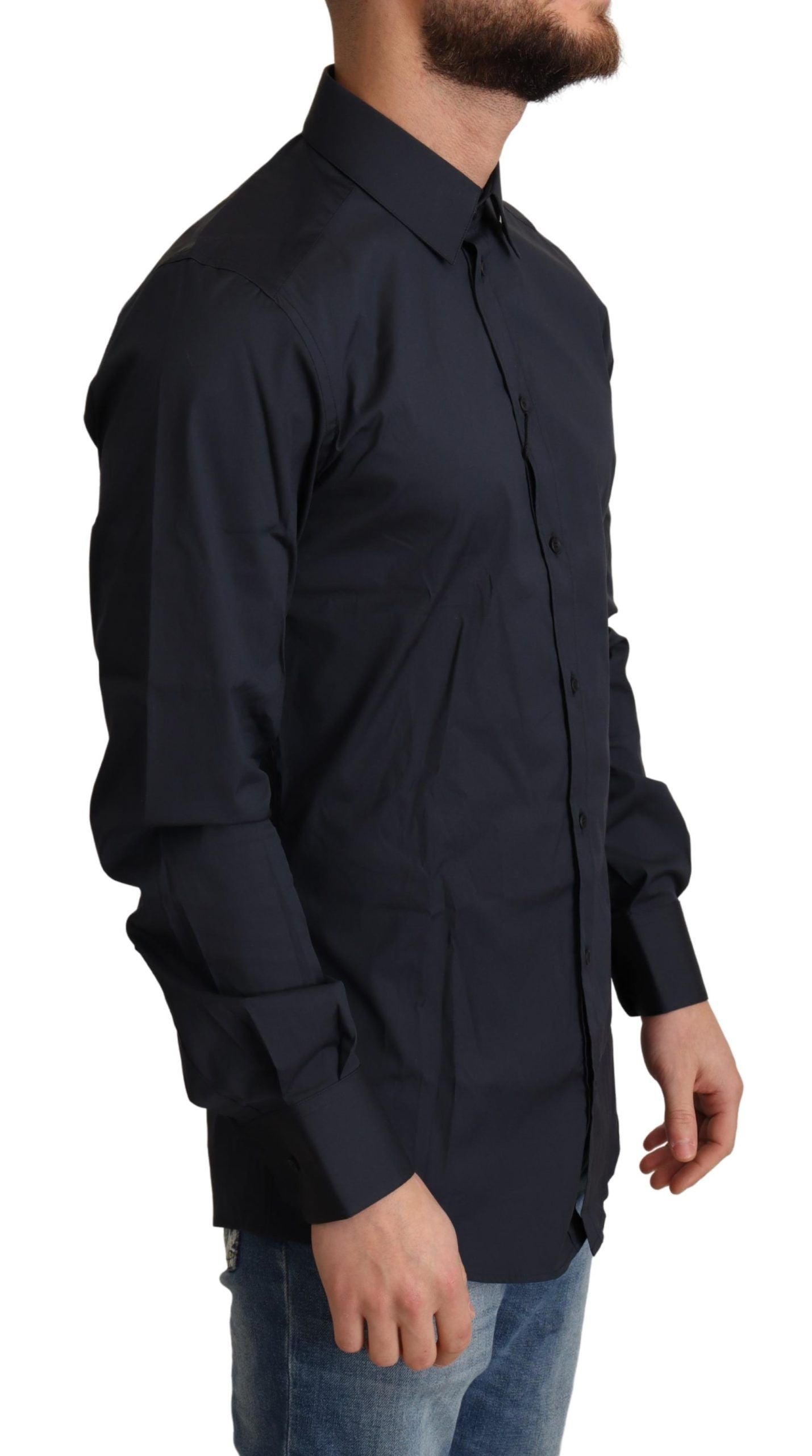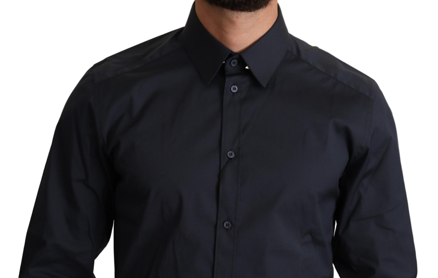 Unveil the pinnacle of sophistication with this immaculate Dolce & Gabbana dress shirt. Meticulously designed for the modern gentleman, this slim-fit shirt exudes elegance with a spread collar, long sleeves, and a sleek button front closure. Crafted from a blend of premium cotton, nylon, and elastane, it ensures both comfort and impeccable style. The dark blue hue embodies classic finesse, making it a quintessential addition to your formal wardrobe.