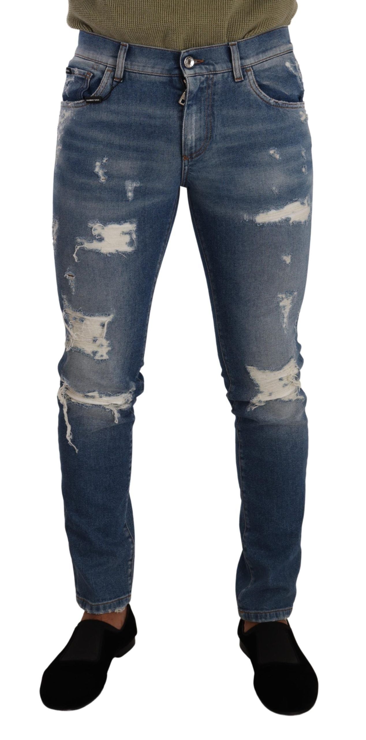 Experience luxury with every move in these authentic, new-with-tags Dolce & Gabbana skinny denim jeans. These pants are not just a fashion statement but a tribute to high-end craftsmanship, featuring a flattering slim fit cut from a cotton stretch blend for comfort and versatility. The iconic logo plaque adorns the back pocket, while the blue wash color offers a classic look suitable for any occasion. Embody the essence of Italian style with these sophisticated jeans, perfect for the modern man.