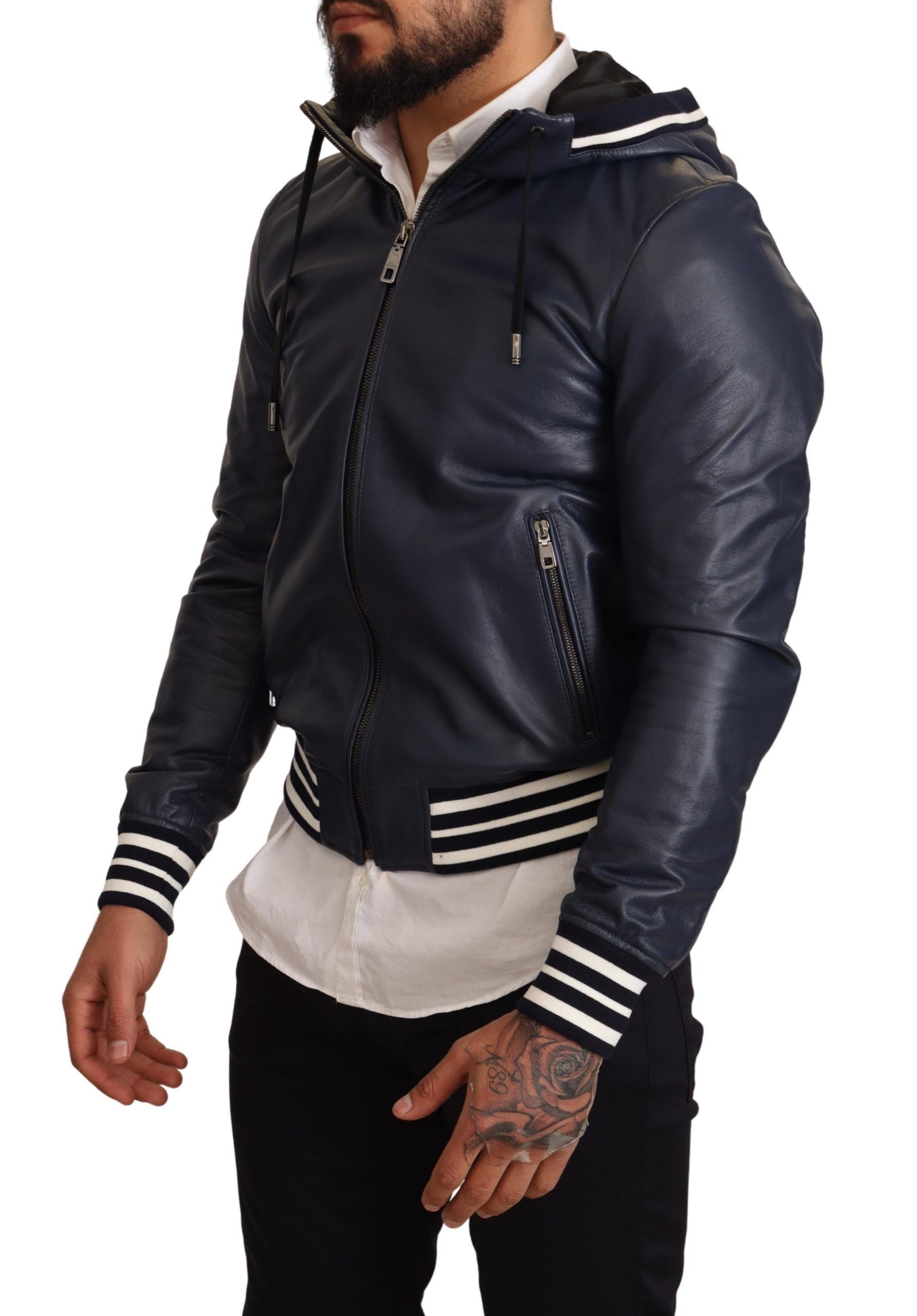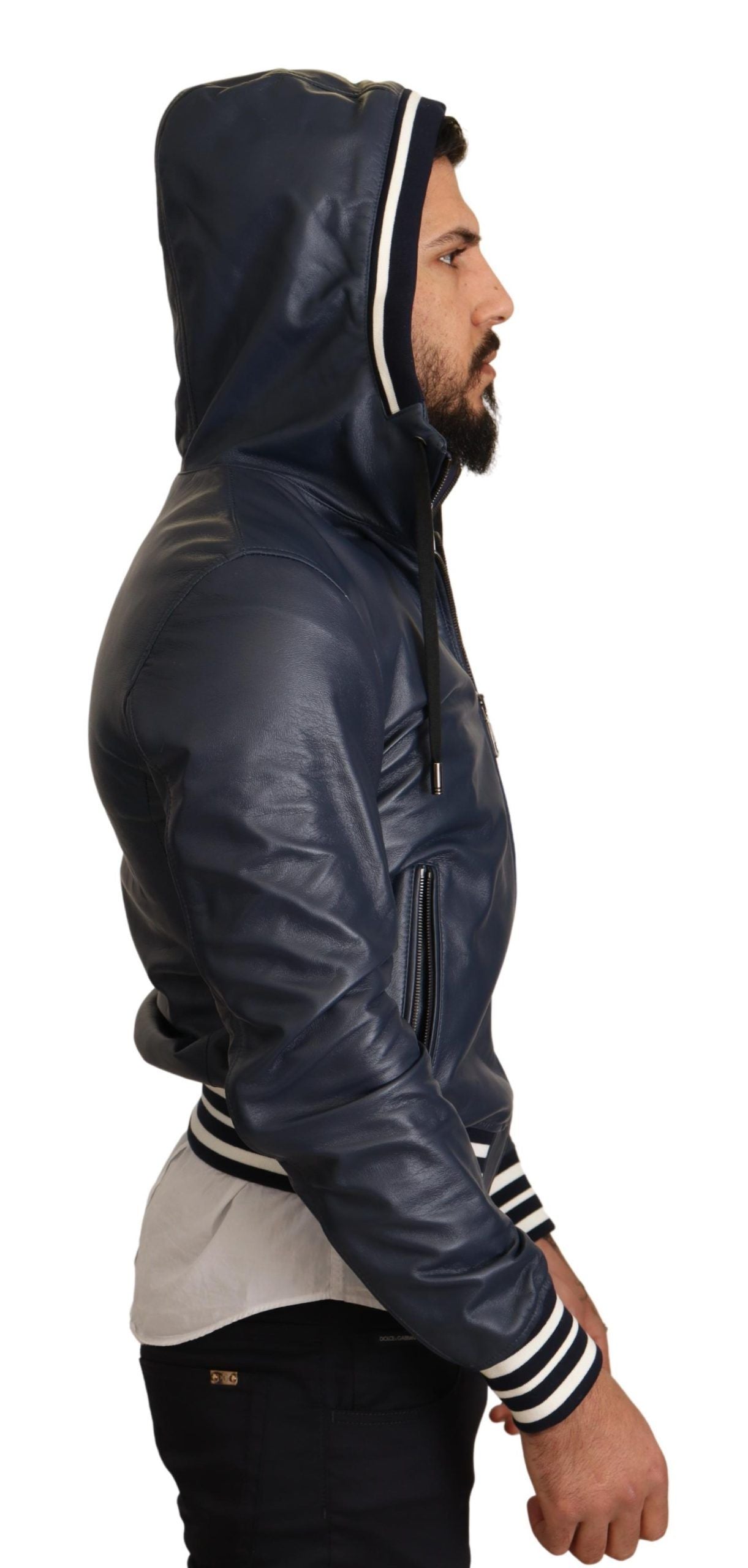 Indulge in the epitome of sophistication with this sumptuous Dolce & Gabbana leather bomber jacket. Designed for the fashion-forward individual, this jacket boasts a sleek blue hue complemented by a hood, long sleeves, and ribbed edges. The jacket is equipped with a full zip front closure and adjustable hood strap, providing both comfort and a custom fit. The elegant design is finished with distinctive logo details, ensuring you make a statement wherever you go.