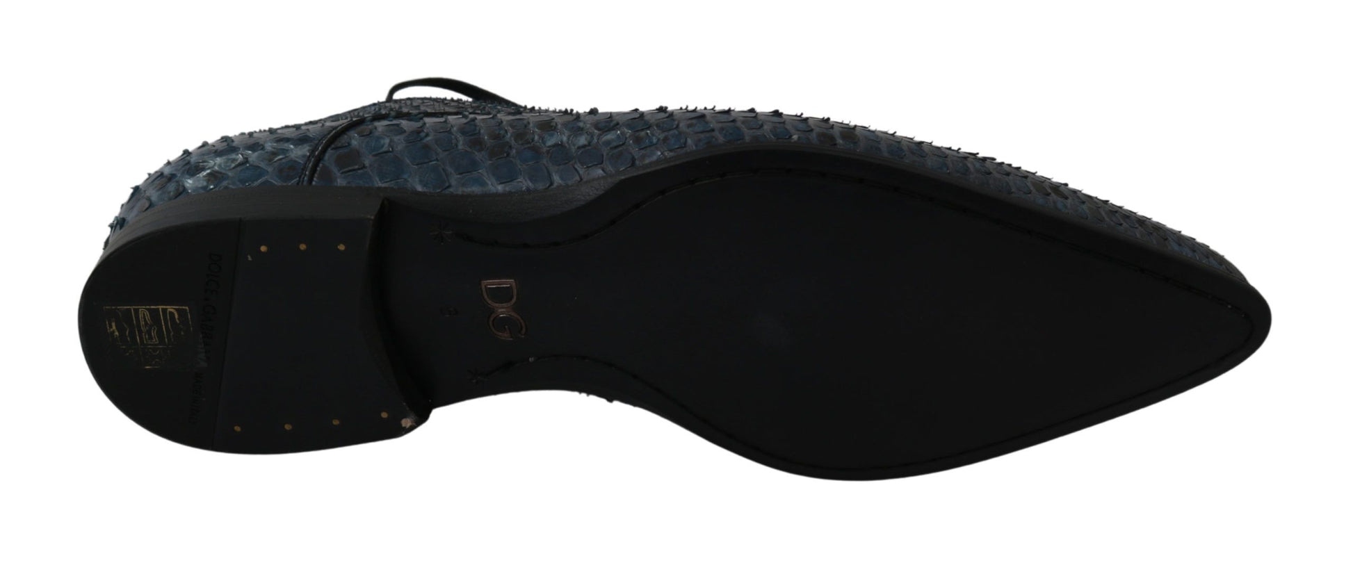 Step into luxury with these exquisite Dolce & Gabbana blue python skin leather dress shoes. Beautifully crafted in Italy, they feature a sleek design with a leather sole and logo details, offering an undeniable mark of sophistication and high craftsmanship. Perfect for formal occasions, these shoes are a testament to elegance and style.