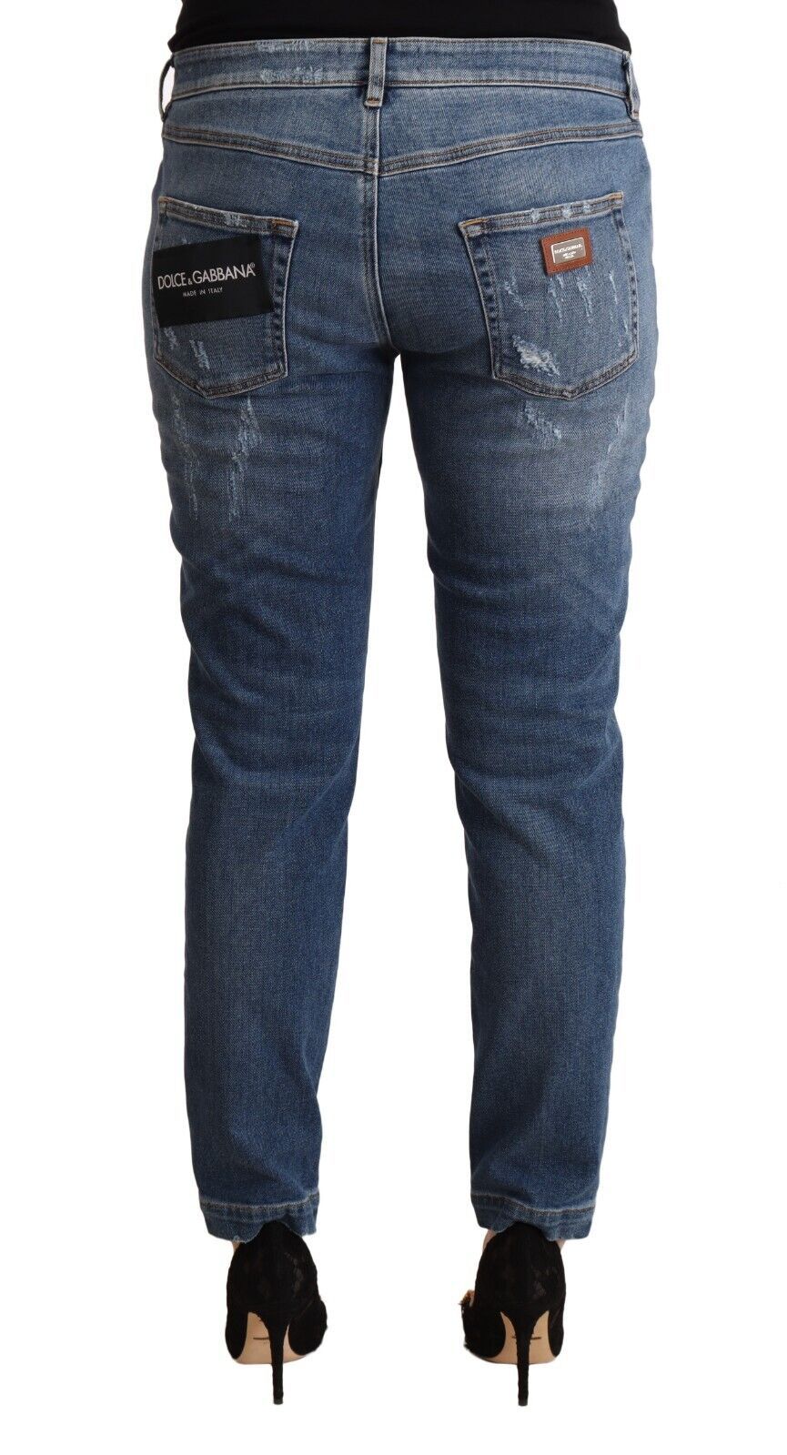 Revamp your wardrobe with the elegant sophistication of Dolce & Gabbana’s distressed skinny jeans. Perfect for those who love to combine glamour with a touch of edge, these jeans feature a flattering mid waist and convenient zipper closure, tailored for a regular fit that contours gracefully to your figure. Constructed from a premium cotton blend, they assure comfort without compromising on durability or style.