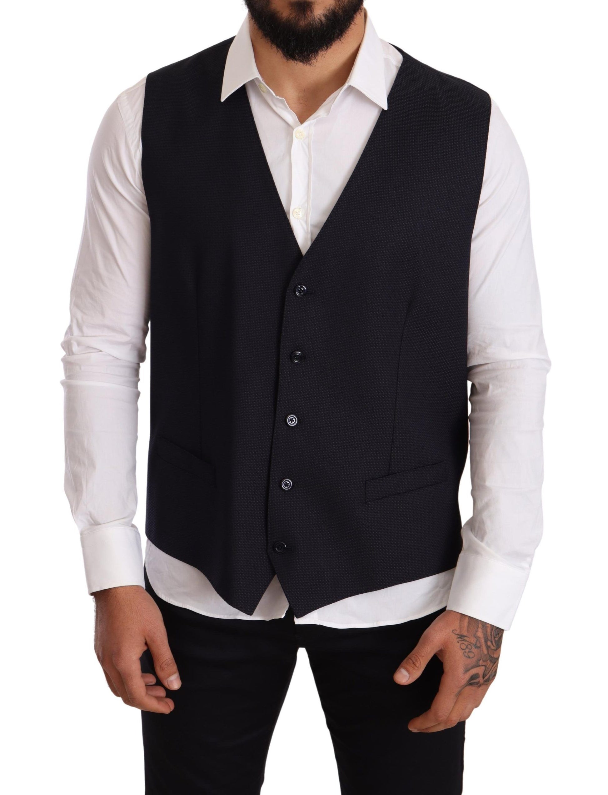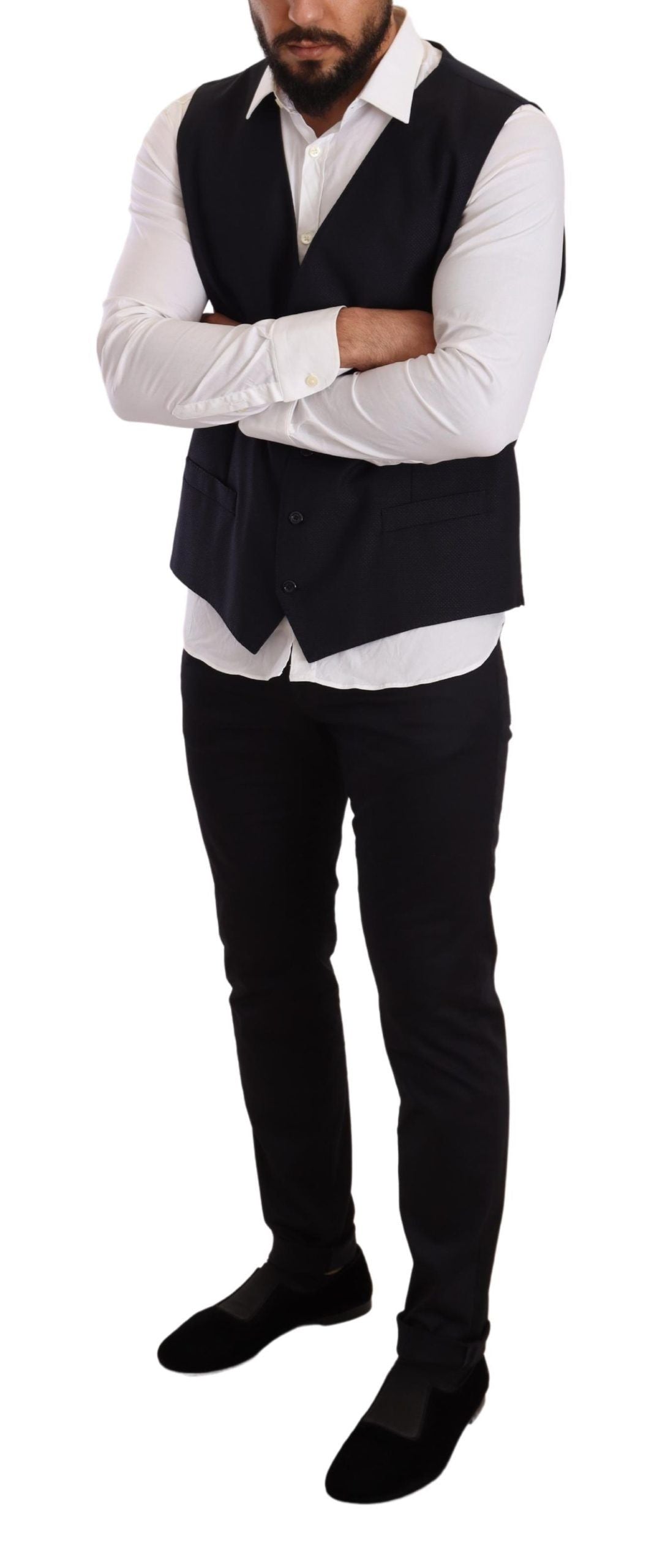 Indulge in unparalleled craftsmanship and sophisticated style with this dark blue dress vest from Dolce & Gabbana. Crafted from an exquisite blend of virgin wool and silk, this formal garment adds a layer of luxury to your attire. Featuring a sleek button closure and distinct logo details, each piece is a testament to Italian elegance, made in the heart of Italy.