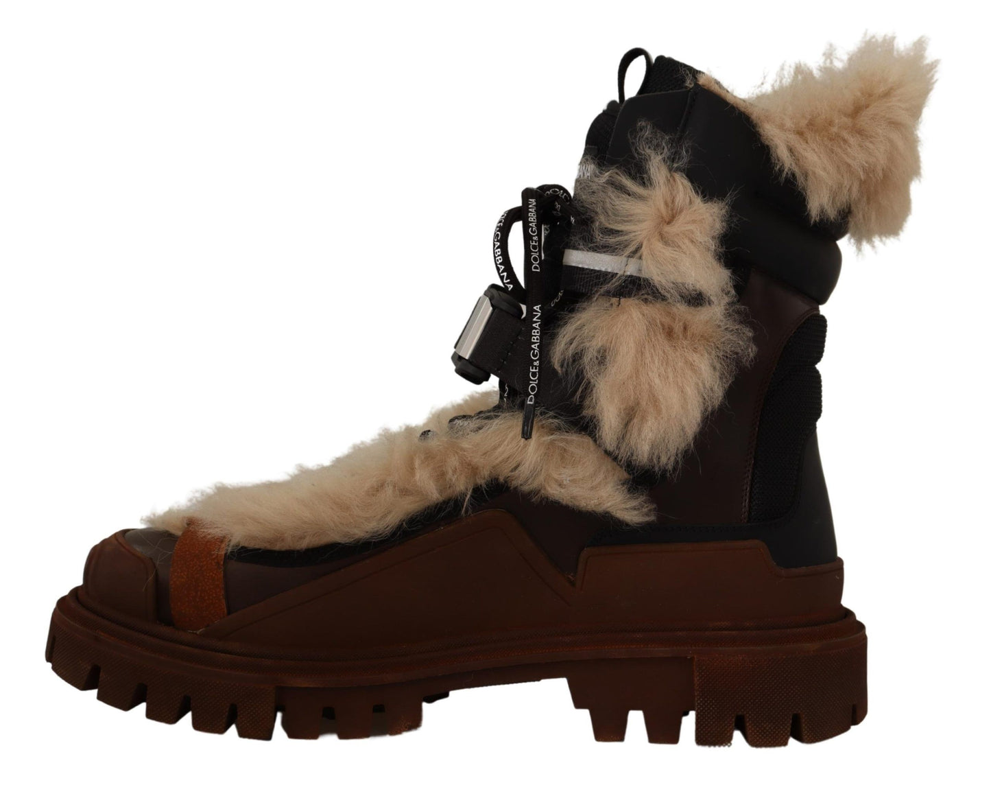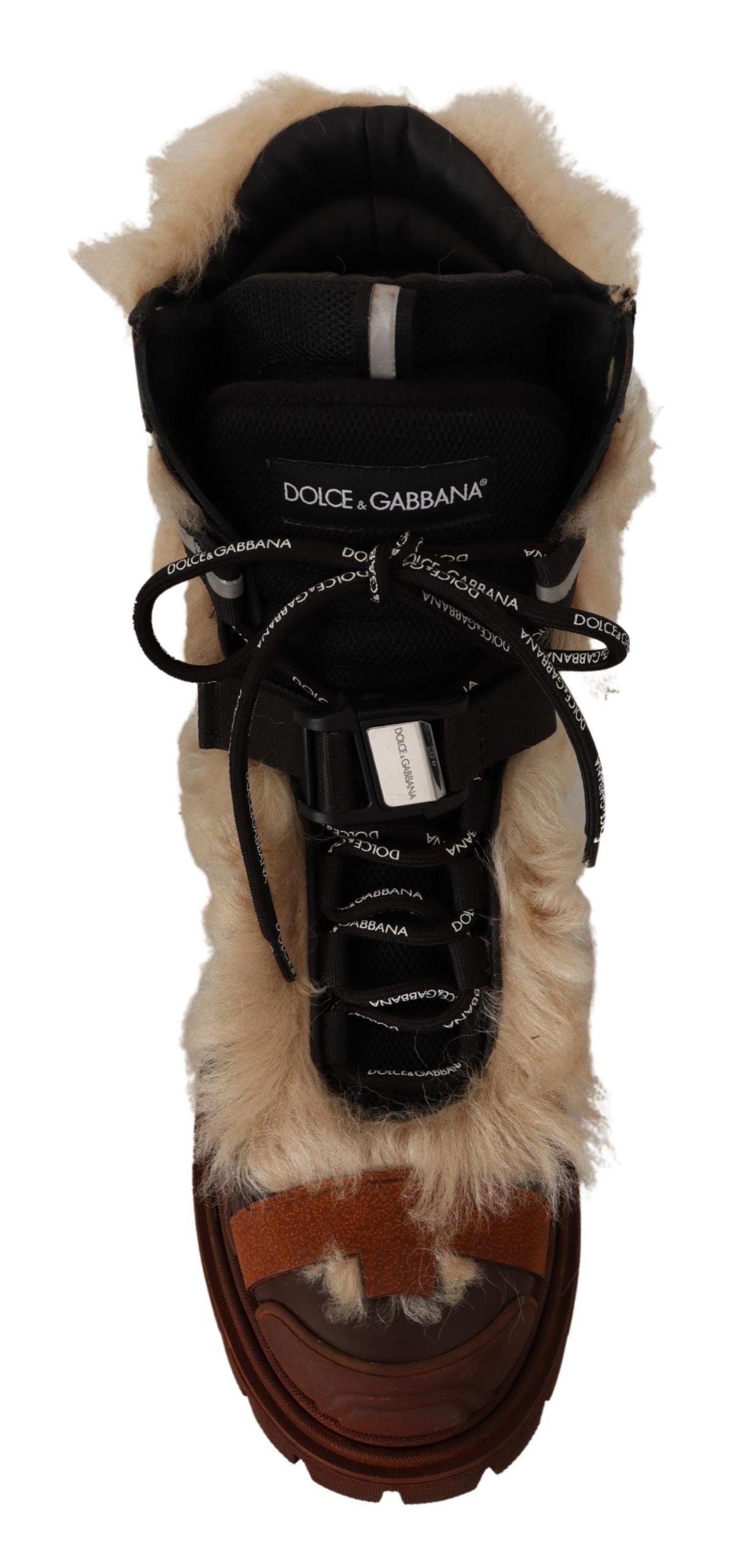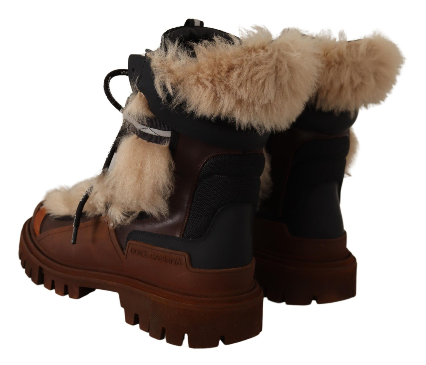 Step into luxury with these impeccably crafted Dolce & Gabbana winter snow boots. Designed for the discerning gentleman, these boots blend functionality with high fashion. Boasting a rich brown hue complemented by beige and black accents, they promise to elevate your cold-weather ensemble. The artisanal quality shines through in the selection of premium shearling, supple leather, and durable rubber materials, creating a boot that’s as stylish as it is sturdy. Perfect for those snowy days, these boots feature a supportive rubber outsole, lace-up front, and secure buckle closure, all adorned with the iconic logo details synonymous with luxury. Proudly made in Italy, these boots are a testament to exquisite craftsmanship and unparalleled style.