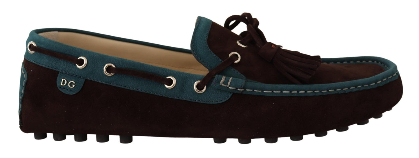 Indulge in the epitome of Italian craftsmanship with these luxurious loafers from Dolce & Gabbana. Designed to elevate your style, these loafers boast an elegant almond toe and a convenient lace-up front fastening for a personalized fit. The branded insole signifies the uniqueness of the brand, while the slip-on style ensures easy wearability. In shades of sophisticated brown and subtle blue, these shoes are the perfect addition to your footwear collection, complete with a durable rubber sole for longevity. Embrace the fusion of comfort and high fashion with these exquisite loafers, a true testament to superb quality and exclusive design.