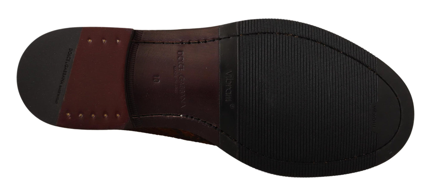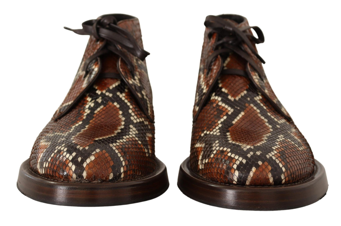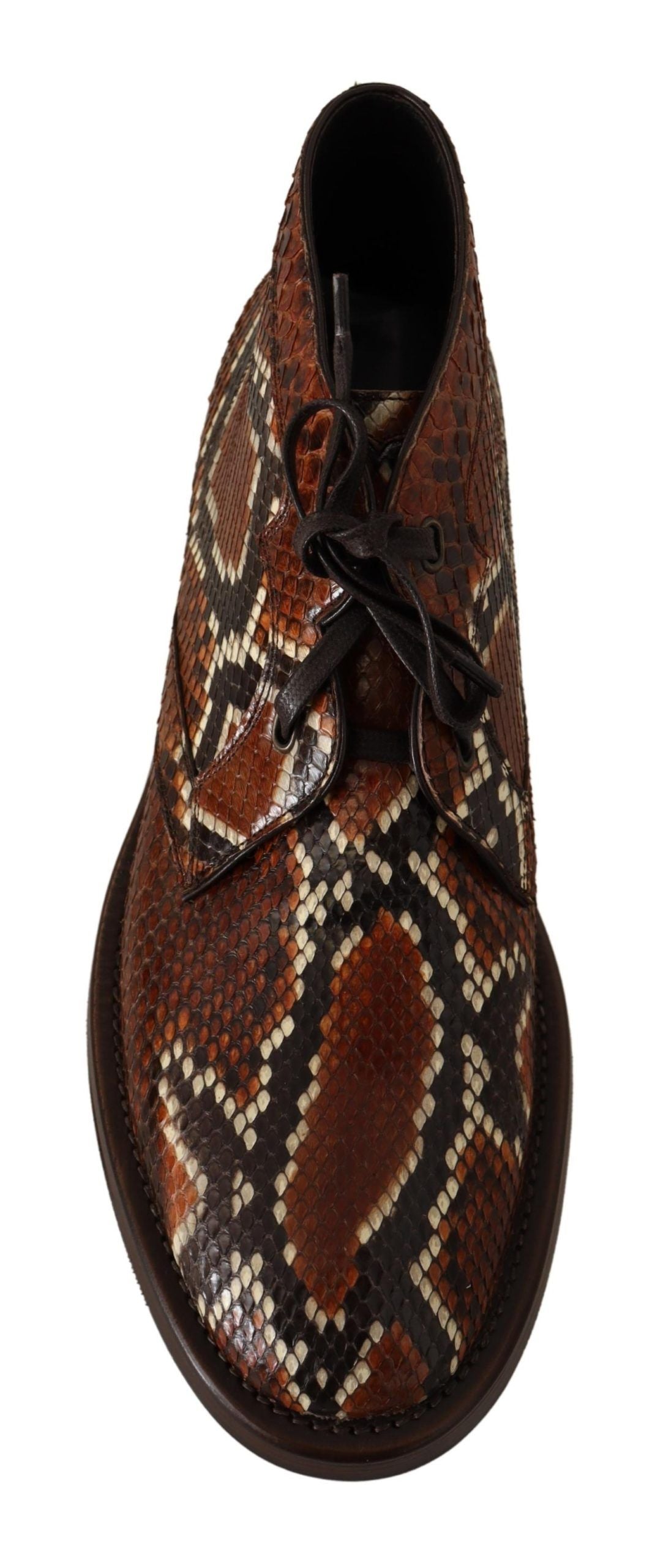 Step into luxury with these stunning new, tag-attached ankle boots by the renowned Dolce & Gabbana. Crafted from the finest 100% exotic python leather, these boots epitomize high-end style and craftsmanship. The rich brown hue adds a touch of timeless elegance, while the durable rubber sole ensures you’ll walk in comfort and confidence. Each detail, including the discrete logo, is a testament to the brand’s commitment to luxury and quality. These Italian-made boots are a statement of sophistication for the discerning gentleman.