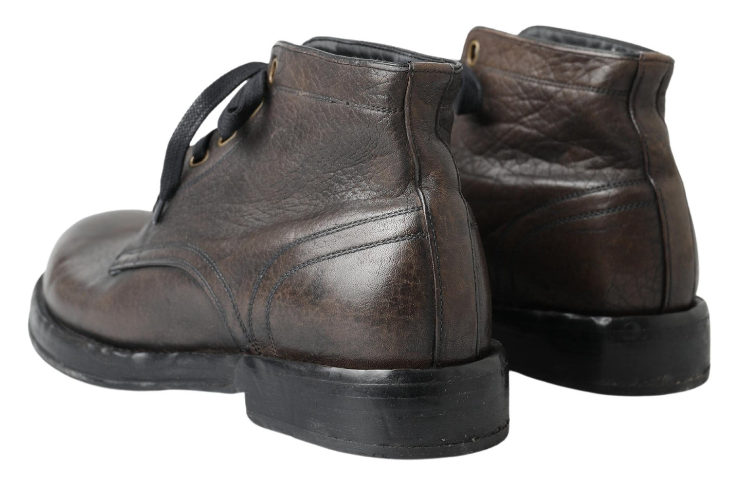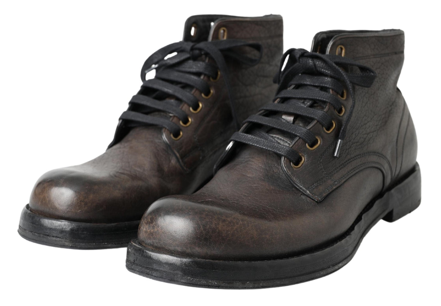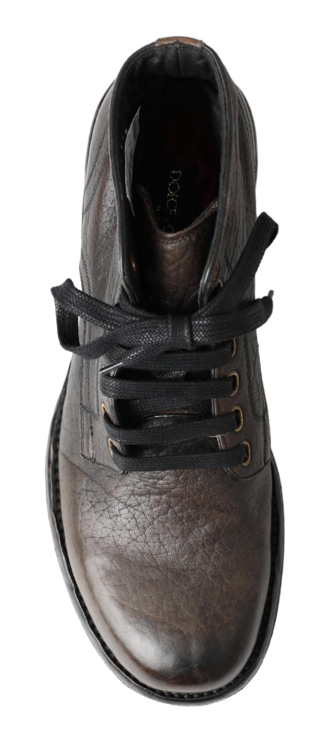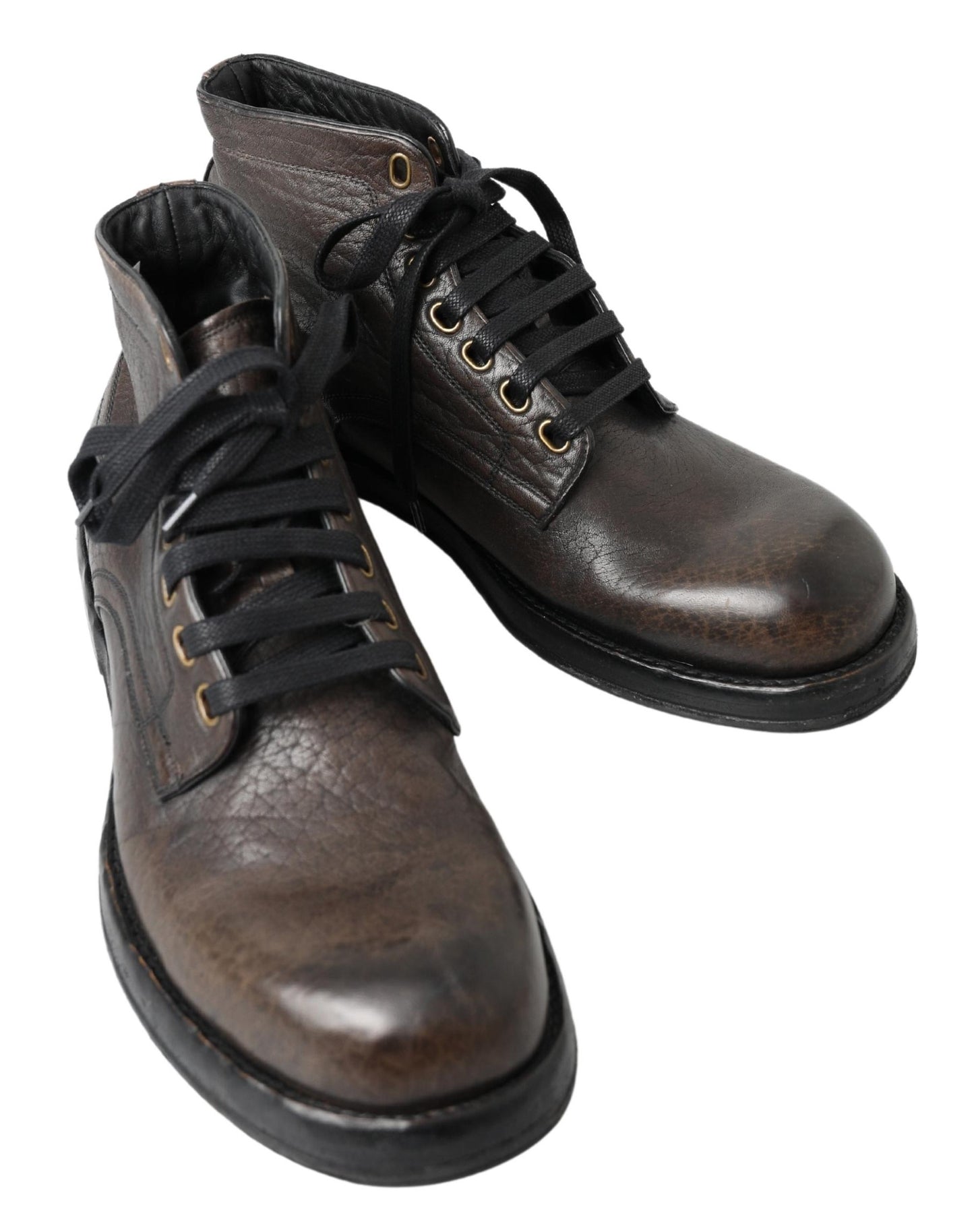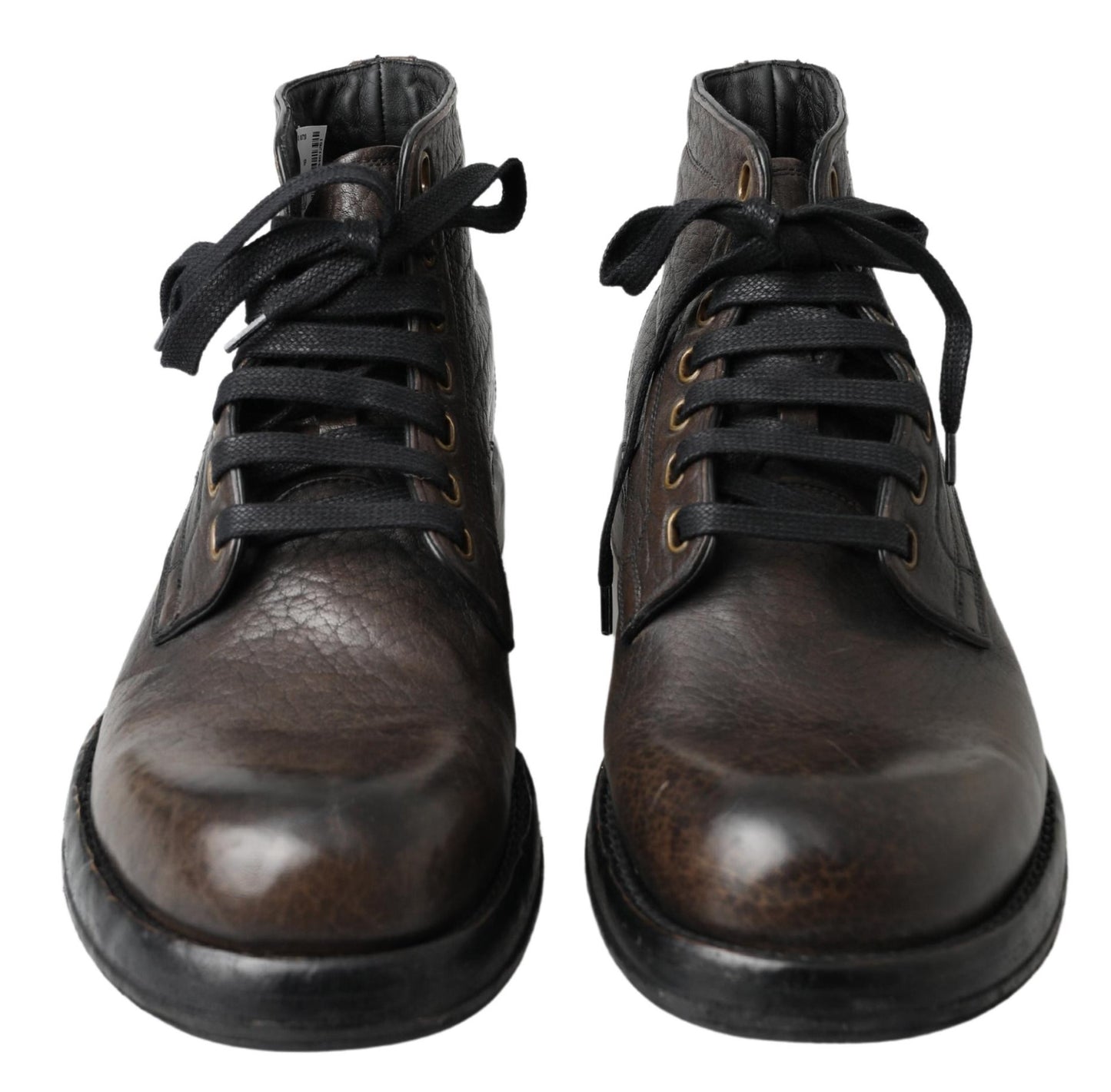 Step into luxury with these gorgeous, brand new lace-up boots that boast the quality and style expected from Dolce & Gabbana. Meticulously crafted in Italy, these boots are made from 100% leather, ensuring both comfort and durability. The sophisticated brown hue complements any outfit, making these shoes a versatile addition to your wardrobe. With detailed logo accents and a sturdy rubber outsole, these boots are the epitome of high craftsmanship and exclusive design, perfect for those who appreciate the finer things in life.