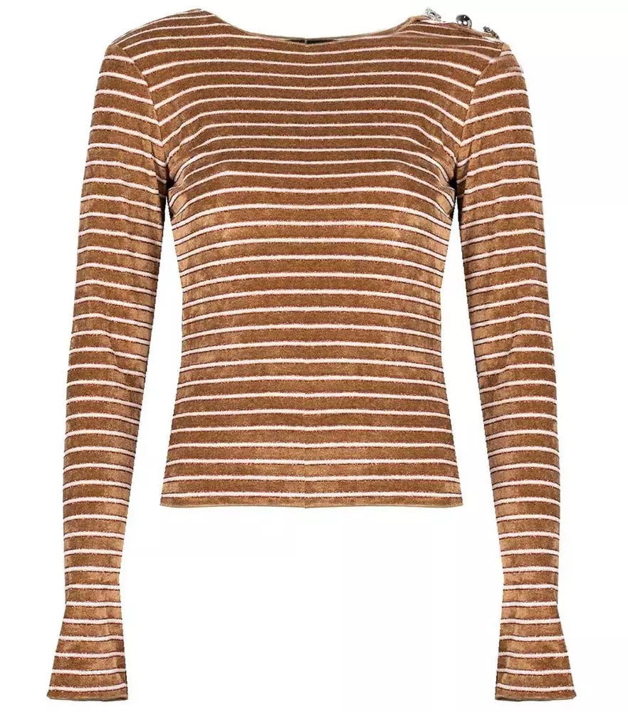 Exude effortless class with this delicately crafted striped jersey sweater. The perfect blend of cozy and chic, it features a classic crew neck and sophisticated button accents on the shoulder. Its elasticated texture provides a comfortable, flattering fit for an elevated everyday look.