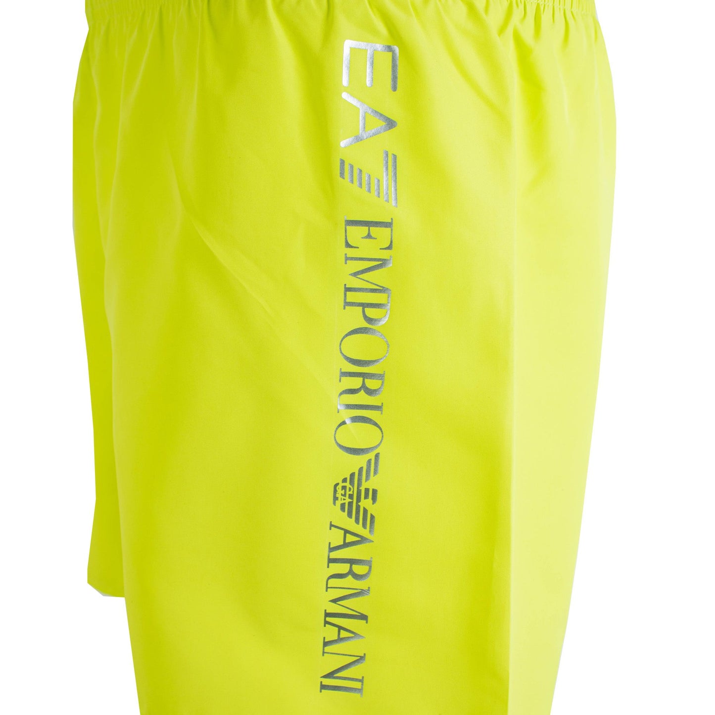 Step into summer with flair with these vibrant fluo yellow swim shorts by Emporio Armani. Perfect for those poolside days or beach adventures, these shorts are not only eye-catching but also offer utmost comfort and practicality. With an elastic waistband and adjustable drawstring, they ensure a perfect fit, while the convenient back pocket with Velcro closure adds functionality. The internal mesh briefs provide added support, and the contrasting silver logo print on the side infuses a touch of luxury style into your swimwear collection.