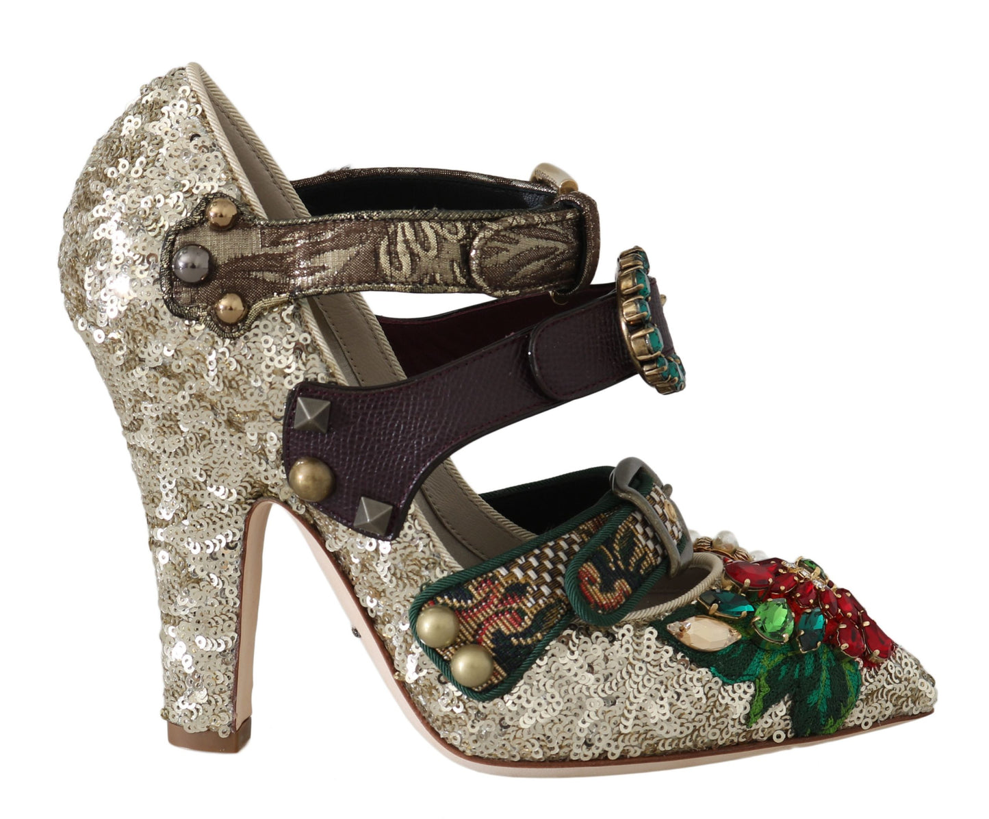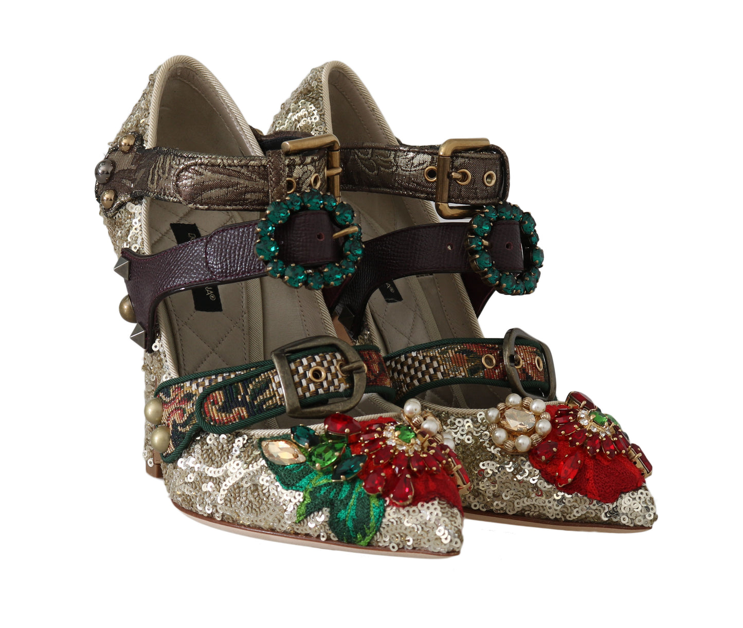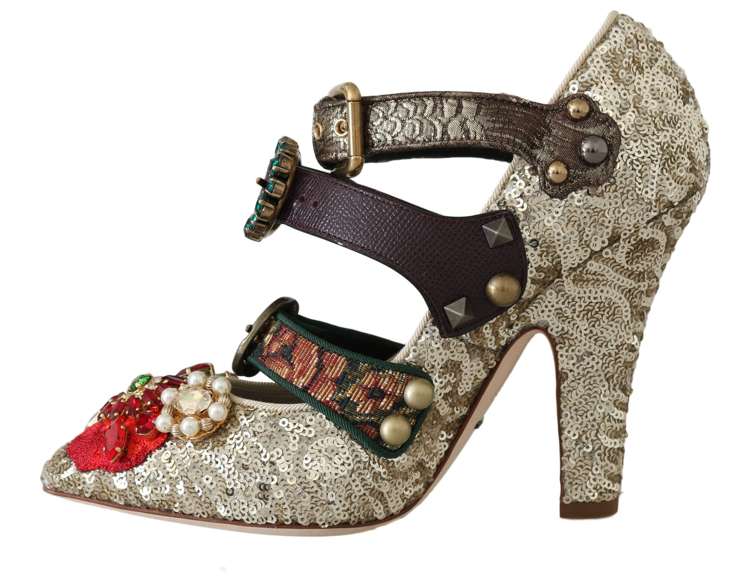 Step into luxury with these stunning Dolce & Gabbana Mary Janes, Bellucci Alta Moda heels. Adorned with metal studs, pearls, and crystals, alongside a woven flower applique, these shoes embody the exquisite craftsmanship and elegant style that the brand is renowned for. Perfect for adding a touch of glamour to any ensemble, they promise both high quality and comfort. Authentically made in Italy, these heels will elevate your wardrobe to new heights.