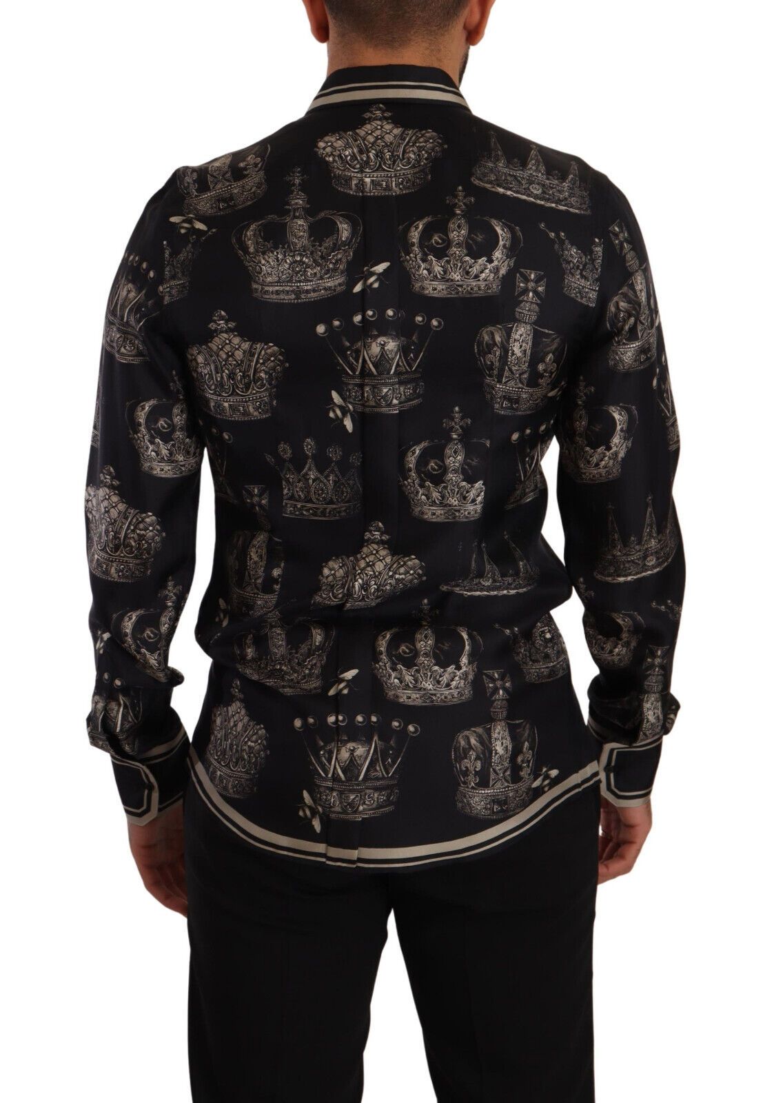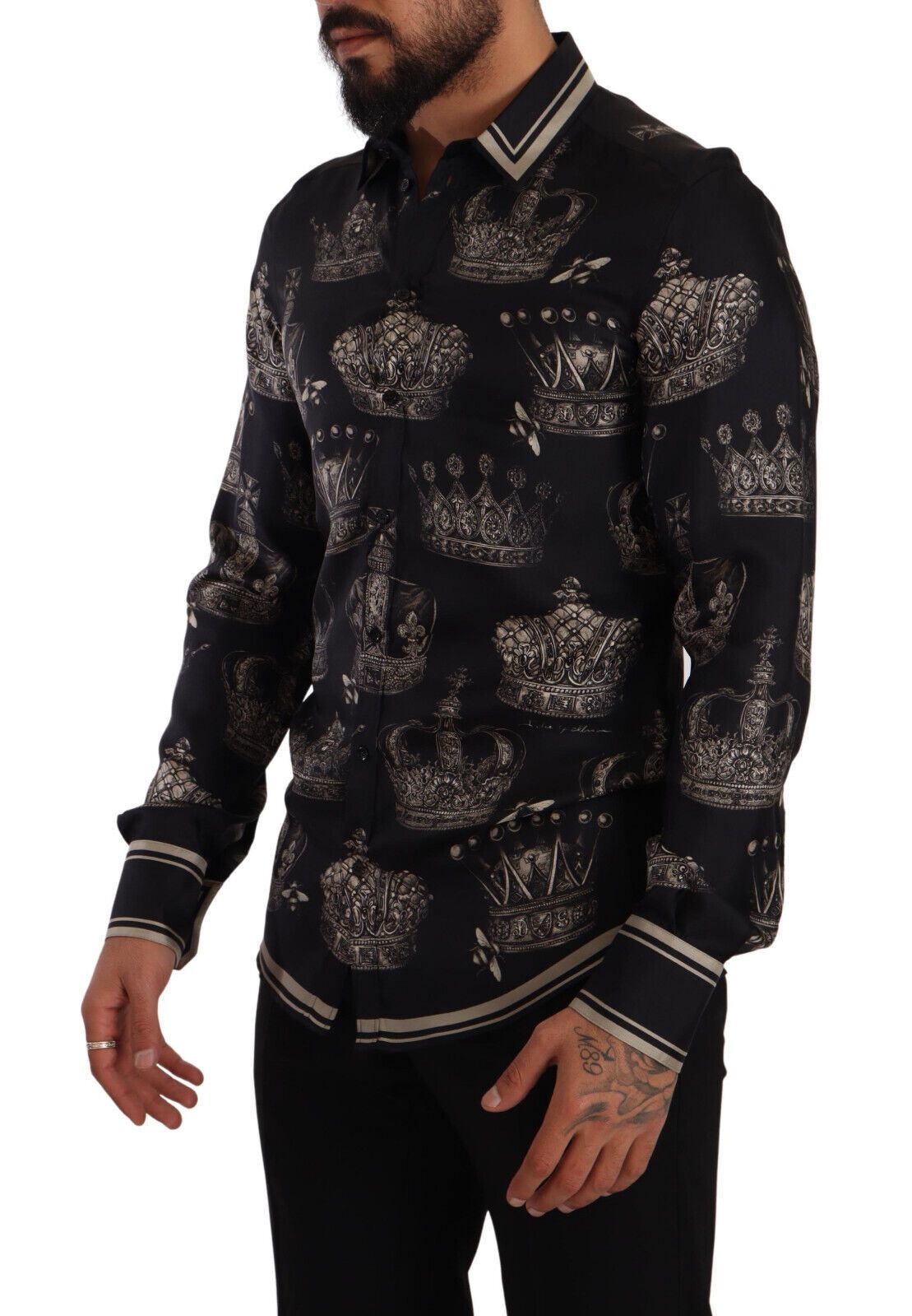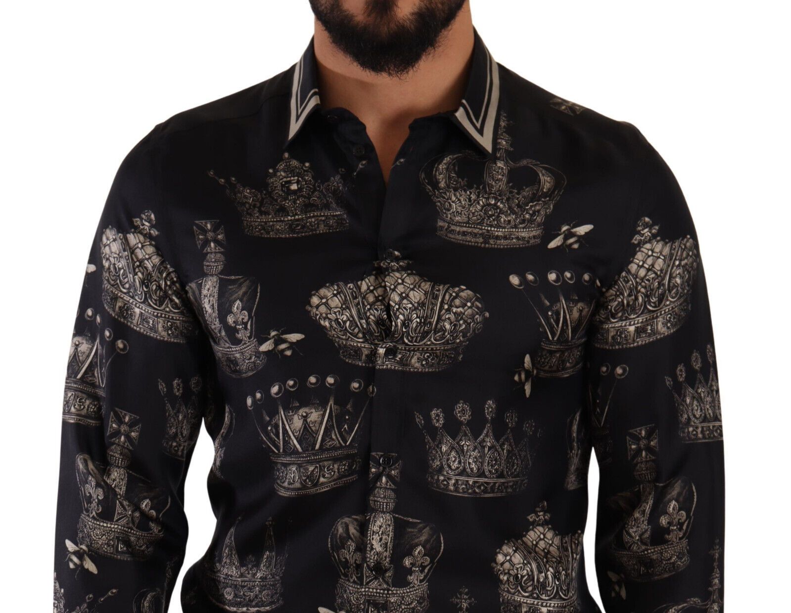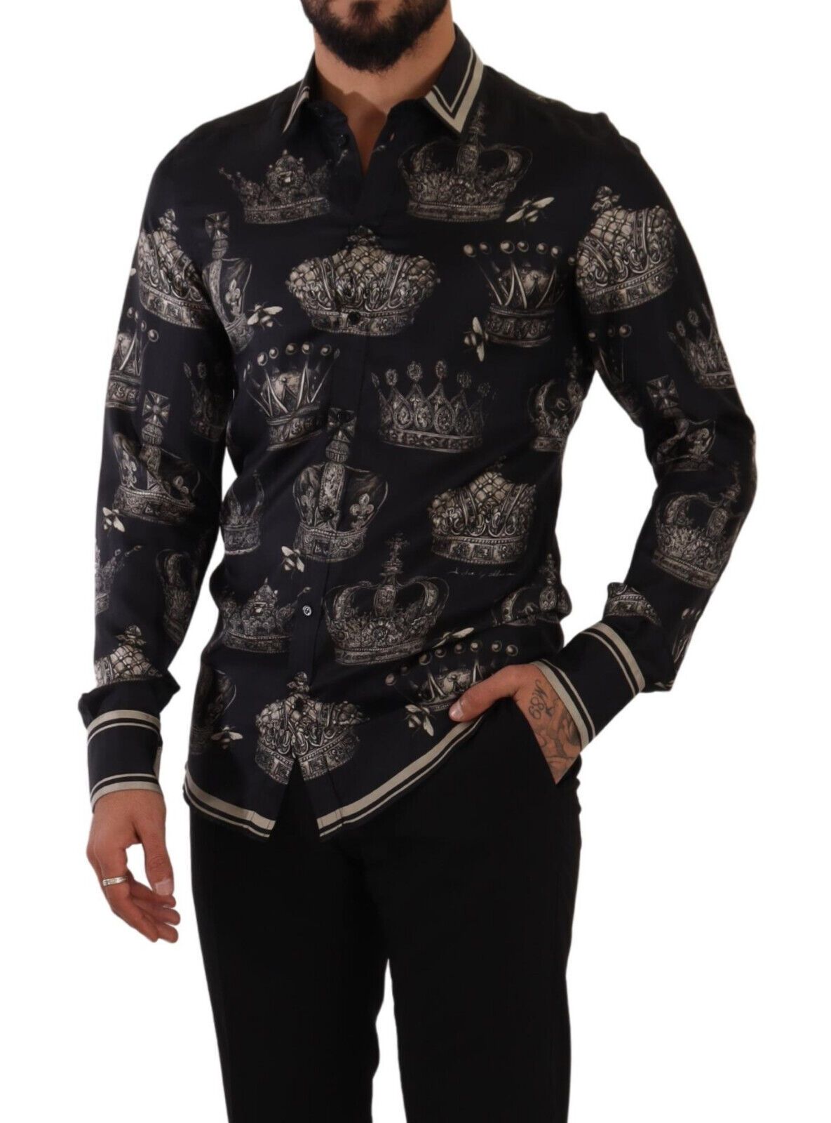Discover the essence of sophistication and luxury with our stunning slim fit shirt. Expertly crafted from 100% pure silk, this black shirt boasts a regal crown print, embodying the distinctive style of Dolce & Gabbana. Made in Italy, it features full front button closure and exquisite logo details, tailored to exude elegance for any occasion.
