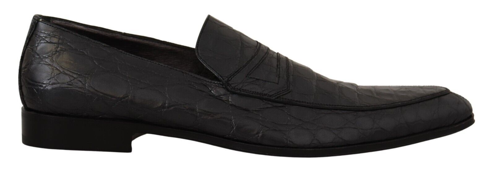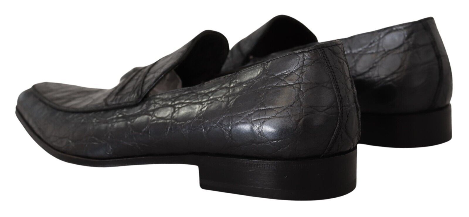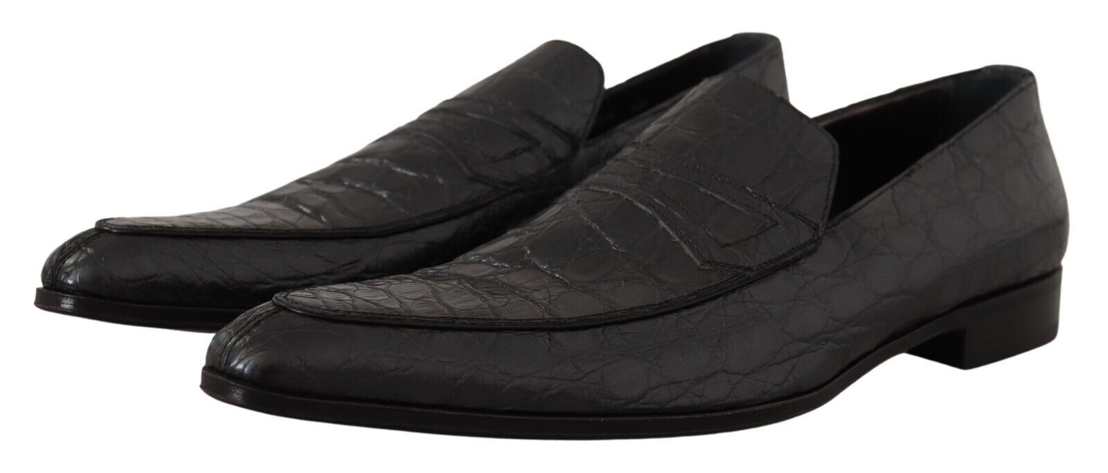 Step into luxury with these 100% Authentic, exquisite Dolce & Gabbana crocodile skin leather loafers. Their sleek design and the sumptuous touch of caiman leather will elevate your formal footwear collection. The blend of gray and black hues creates a sophisticated palette that complements any high-end ensemble. Crafted meticulously in Italy, these loafers are more than just shoes; they are a testament to the wearer’s impeccable taste and stand as a hallmark of true craftsmanship with the iconic Dolce & Gabbana logo details and a premium leather sole.