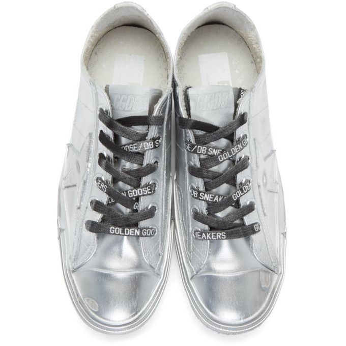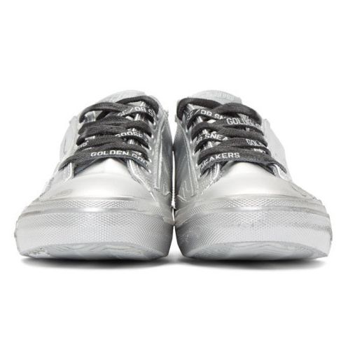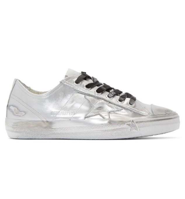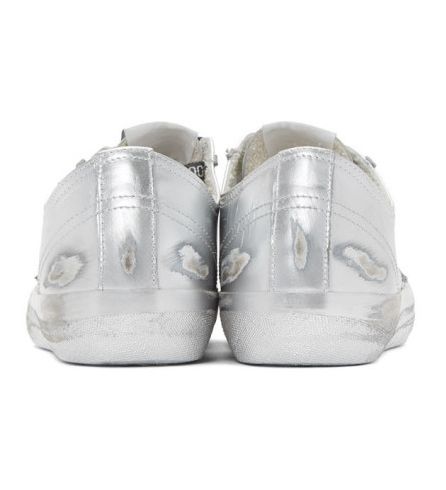 Step into a blend of luxury and street style with these metallic silver leather sneakers. Their purposeful fading and distressing give them a unique, well-loved look right out of the box. The round-toe design coupled with a bold black lace-up front that features a white logo pattern offers a classic touch to this edgy footwear. Crafted in Italy, these sneakers promise both high-end quality and cutting-edge fashion.