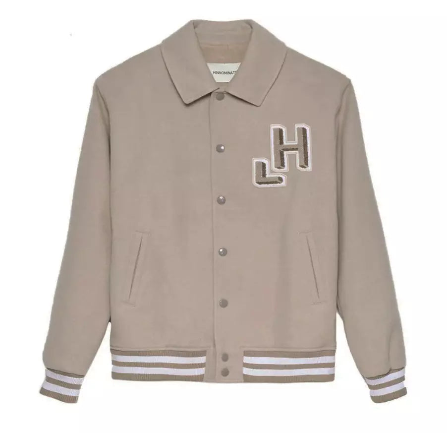 Step into effortless style with this Collegiate Bomber Jacket in a sumptuous hazelnut beige hue. Its casual yet polished design features a convenient button closure and a striking embossed logo accent on the back, perfect for elevating your everyday wear. Crafted with a blend of materials for a comfortable, figure-flattering fit, this jacket embodies a blend of sophistication and sporty flair, making it an impeccable addition to your wardrobe. Made in Italy, it reflects exceptional craftsmanship and design finesse.