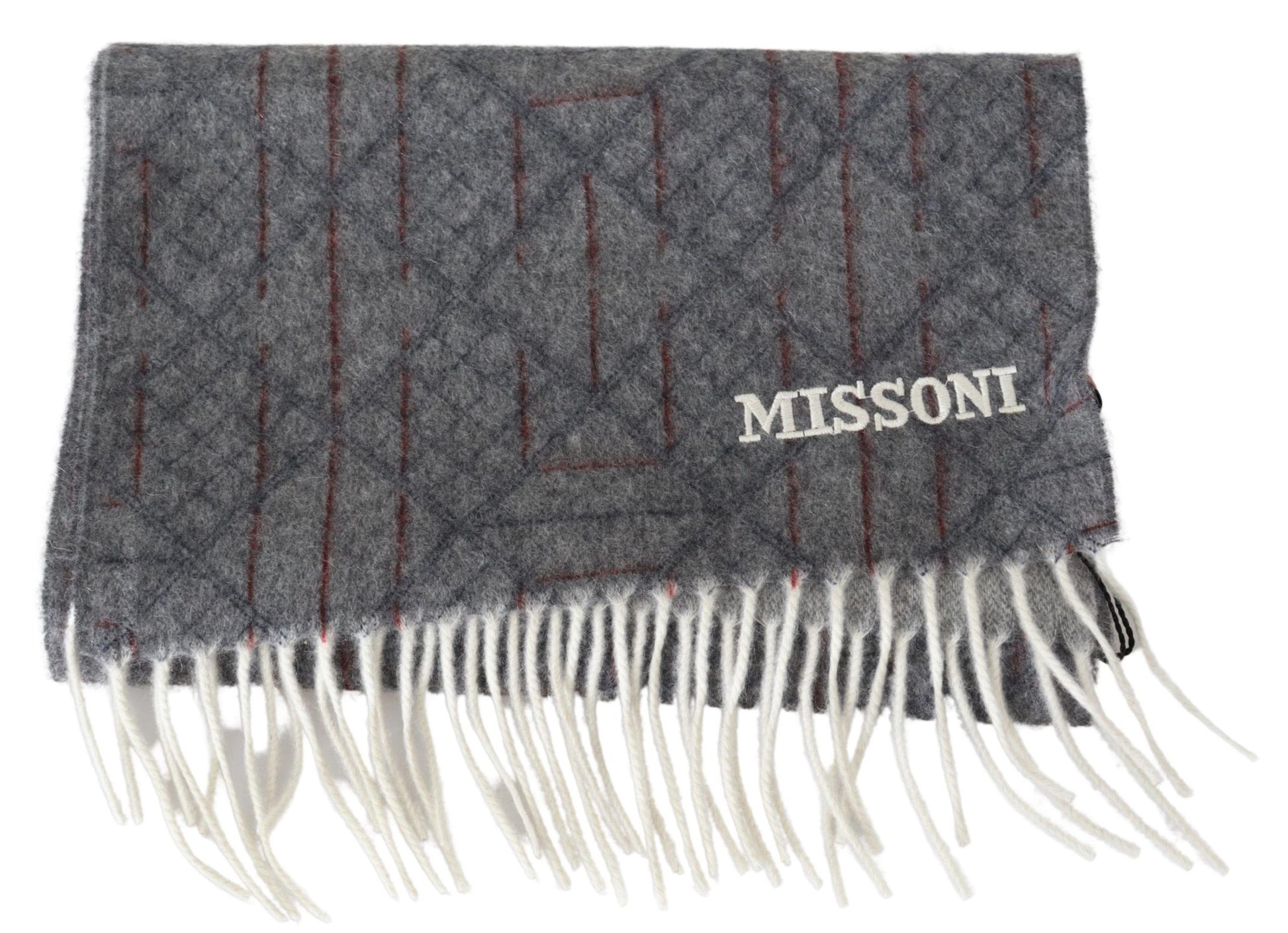 Discover the epitome of luxury wrapped in the warmth of Missoni. This exquisite gray cashmere scarf is a statement of sophistication, featuring an intricate pattern design and delicate brand logo embroidery. Perfect for unisex wear, it not only serves as a cozy accessory but also a touch of elegance to any ensemble.