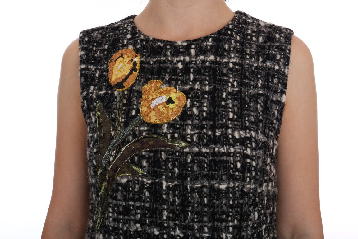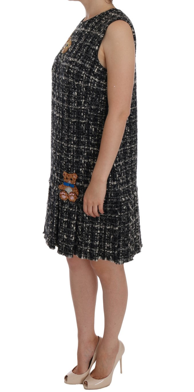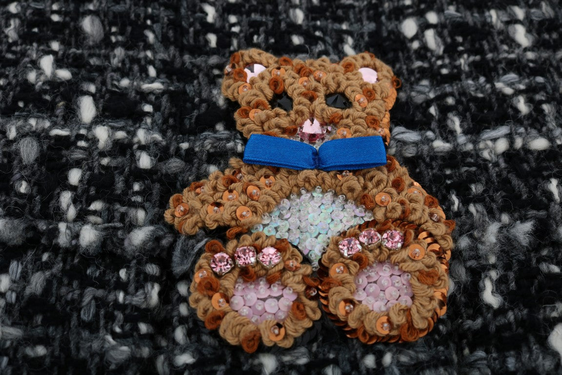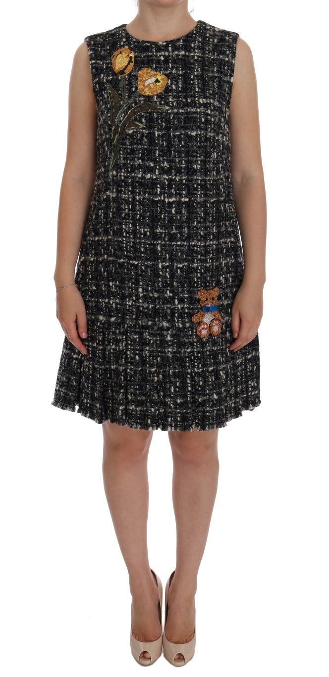 Step into a world of luxury with this Dolce & Gabbana gray shift dress. Boasting a refined design with intricate teddy bear and floral embroidery, this piece is perfect for those who appreciate the true craftsmanship of high fashion. The pink crystals add a touch of glamour, while the full zipper closure ensures a seamless fit. Experience the comfort of the black silk stretch inner lining and take pride in wearing a garment made with the utmost care in Italy.