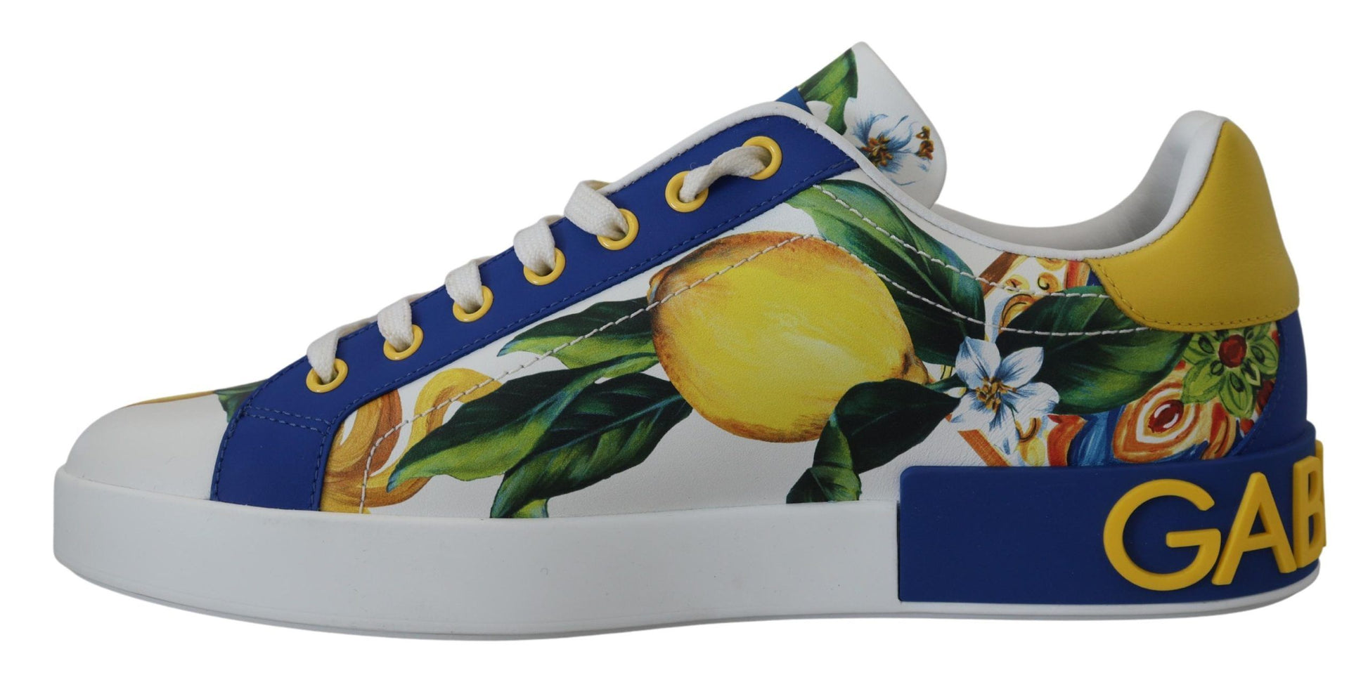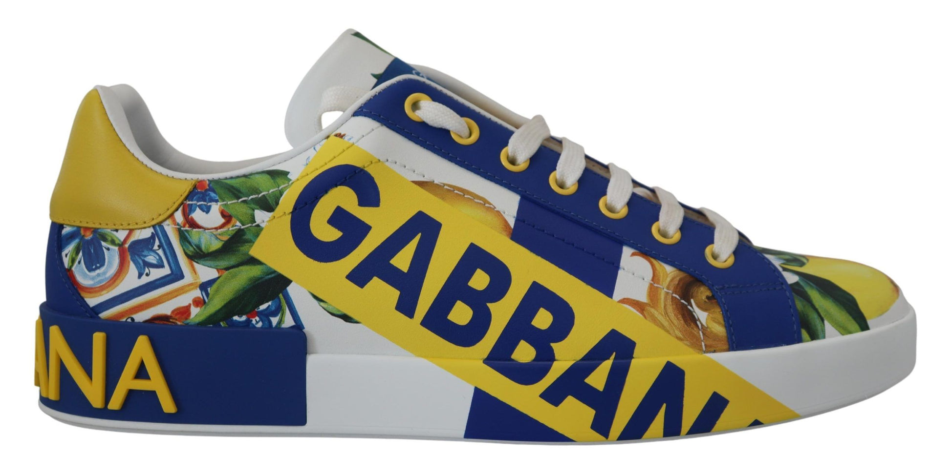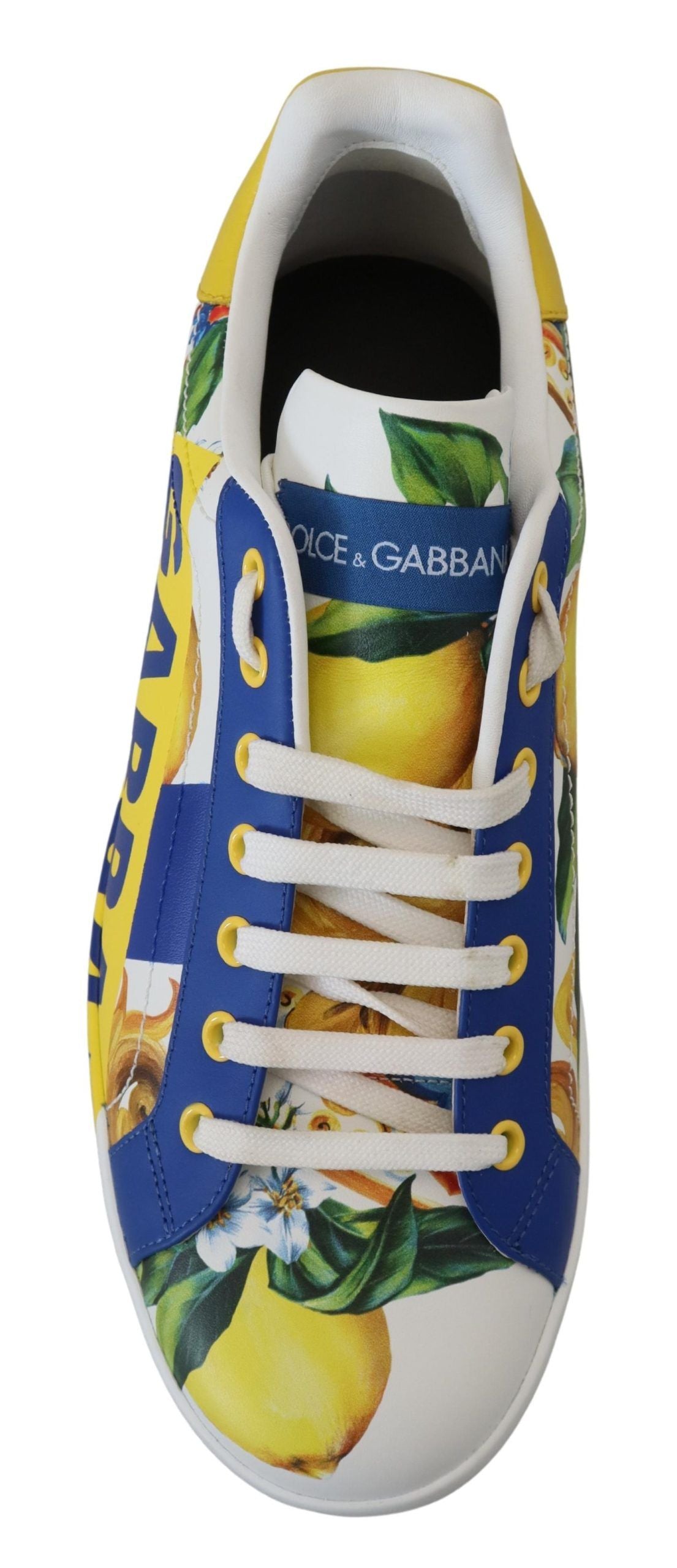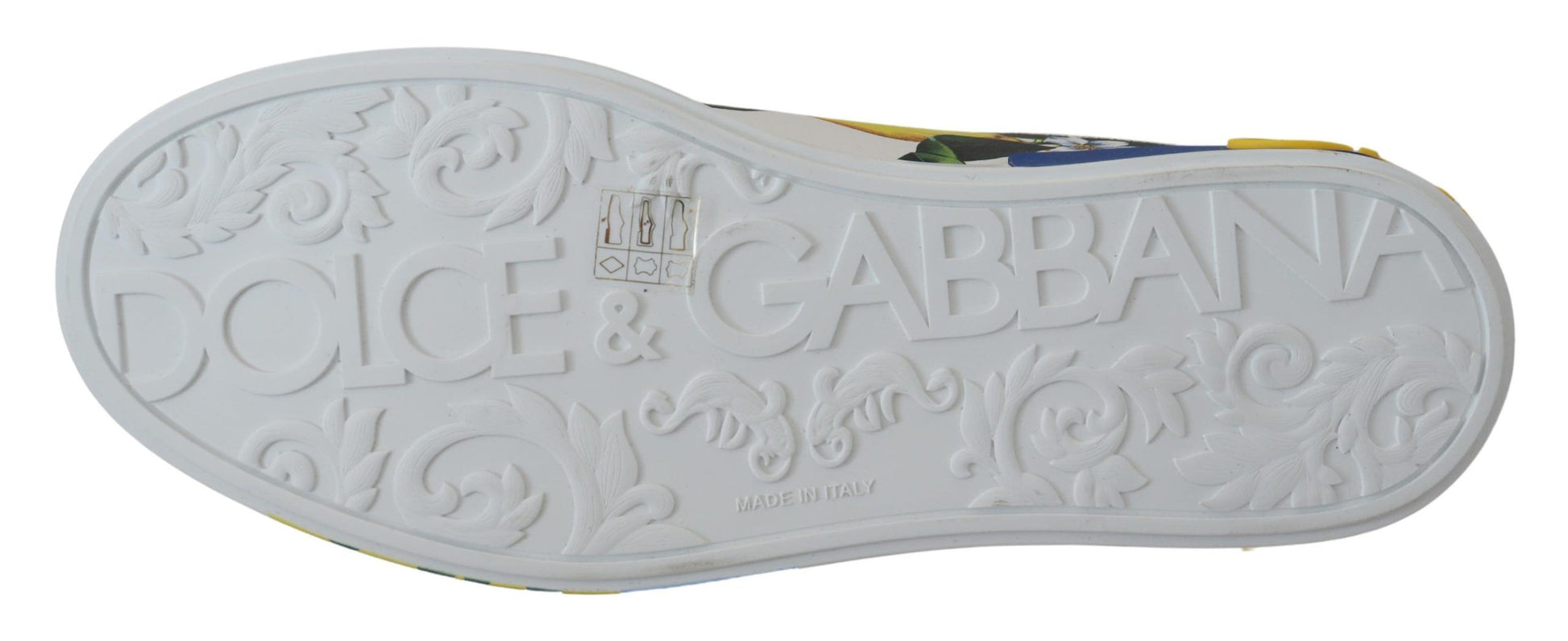 Step into luxury with our exquisite Multicolor Leather Low Top Sneakers from the prestigious Dolce & Gabbana. These brand new, tagged sneakers epitomize sophisticated style combined with comfort. The sleek white leather is adorned with a vibrant lemon print, perfect for adding a splash of Italian flair to your footwear collection. Expertly crafted with a durable rubber sole and featuring the iconic logo, these shoes are the essence of high-end fashion made in Italy.