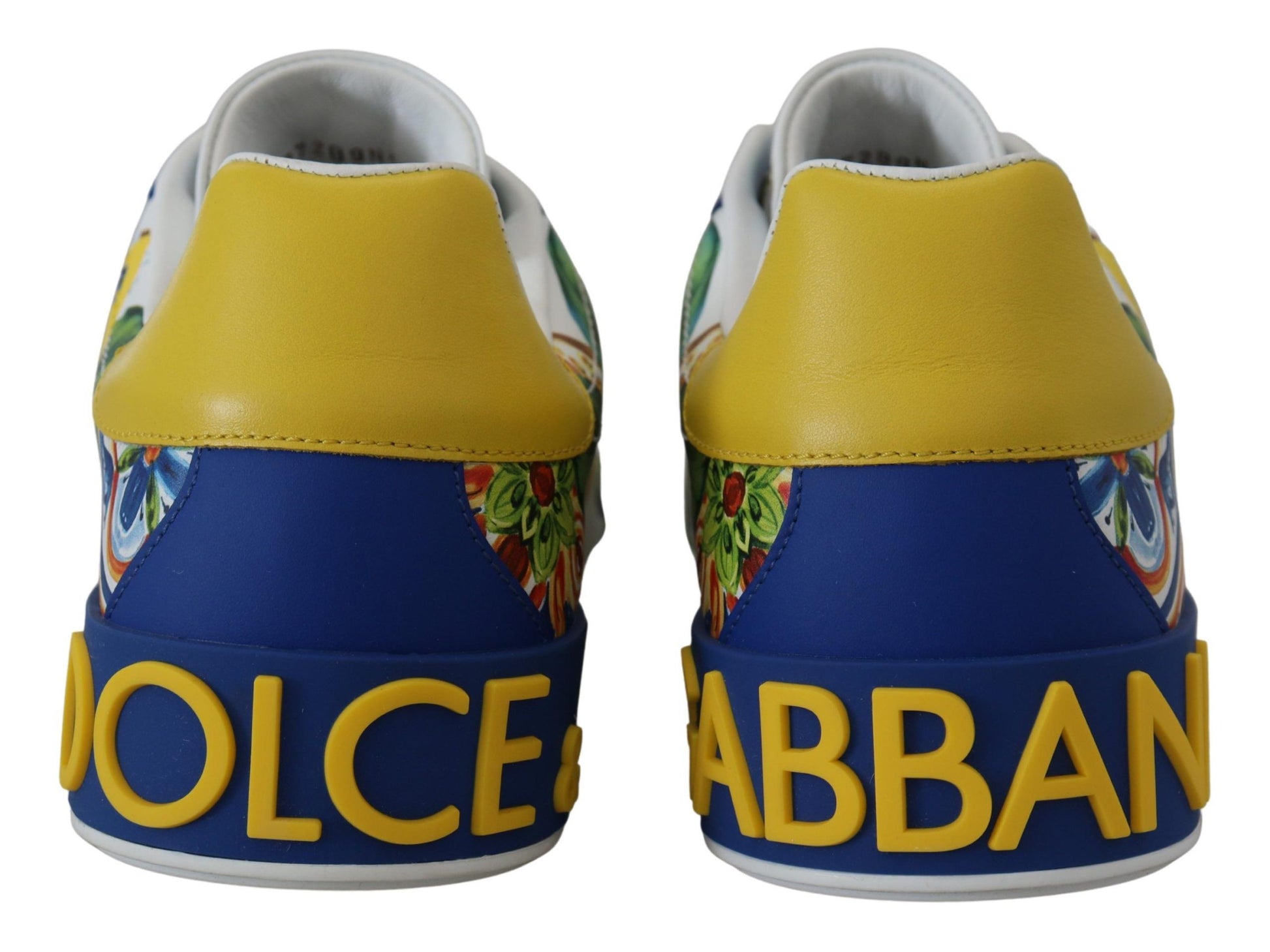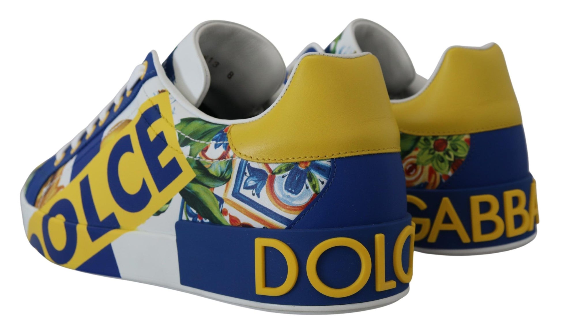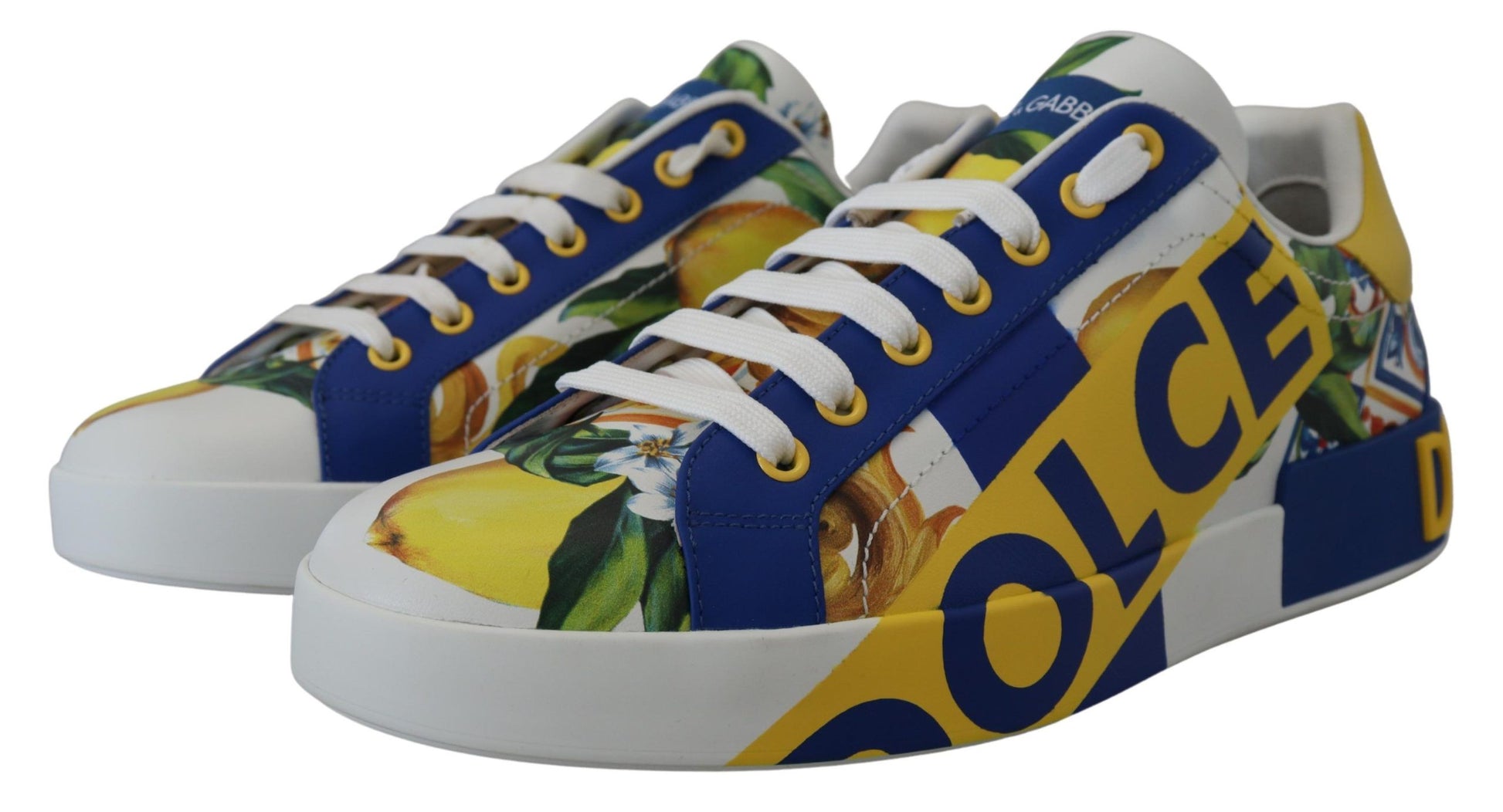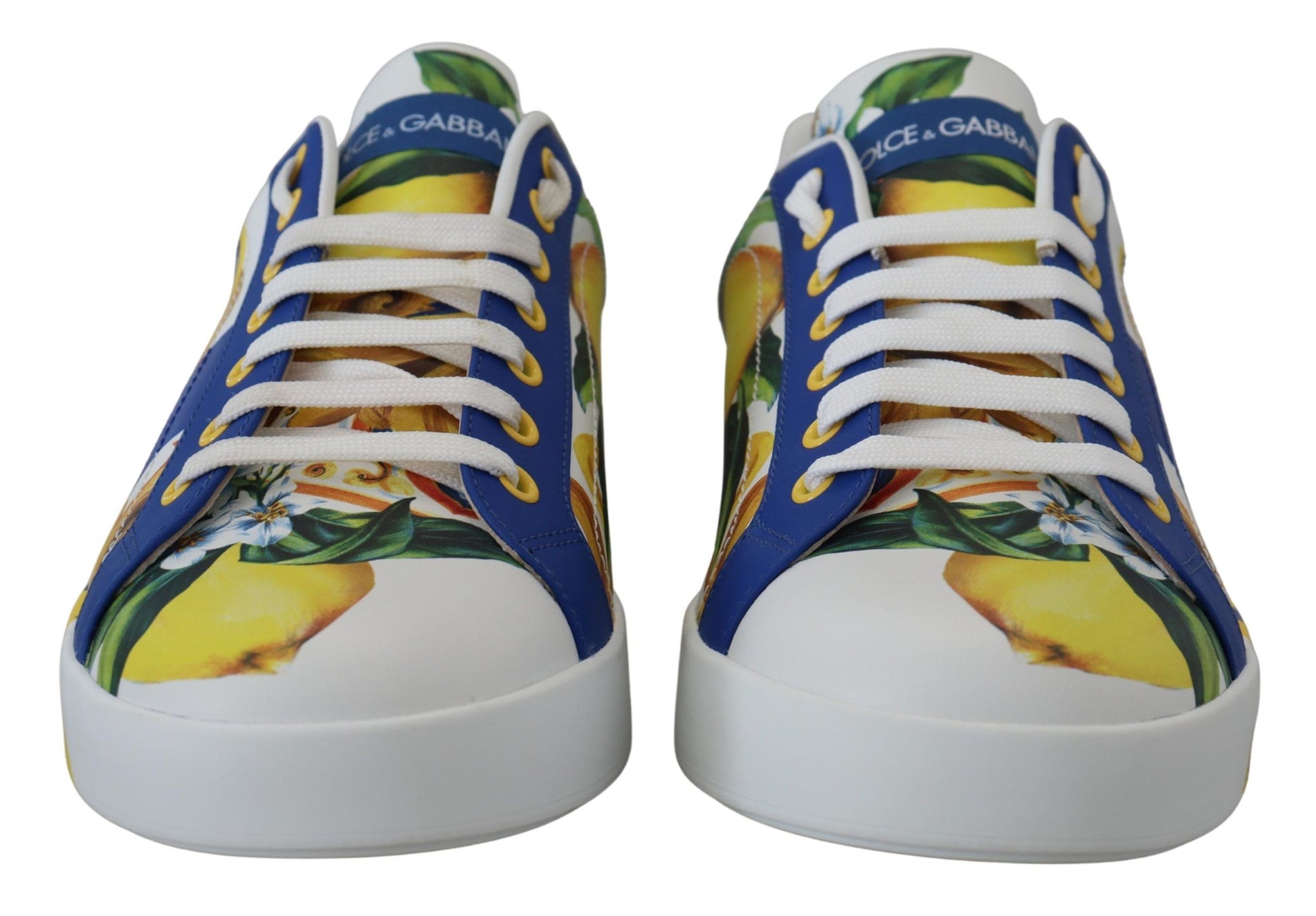 Step into luxury with our exquisite Multicolor Leather Low Top Sneakers from the prestigious Dolce & Gabbana. These brand new, tagged sneakers epitomize sophisticated style combined with comfort. The sleek white leather is adorned with a vibrant lemon print, perfect for adding a splash of Italian flair to your footwear collection. Expertly crafted with a durable rubber sole and featuring the iconic logo, these shoes are the essence of high-end fashion made in Italy.