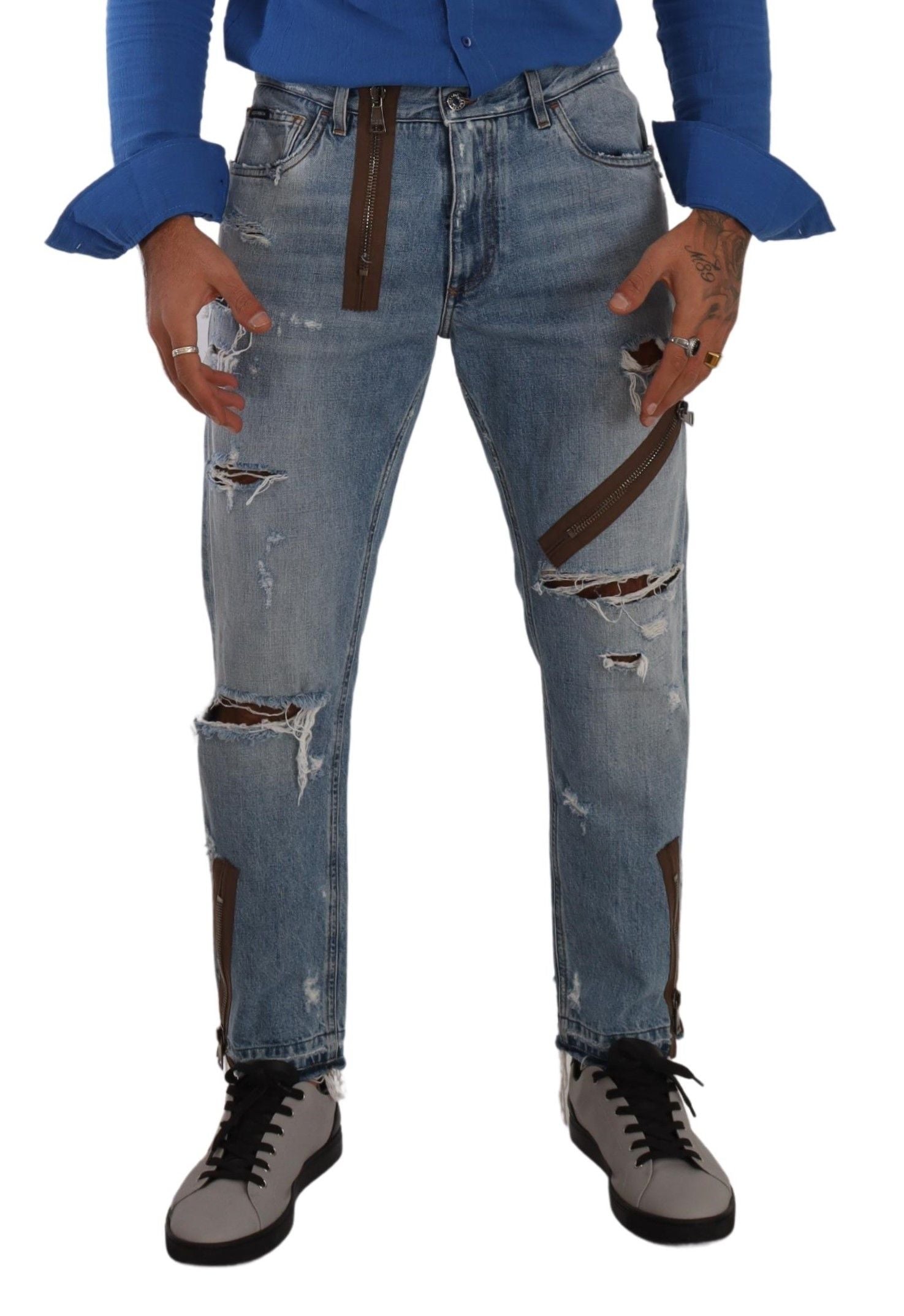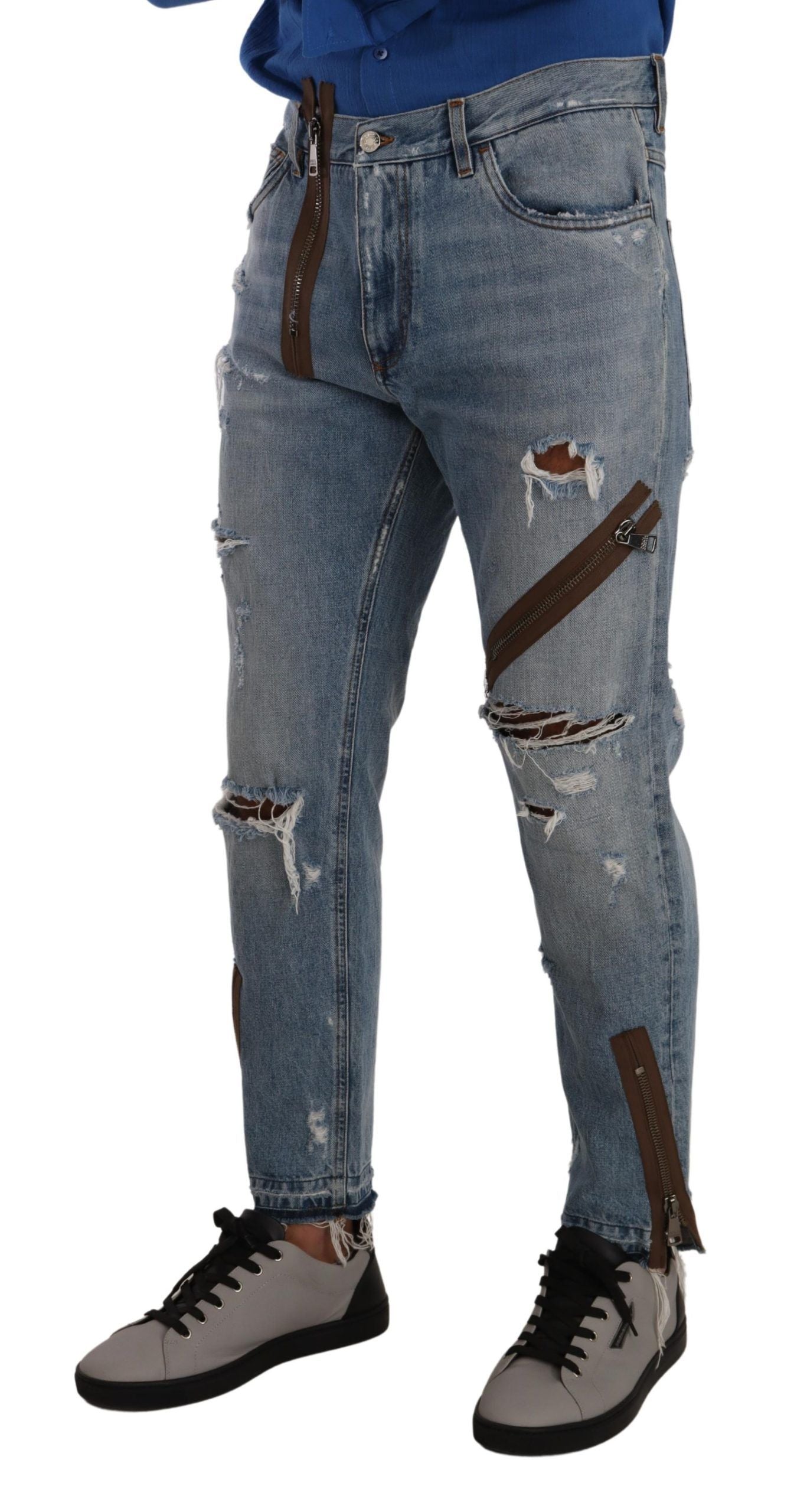 Elevate your denim collection with these stunning, brand new Light Blue Distressed Denim Jeans from the acclaimed Dolce & Gabbana. Woven from the finest 100% cotton, these regular-fit jeans feature unique zipper appliques, offering a modern twist to your classic denim. Ensuring perfect closure with a zip and button, the jeans exude Italian craftsmanship with every detail, including the brand’s signature logo. A must-have addition to any fashion-forward wardrobe, crafted in Italy.