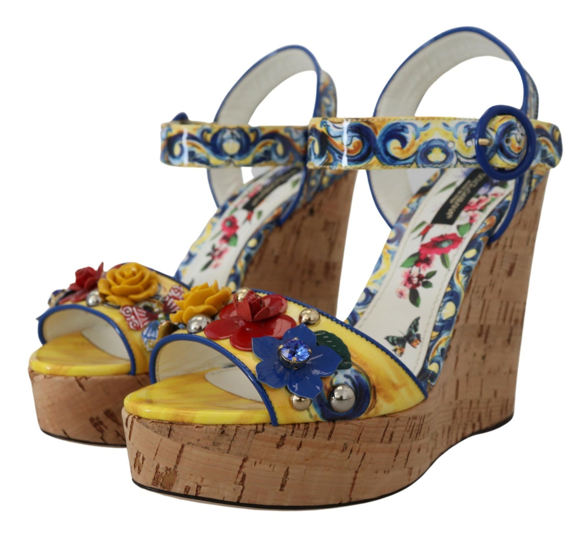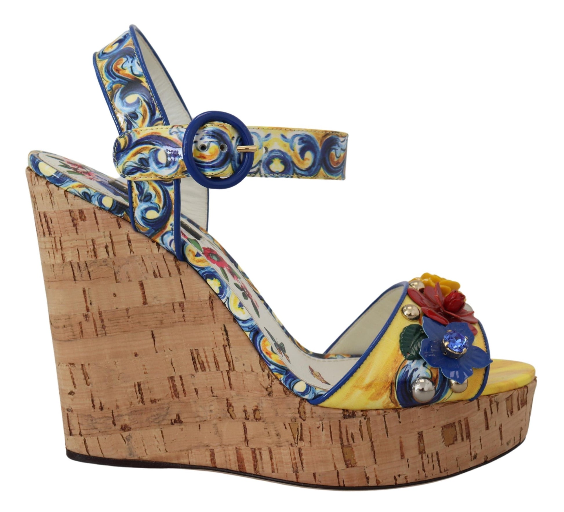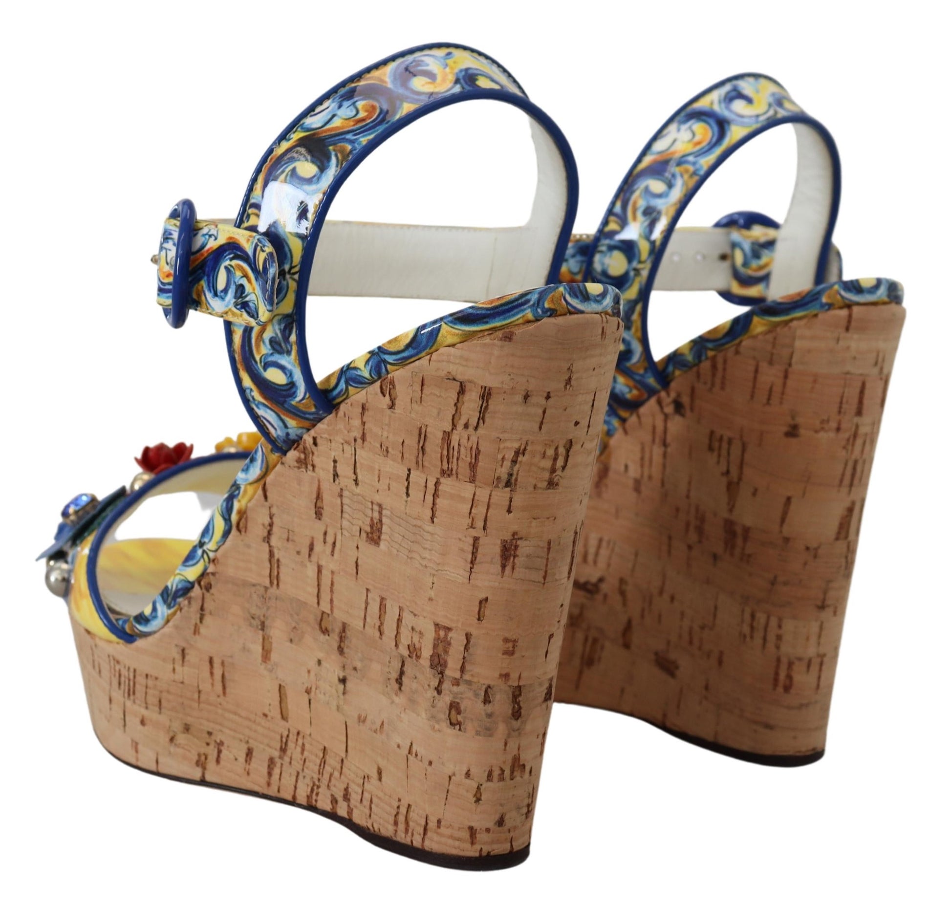 Step into the glamour and sophistication of Dolce & Gabbana with these stunning ankle strap wedges, featuring a vibrant multicolor Majolica print. Embellished with a dazzling array of multicolor crystals, these shoes are the epitome of luxury fashion. Crafted with the highest quality materials, they showcase exquisite Italian craftsmanship. Perfect for adding a touch of elegance to any outfit, these wedges are a must-have for fashion enthusiasts.
